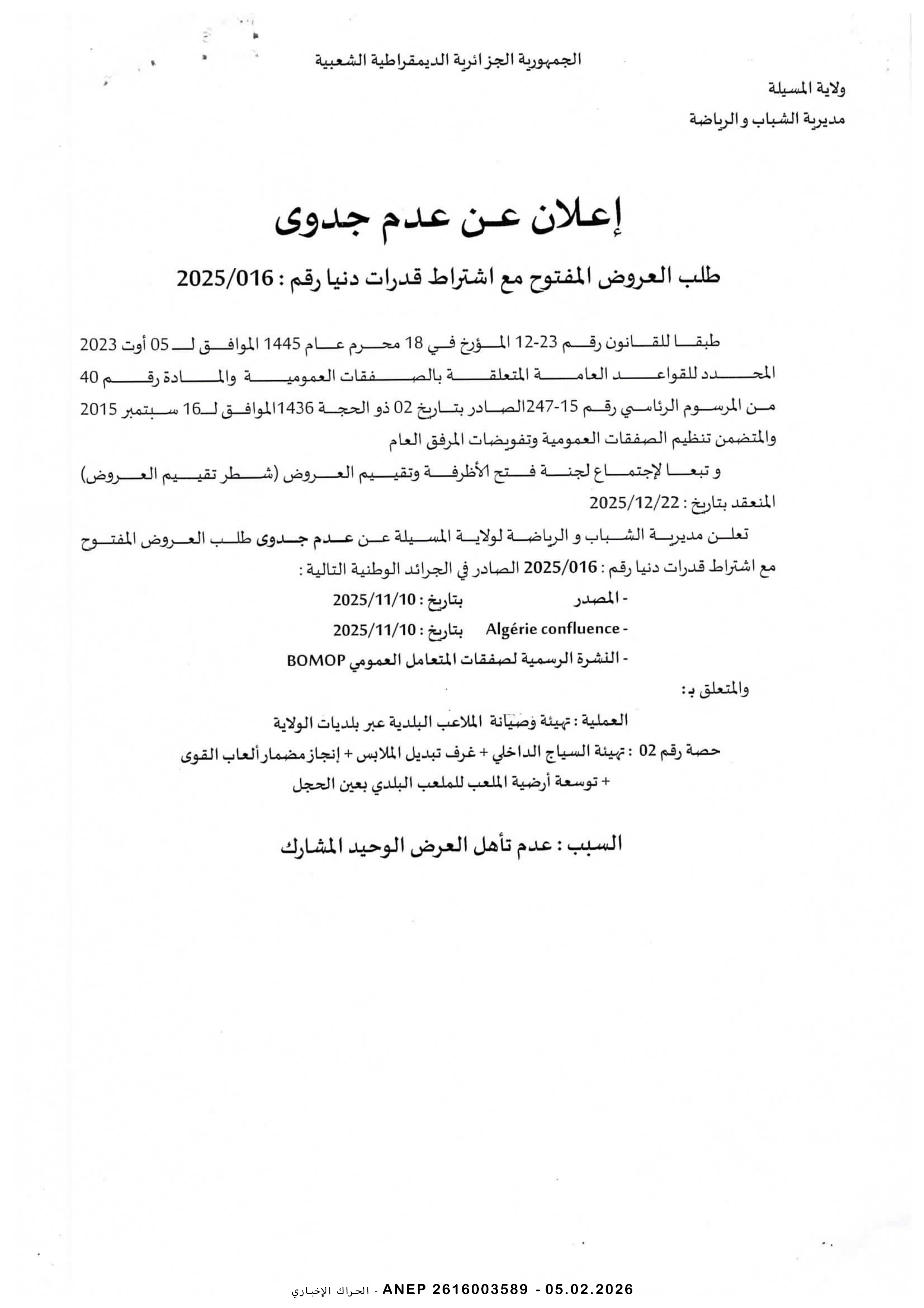 إعلان عن إلغاء مناقصة وطنية محدودة