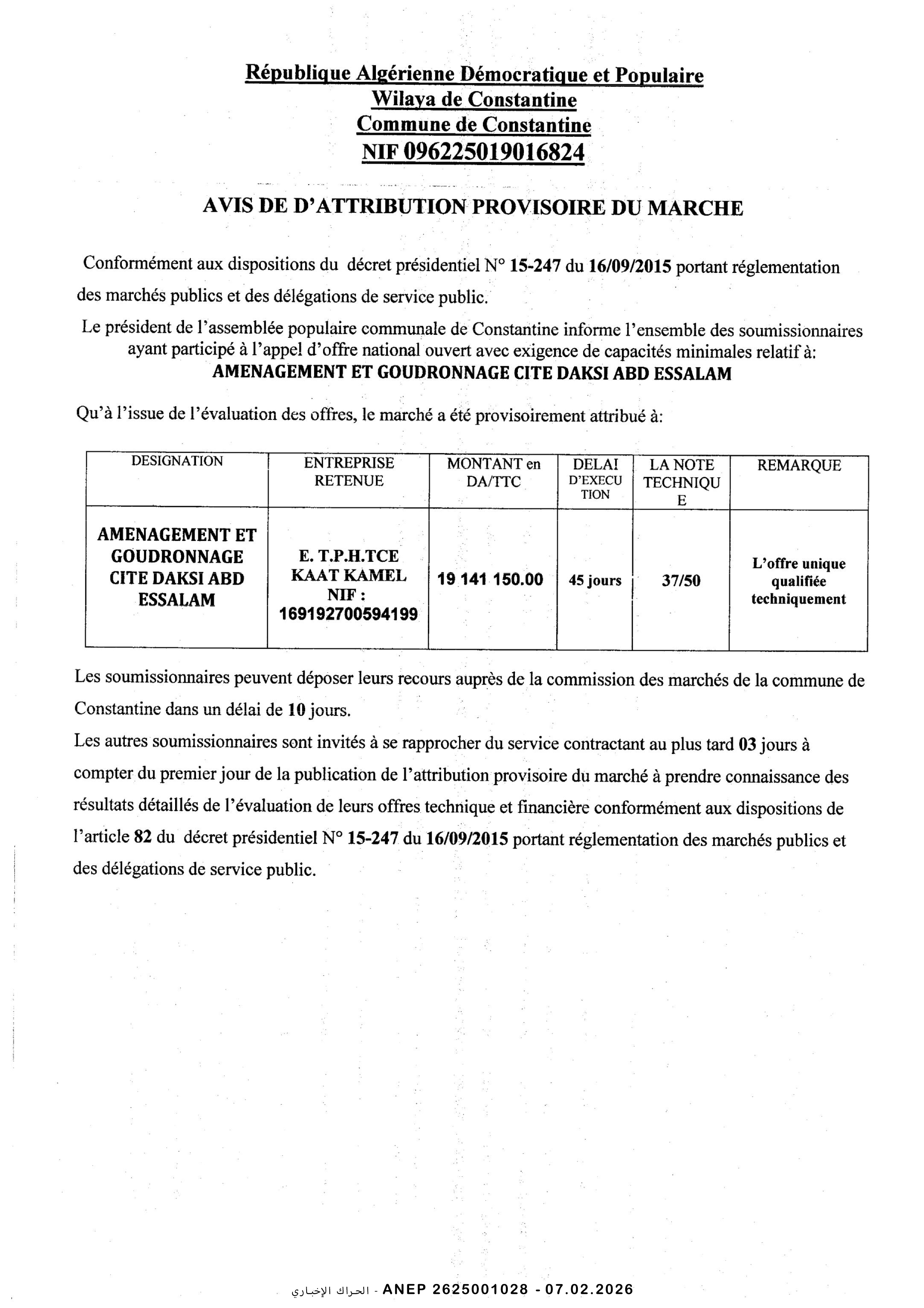 إنجاز 1500 مسكن بيع بالايجار مع محلات و مساكن للبوابين و كل المرافق بلدية قسنطينة