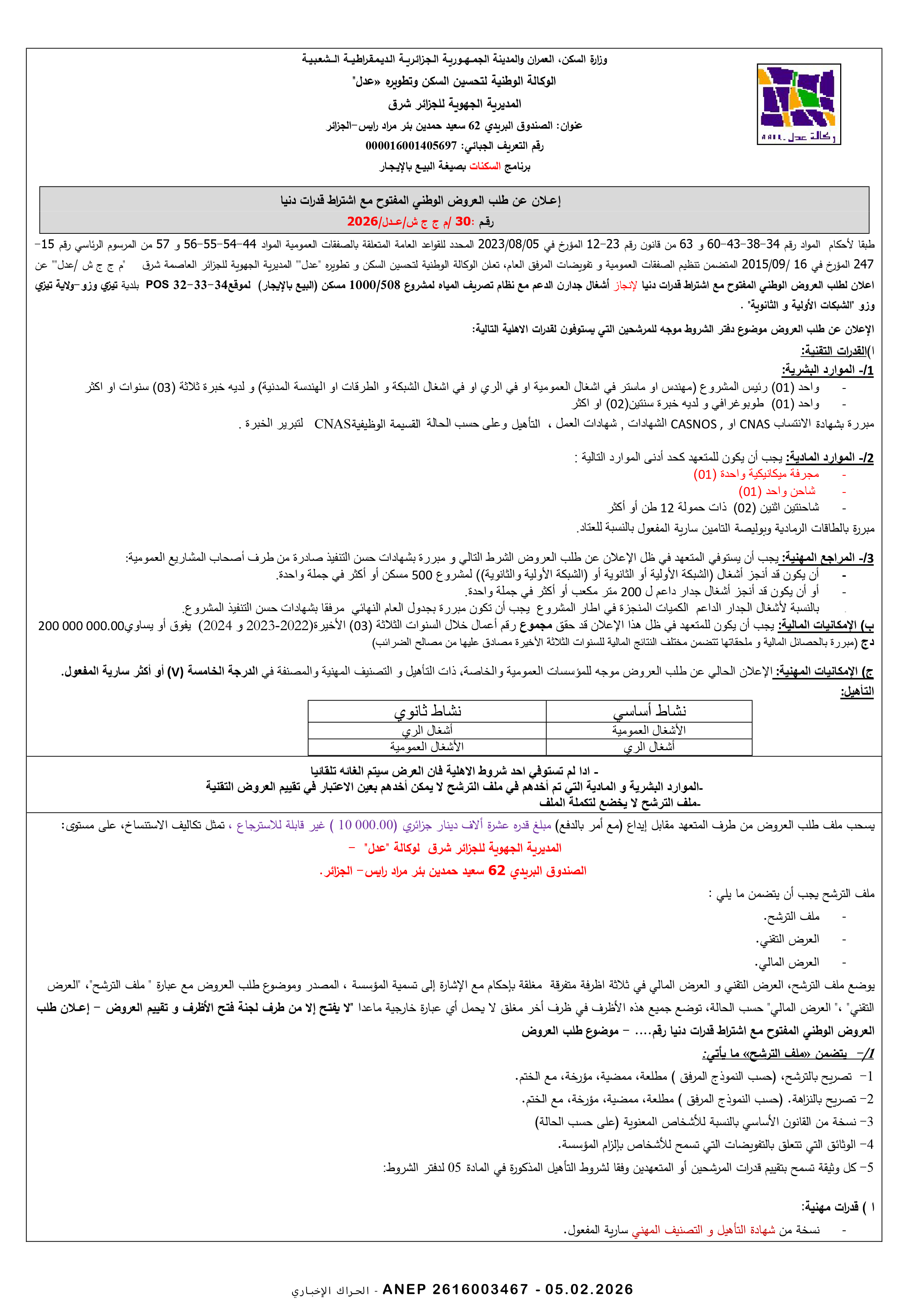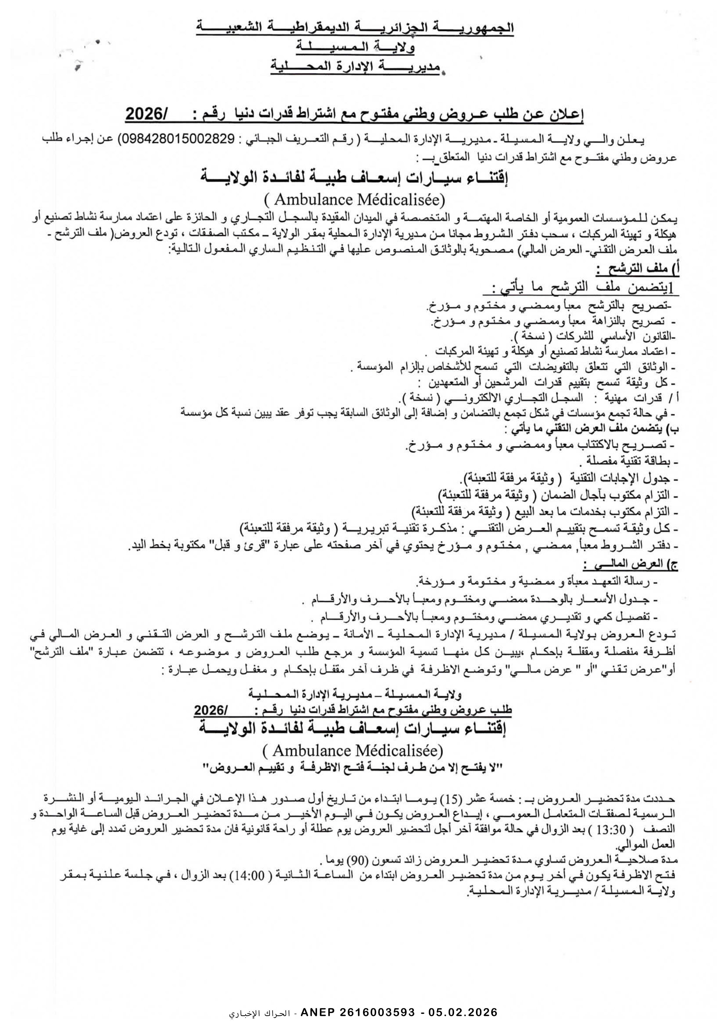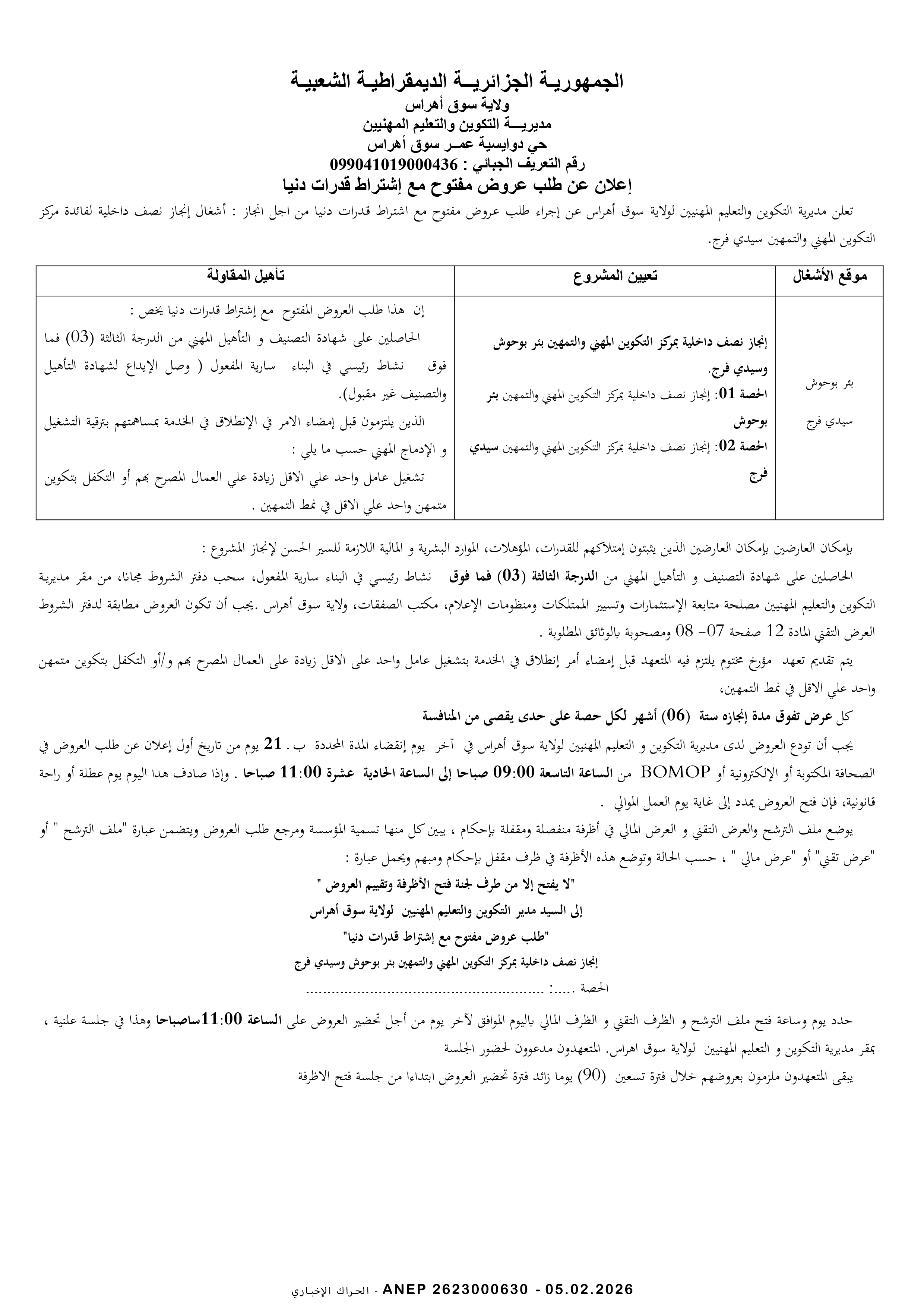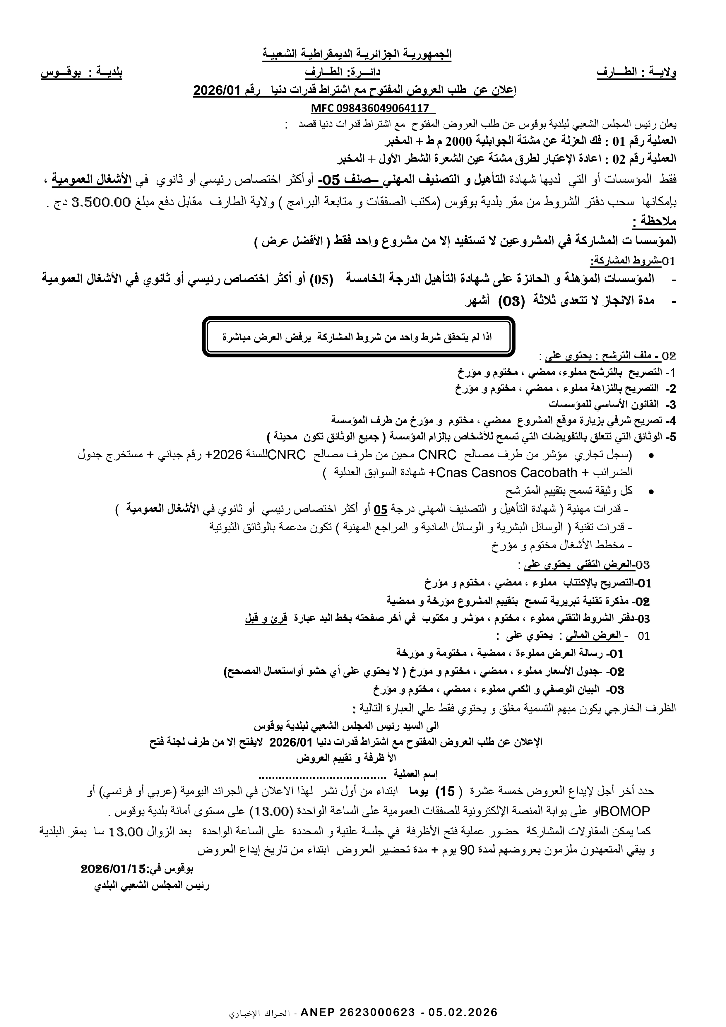 إعلان عن طلب عروض وطني مفتوح