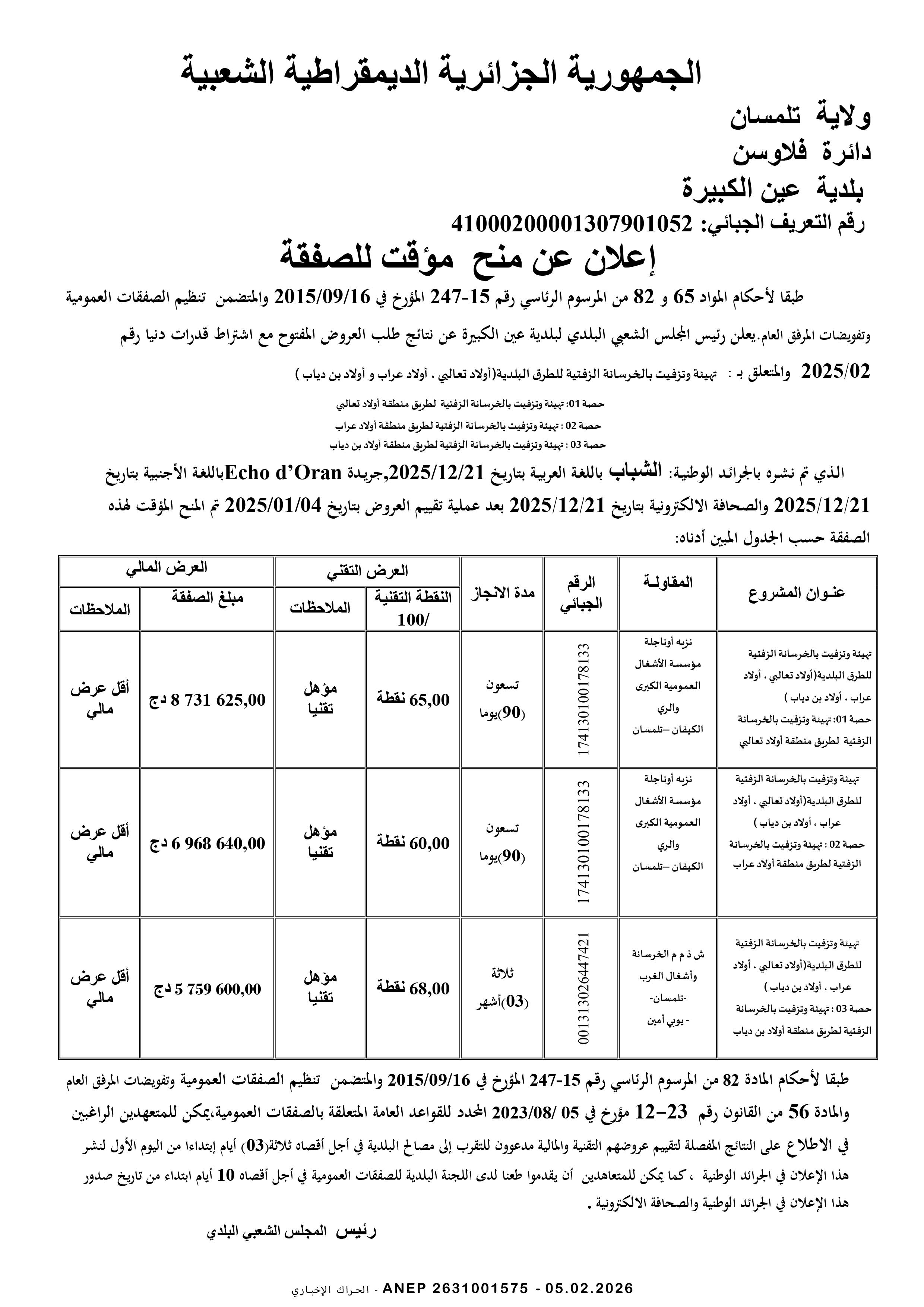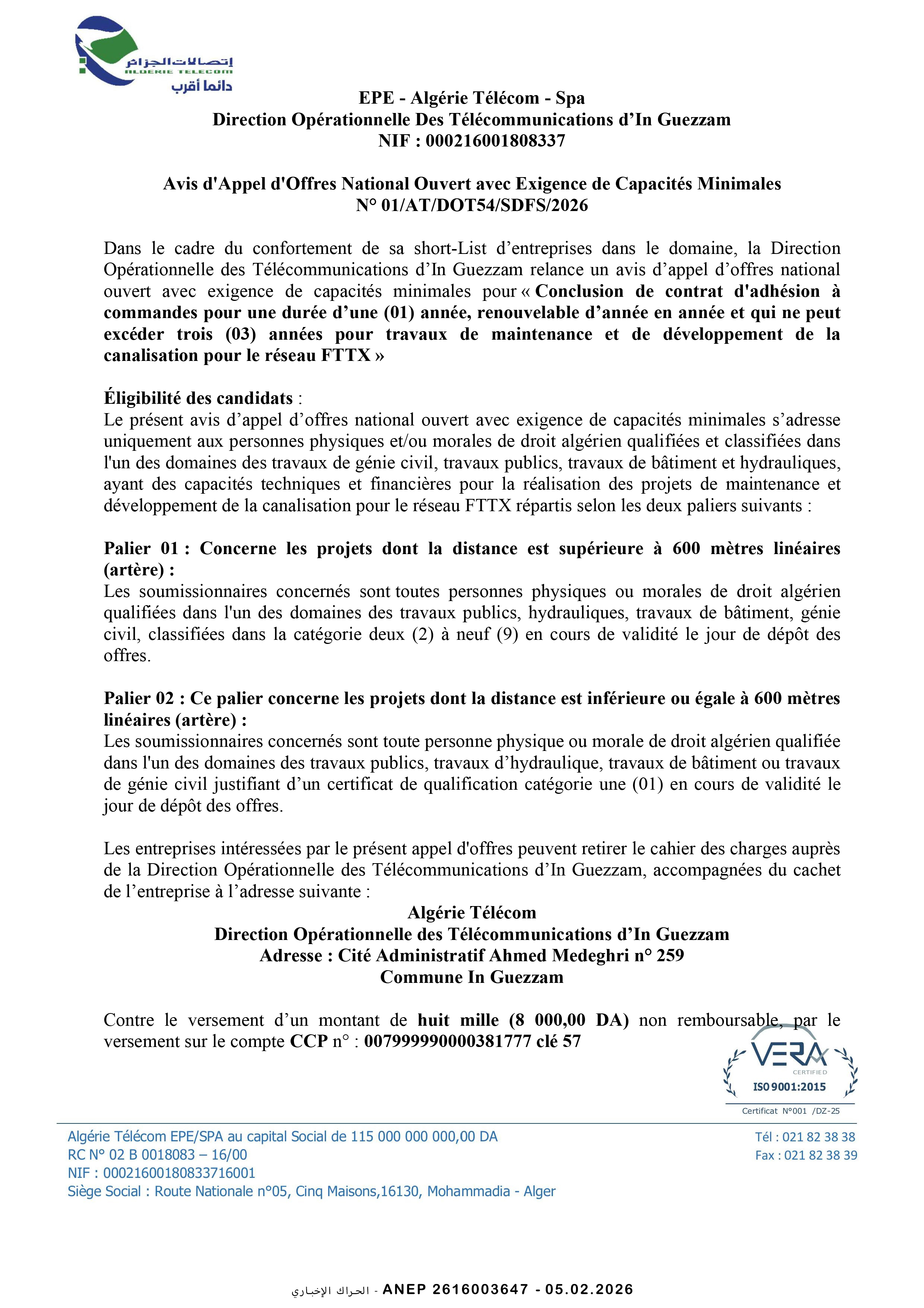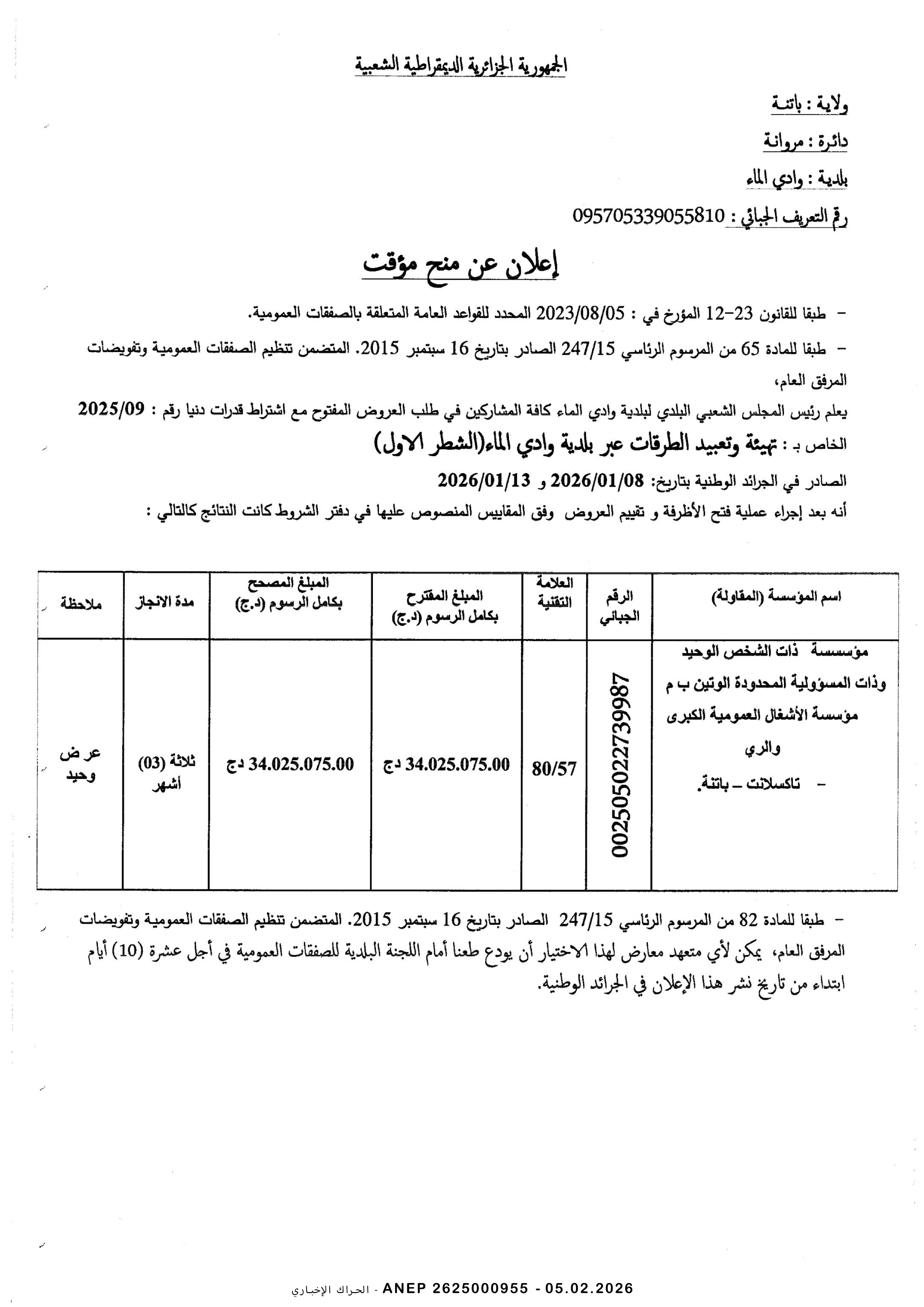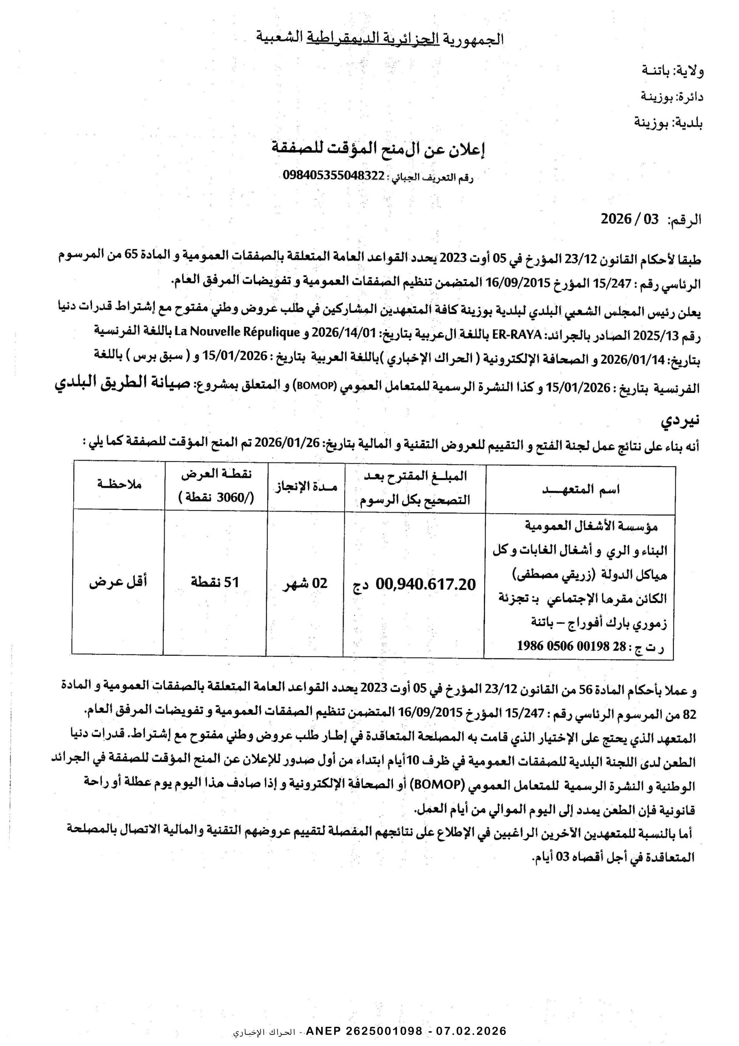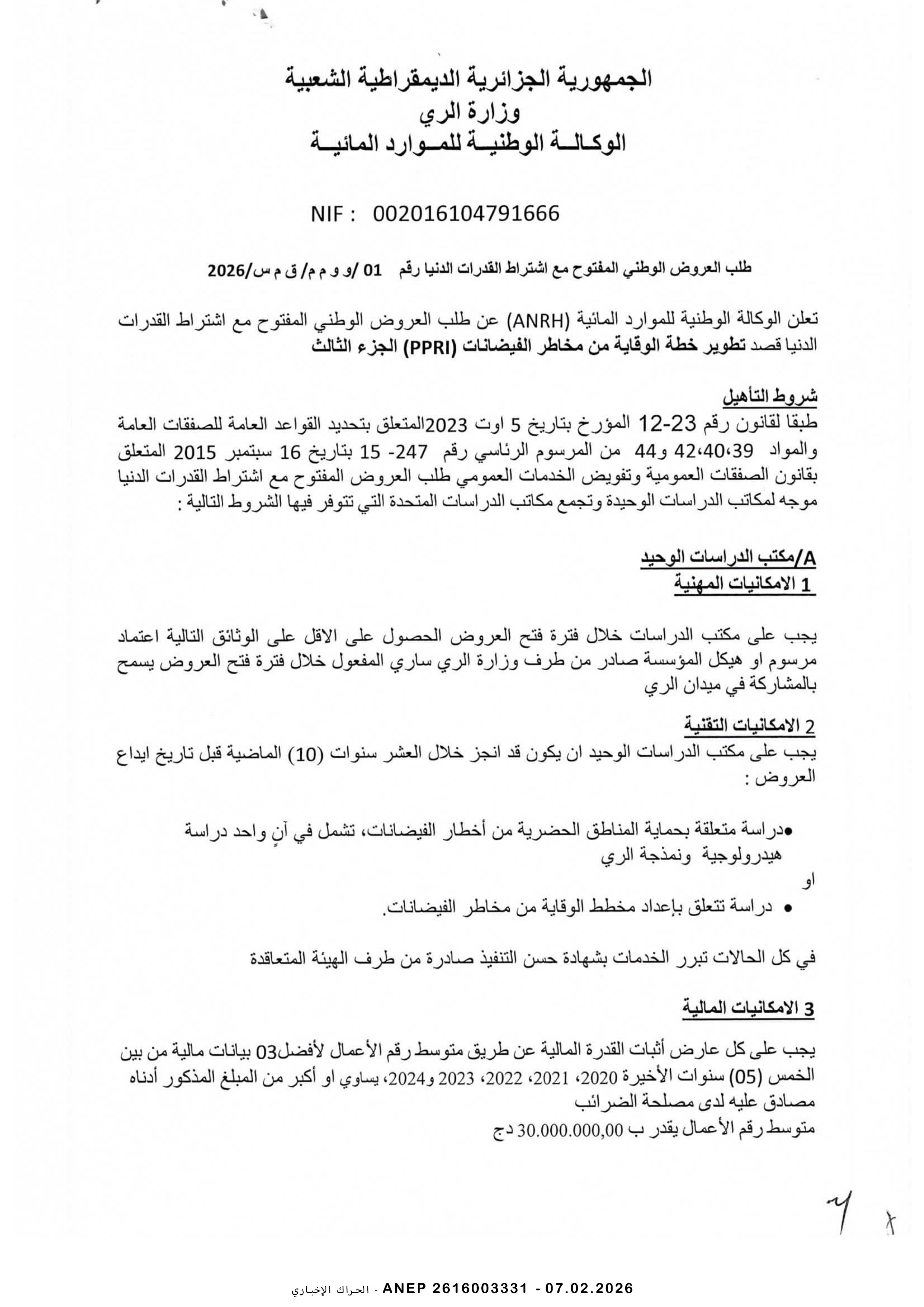 إعلان عن طلب عروض وطني مفتوح