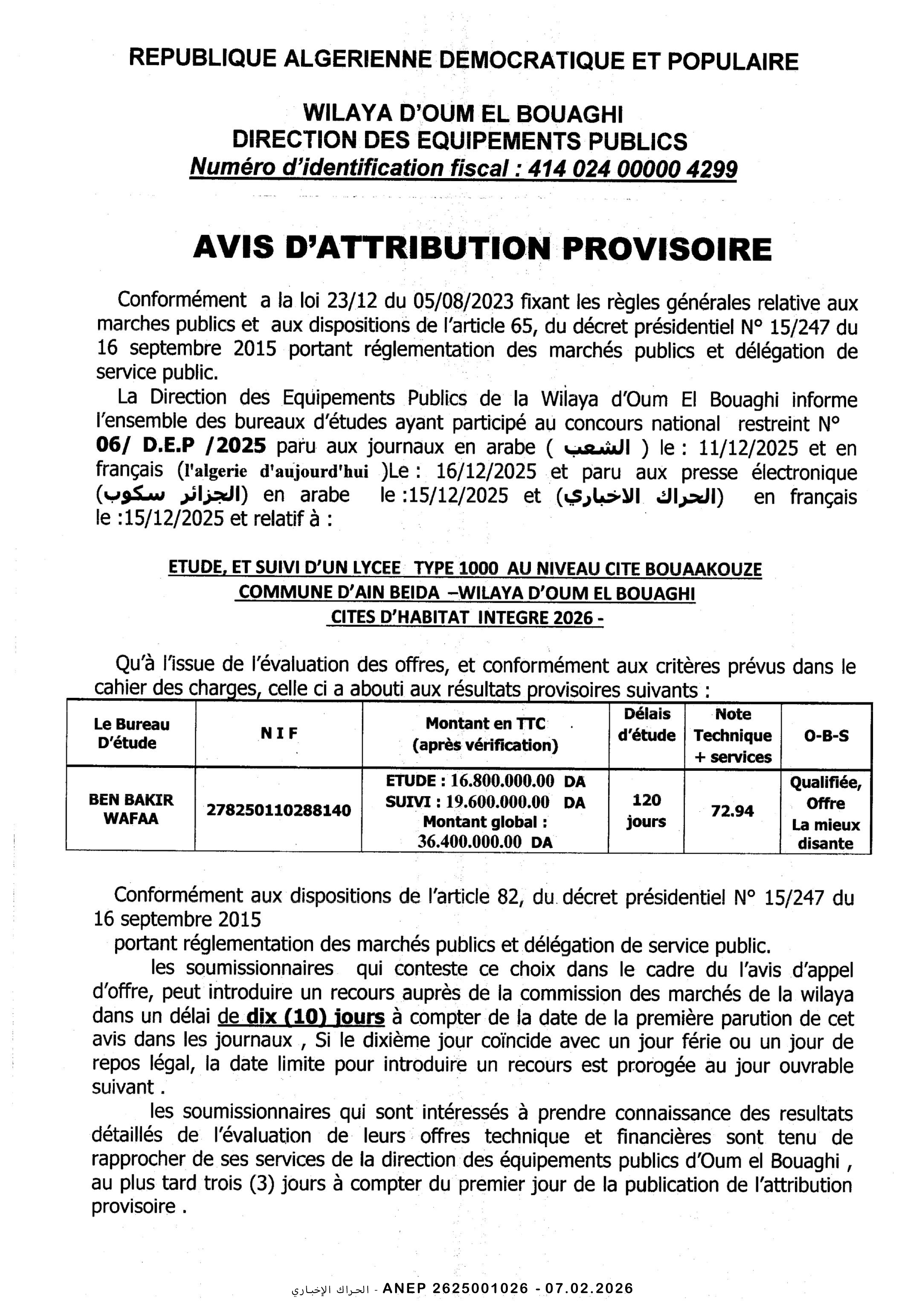 دراسة و متابعة لانجاز ابتدائية صنف 02 بلدية بن فريحة وهران