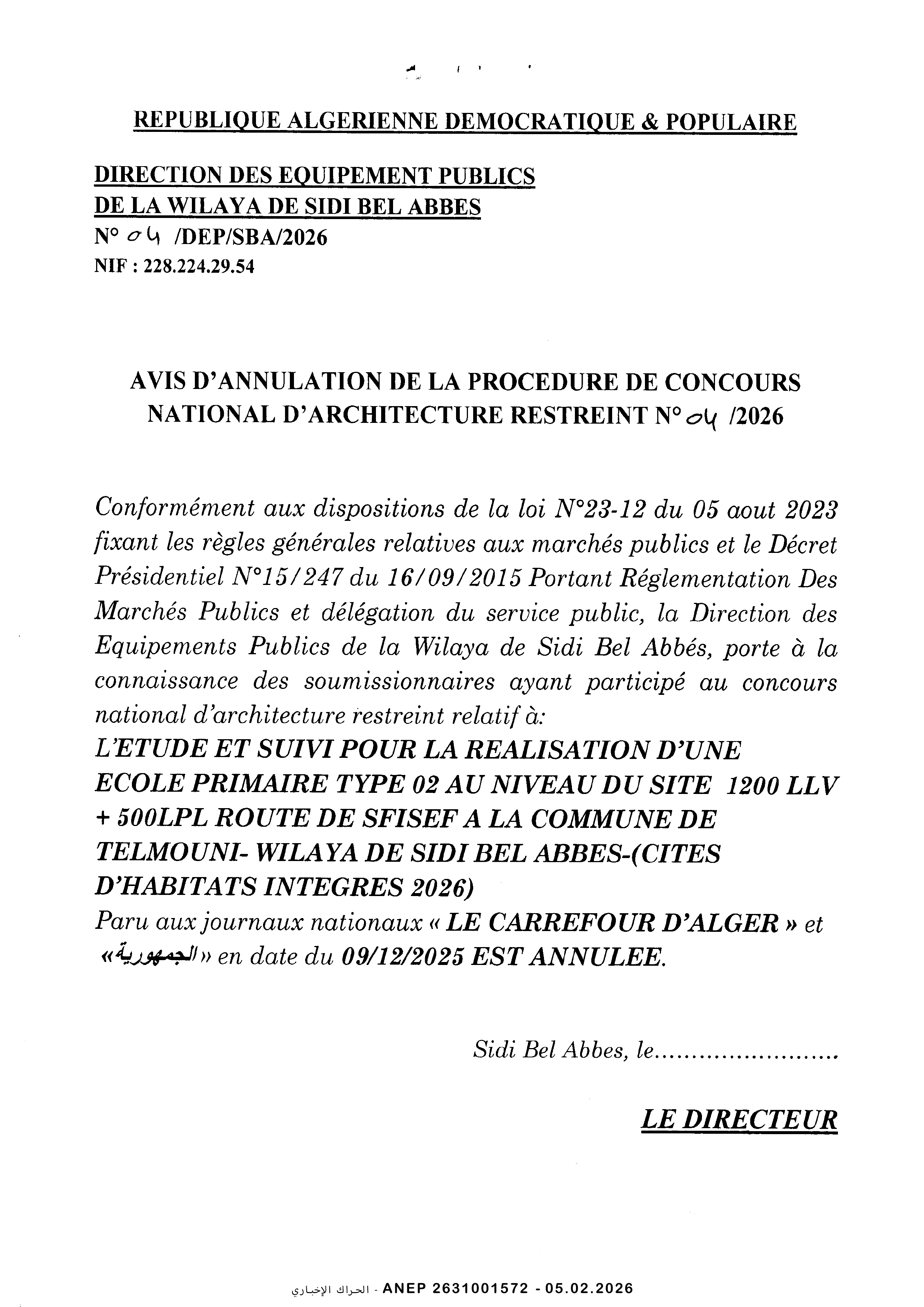إعلان عن الغاء مسابقة وطنية في الهندسة المعمارية محدوة