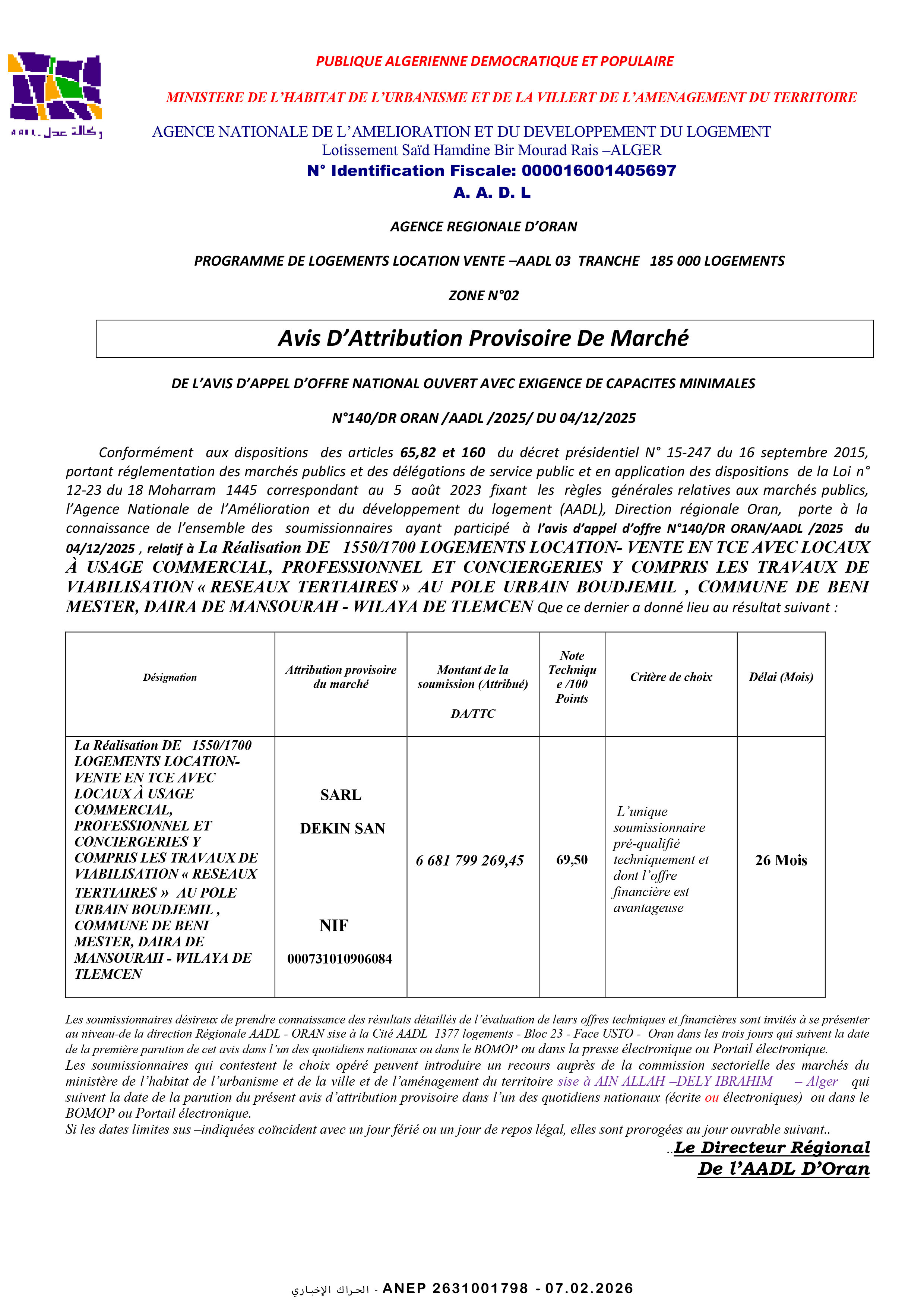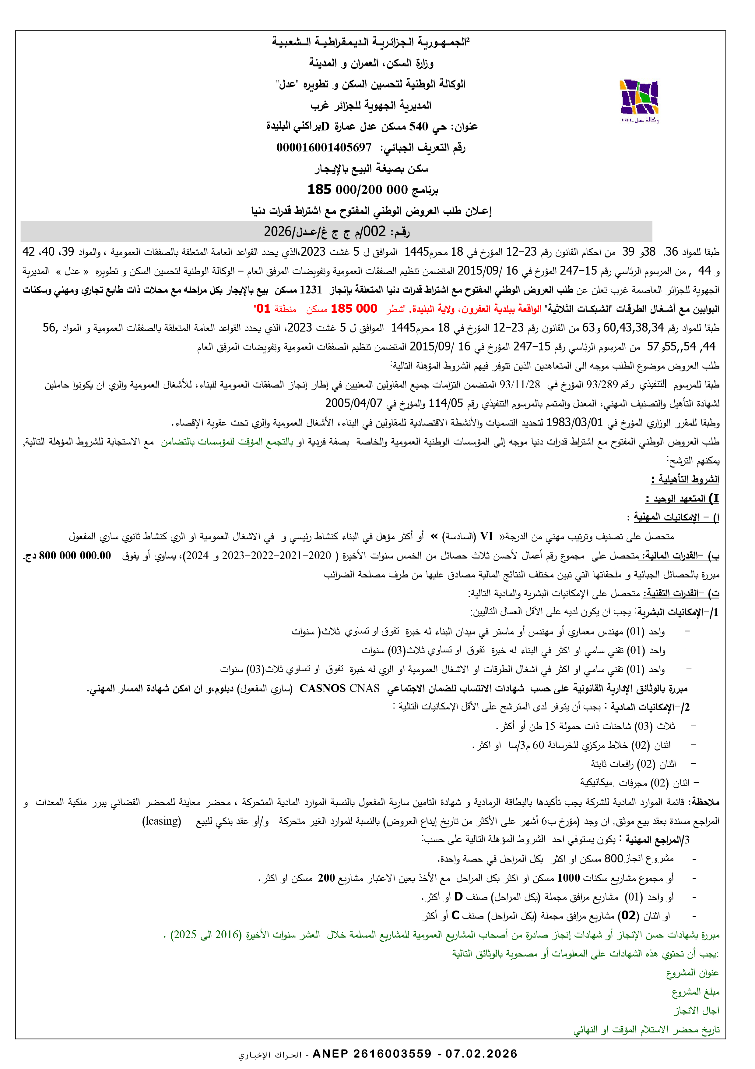 إنجاز 1550/1700 مسكن بيع إيجار مع محلات و سكنات البوابين و كل المرافق بلدية بني مستار ولاية تلمسان