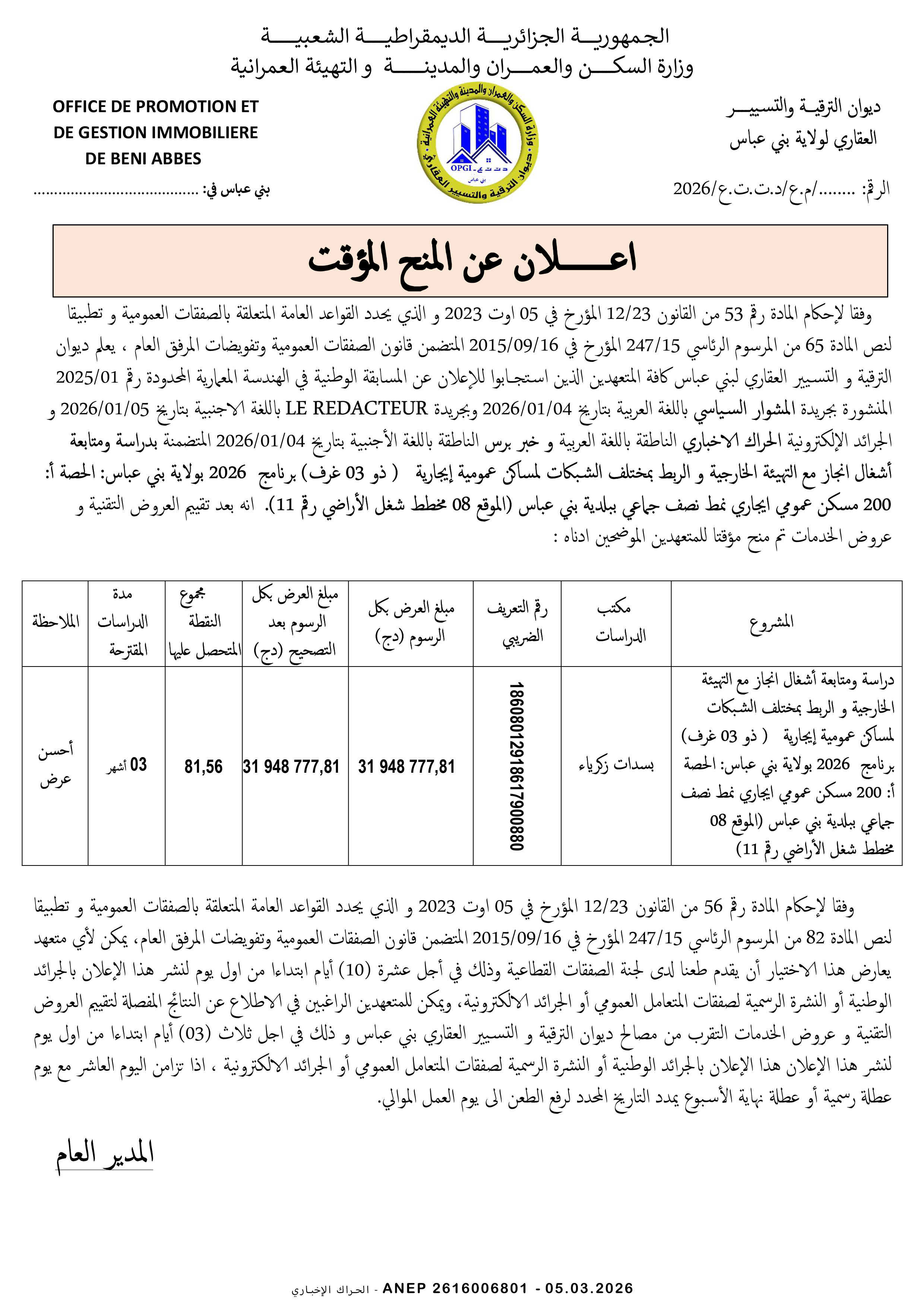 إنجاز أشغال توسعة مقر ديوان الترقية و التسيير العقاري لولاية تمنراست