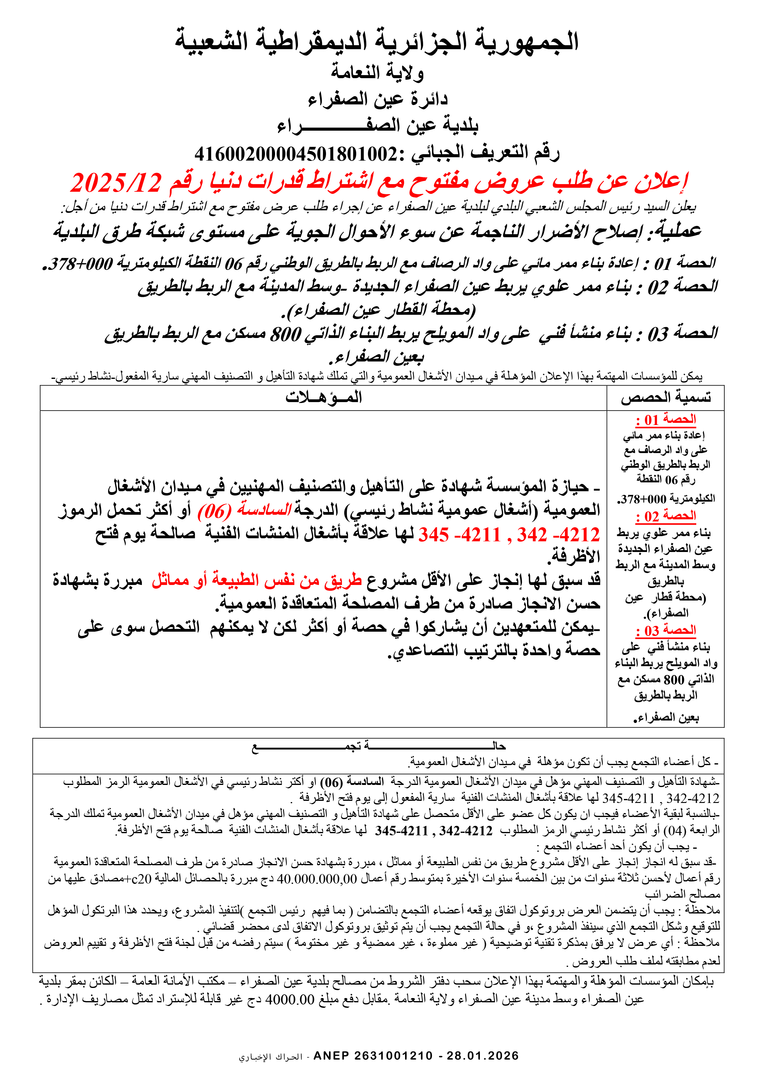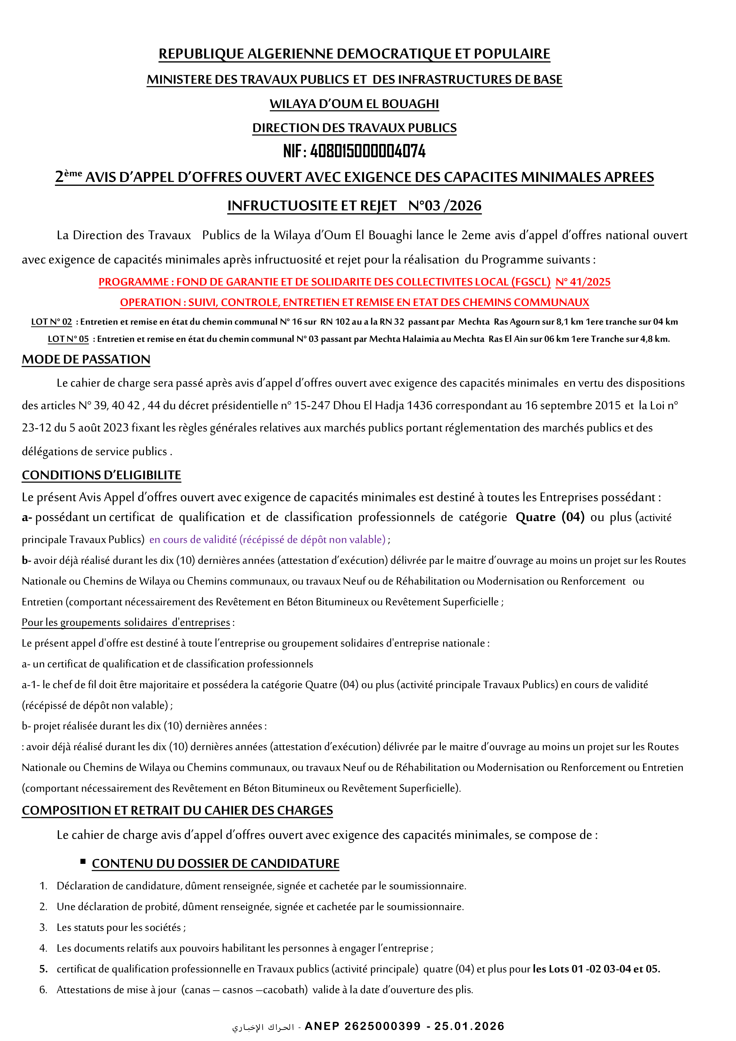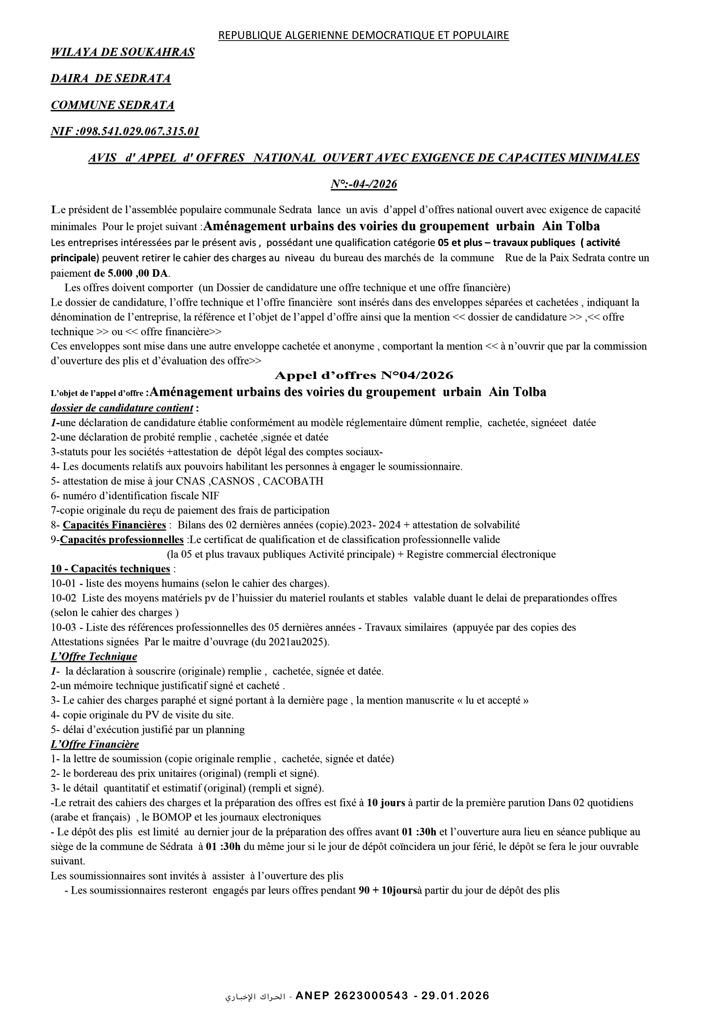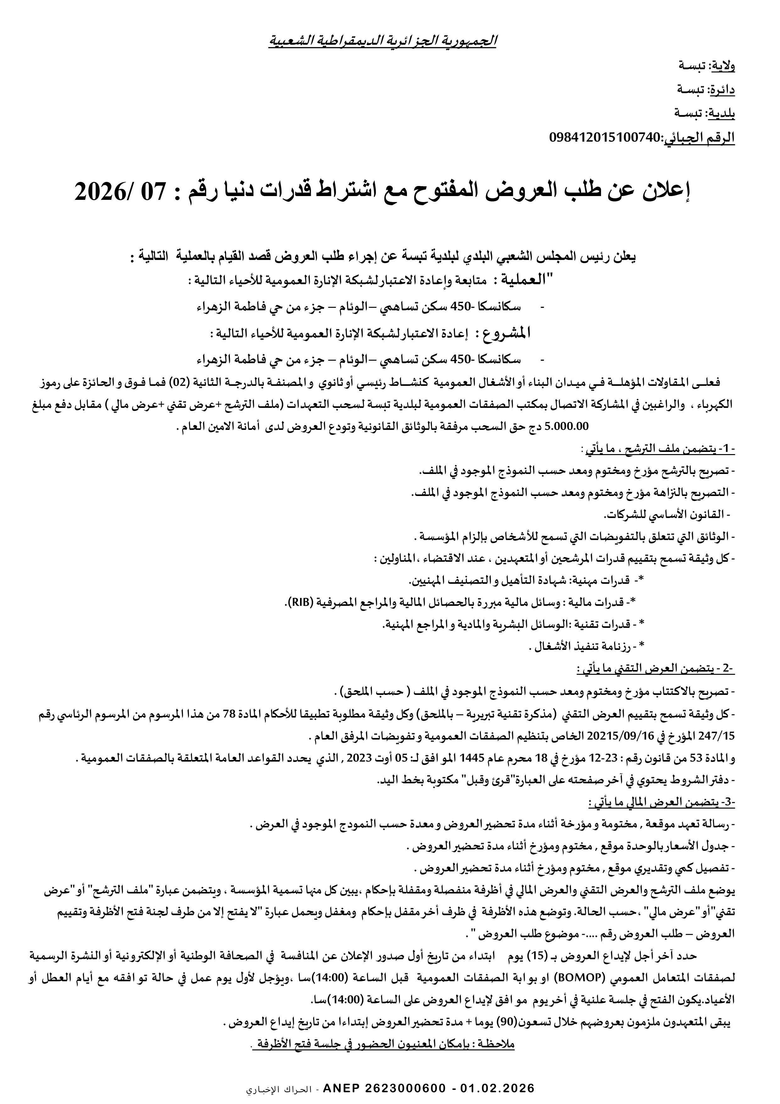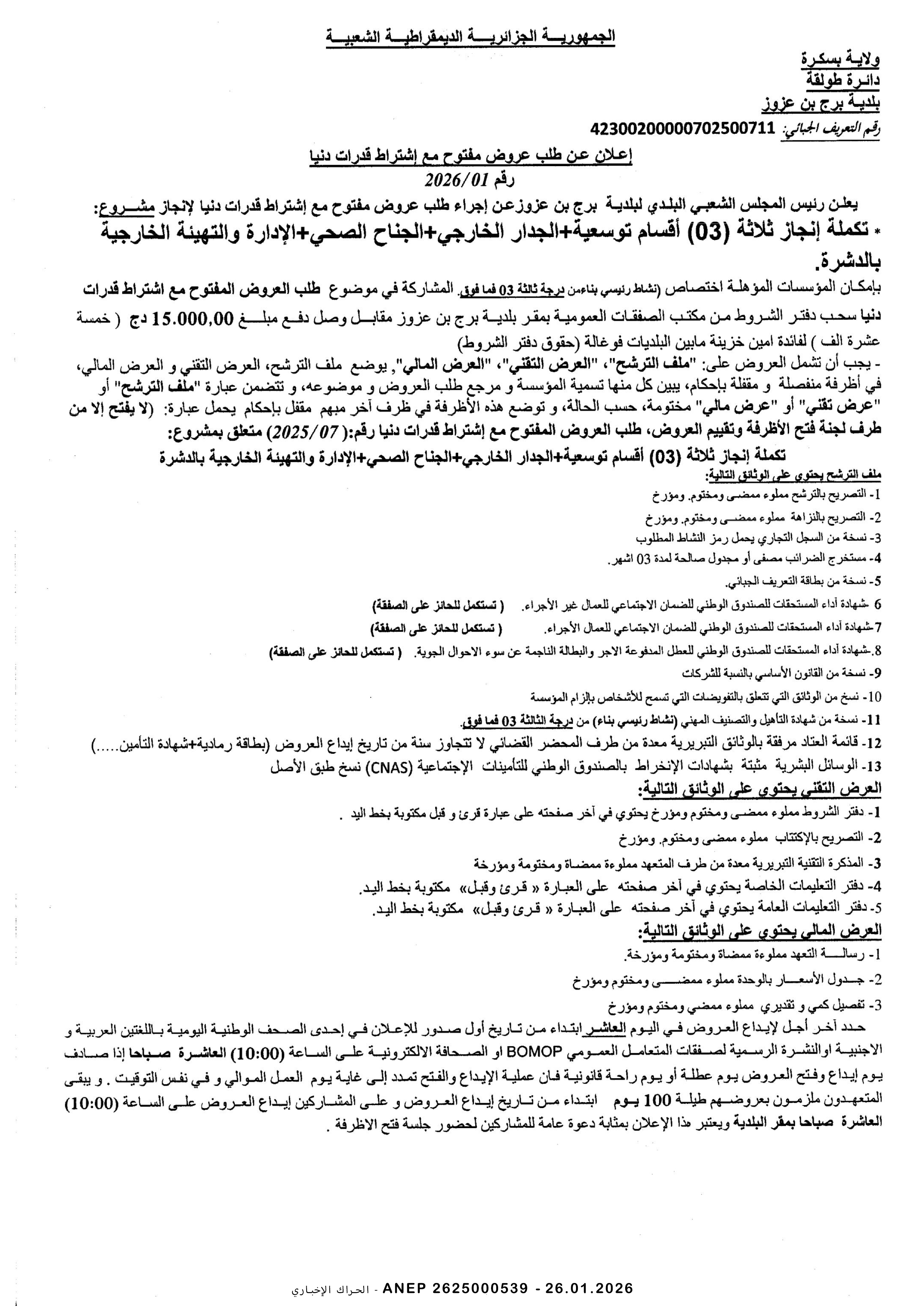إعلان عن تصحيح طلب عروض وطني مفتوح