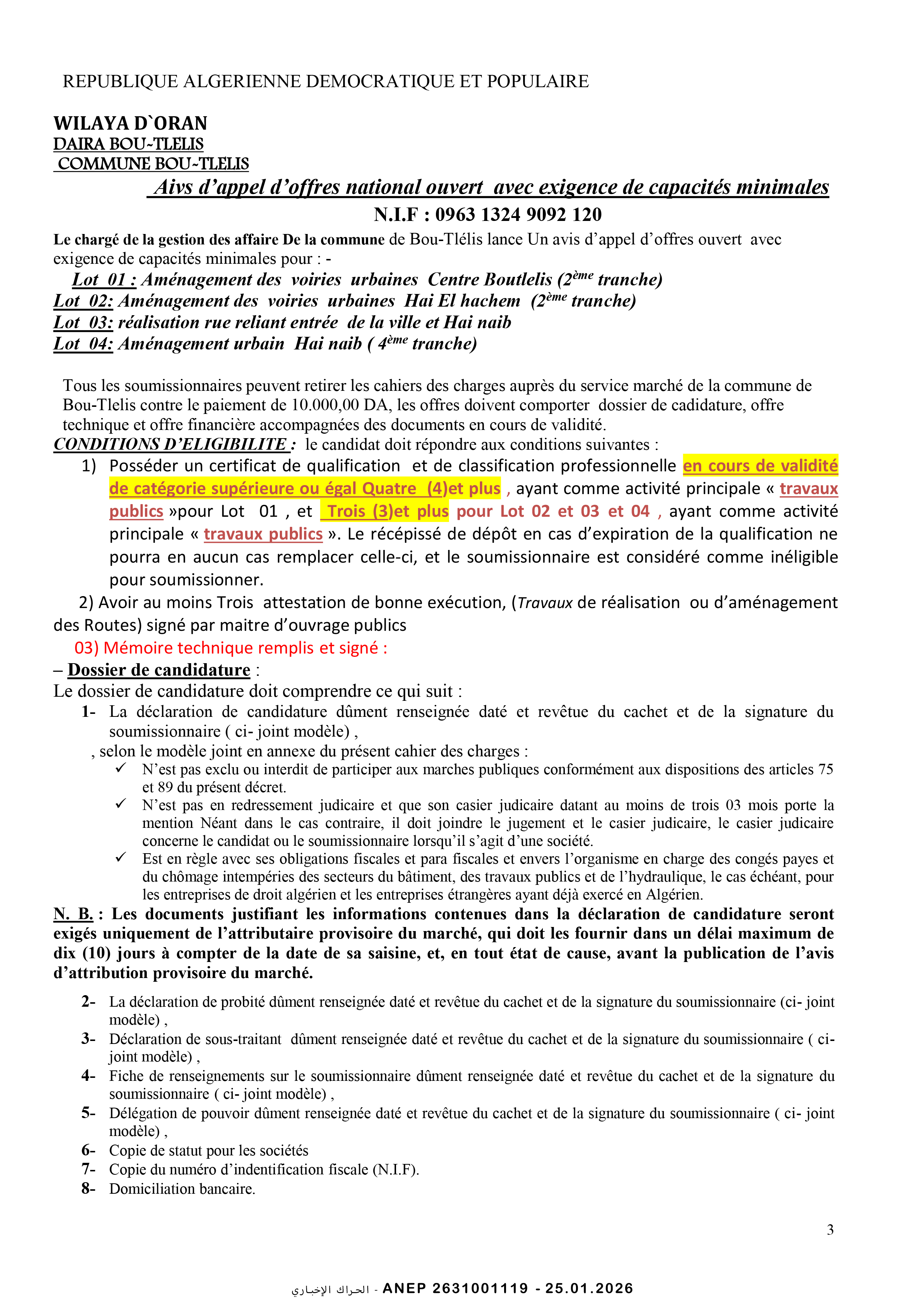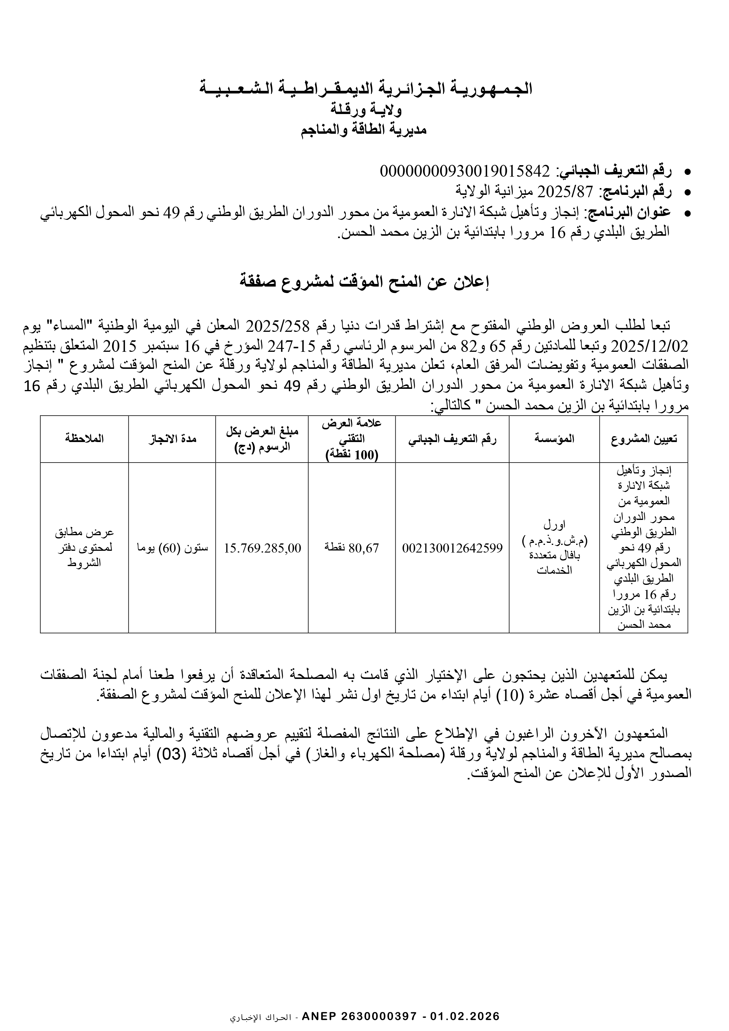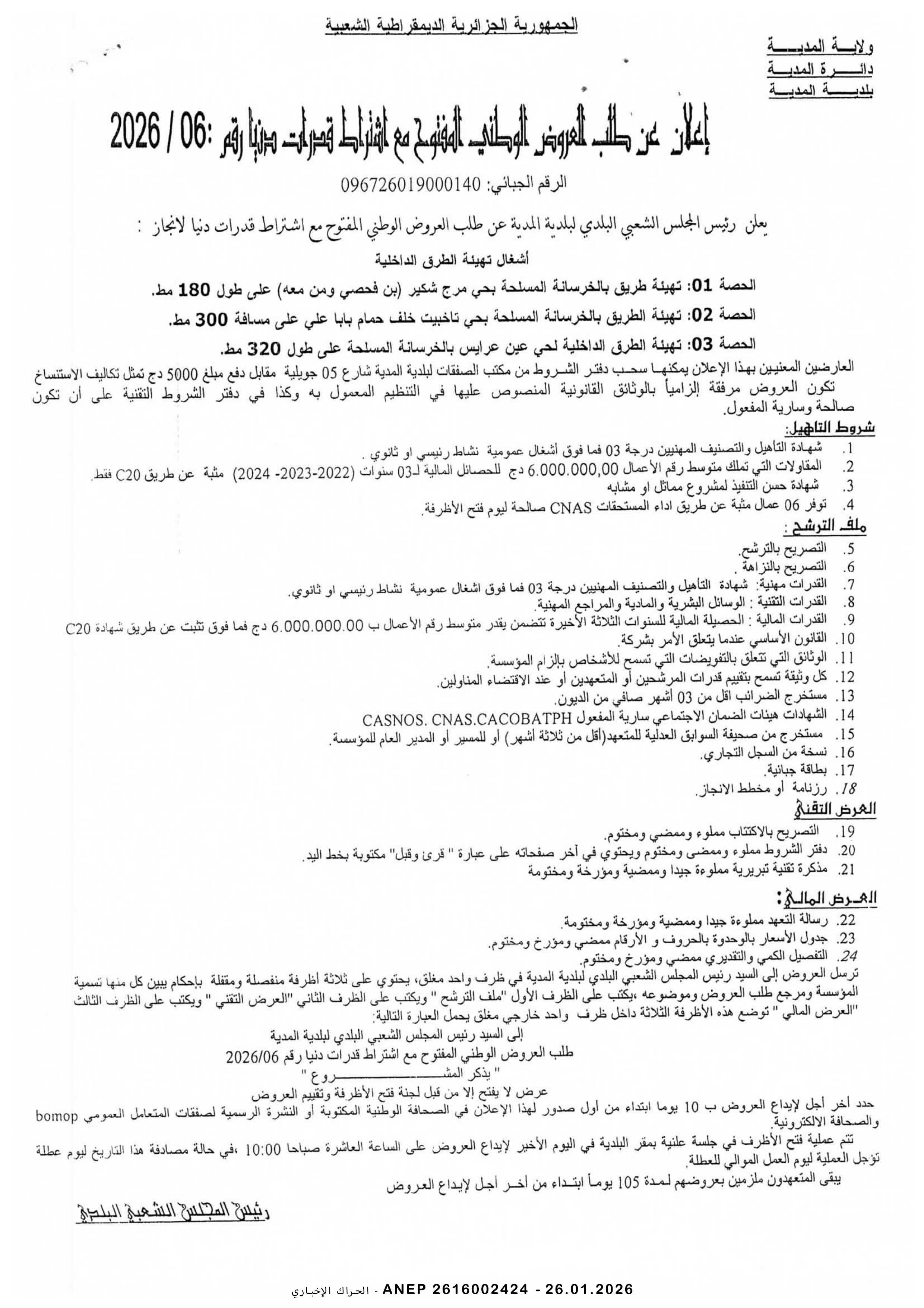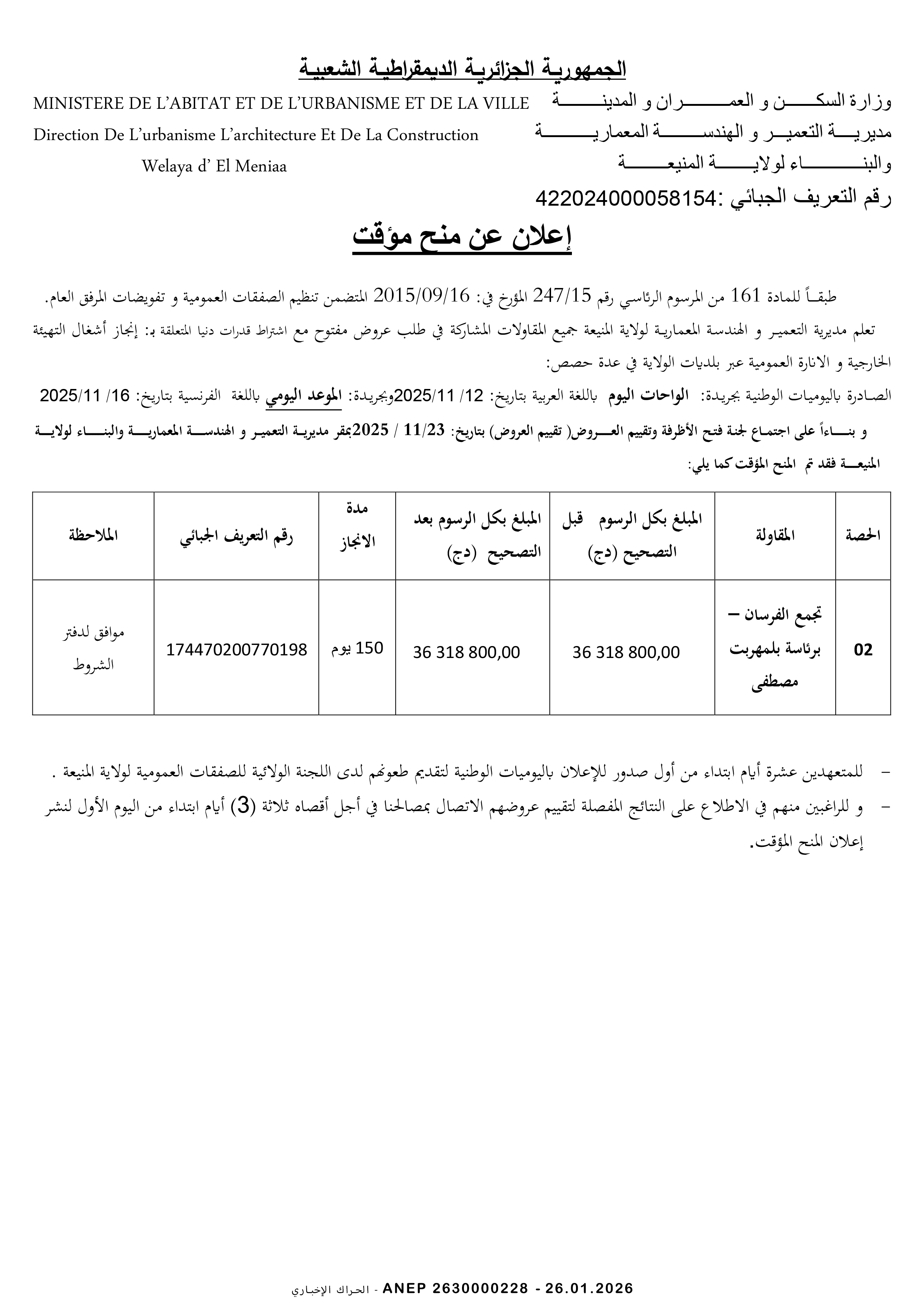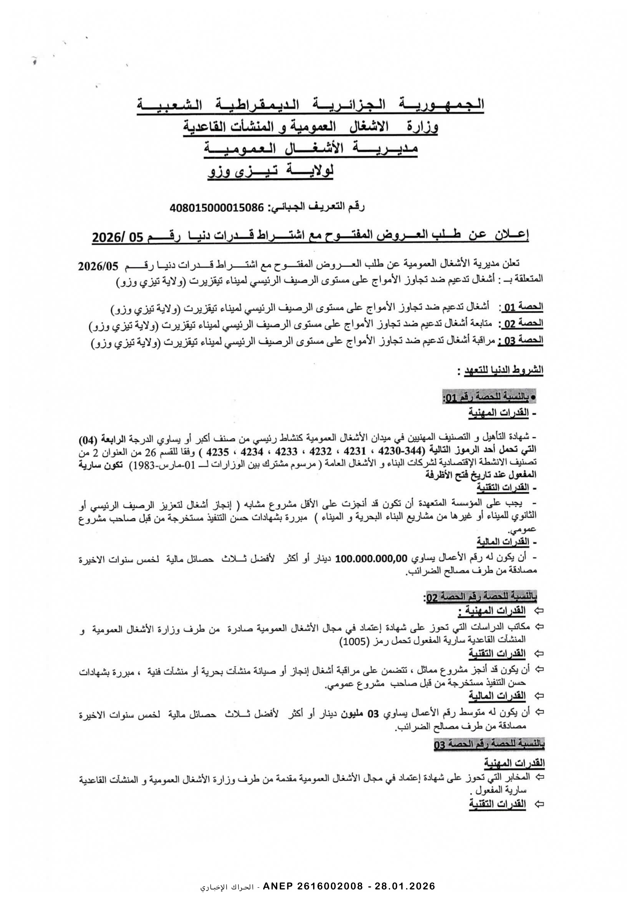 إعلان عن تصحيح طلب عروض وطني مفتوح