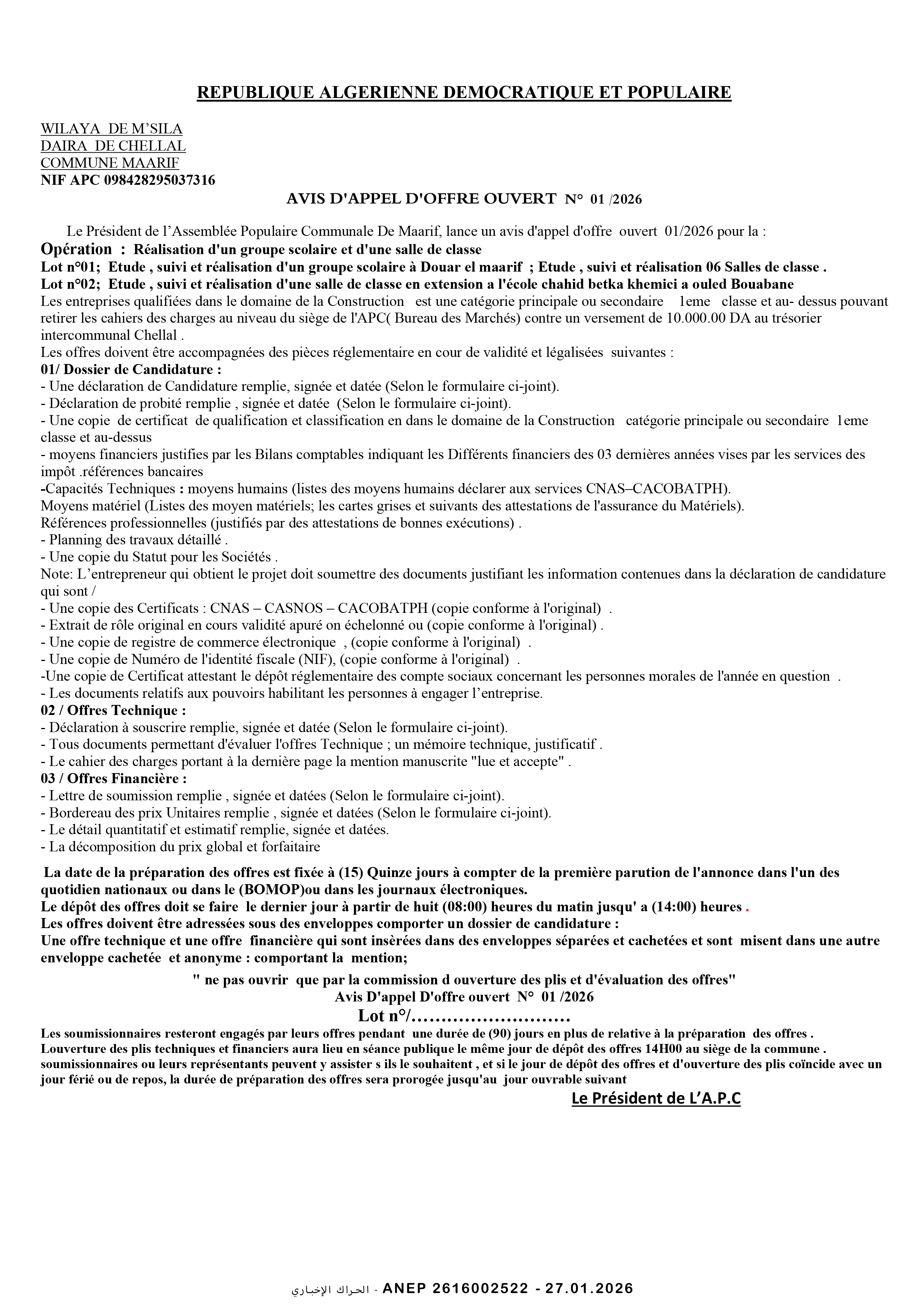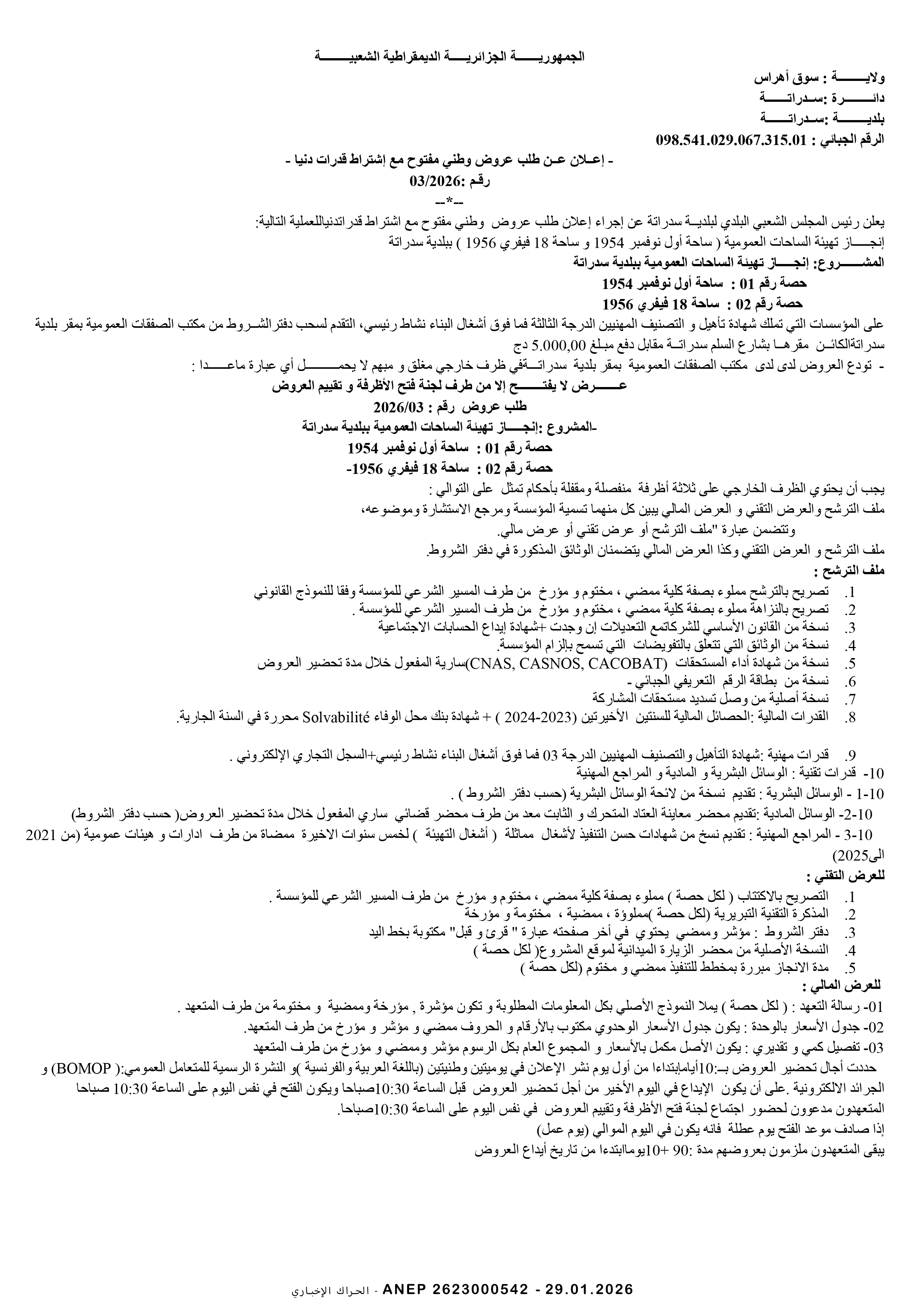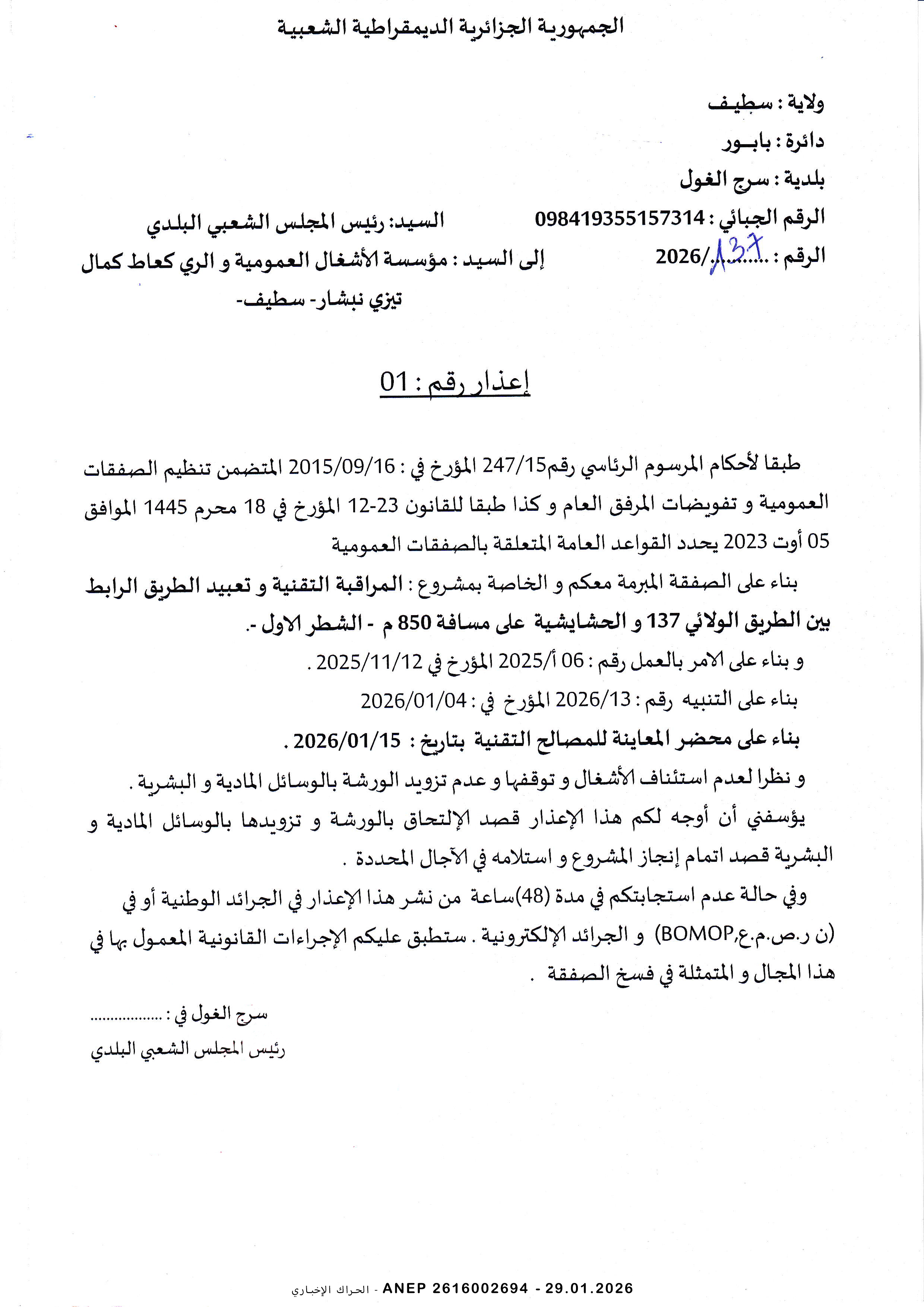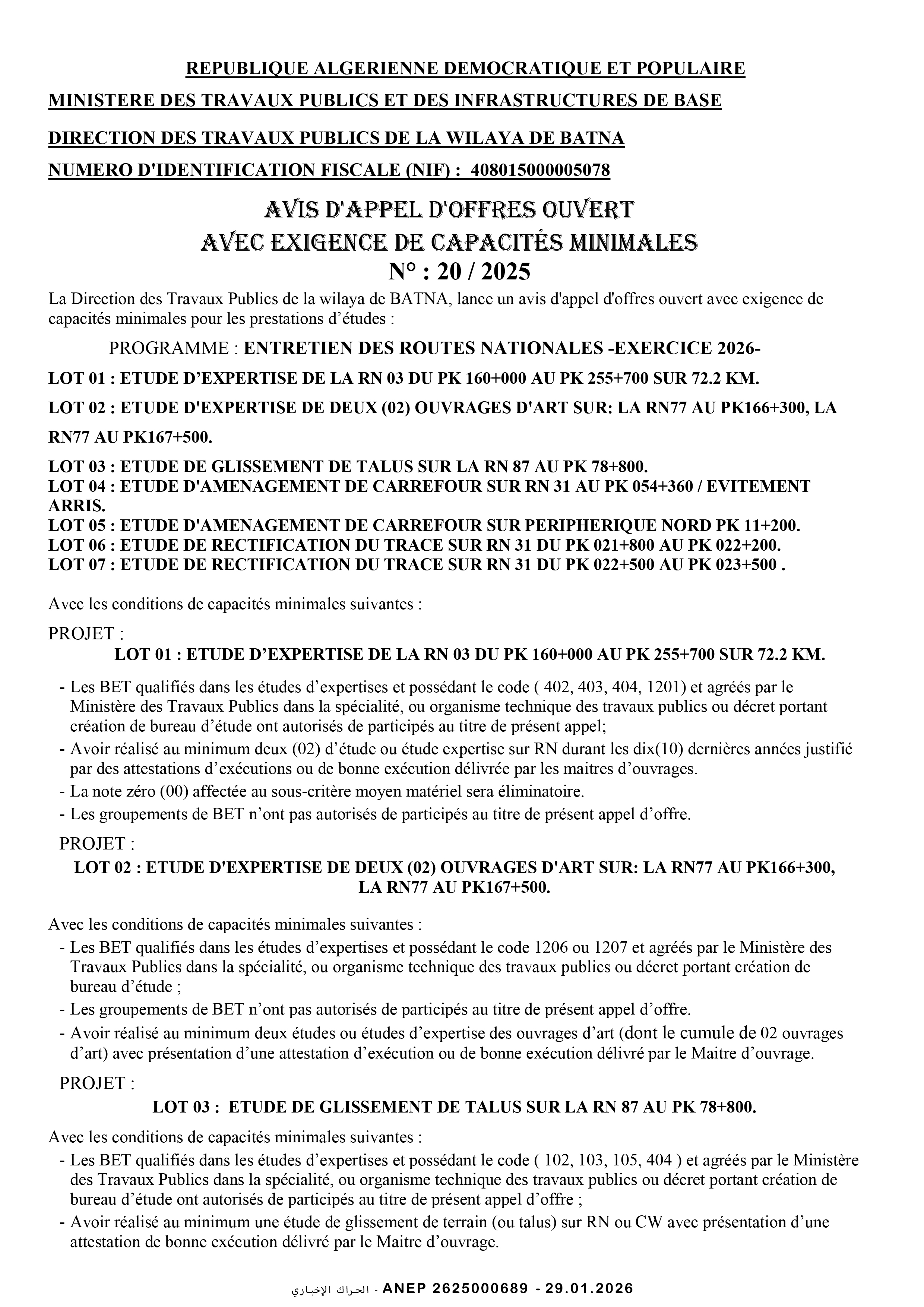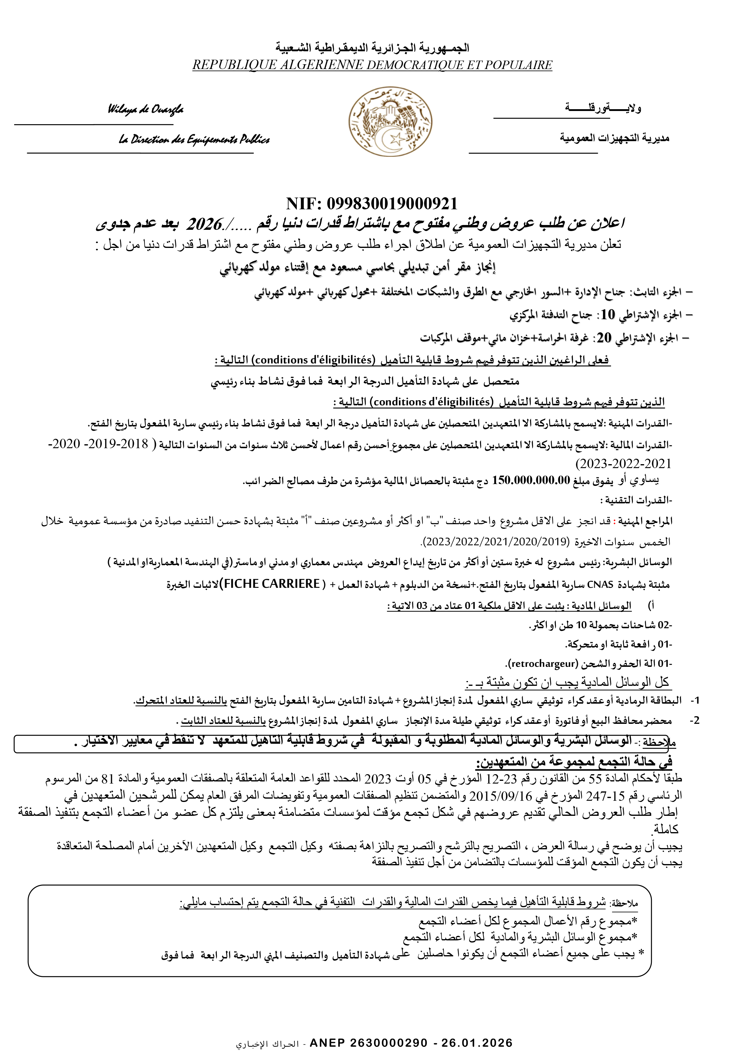 إعلان عن تصحيح طلب عروض وطني مفتوح