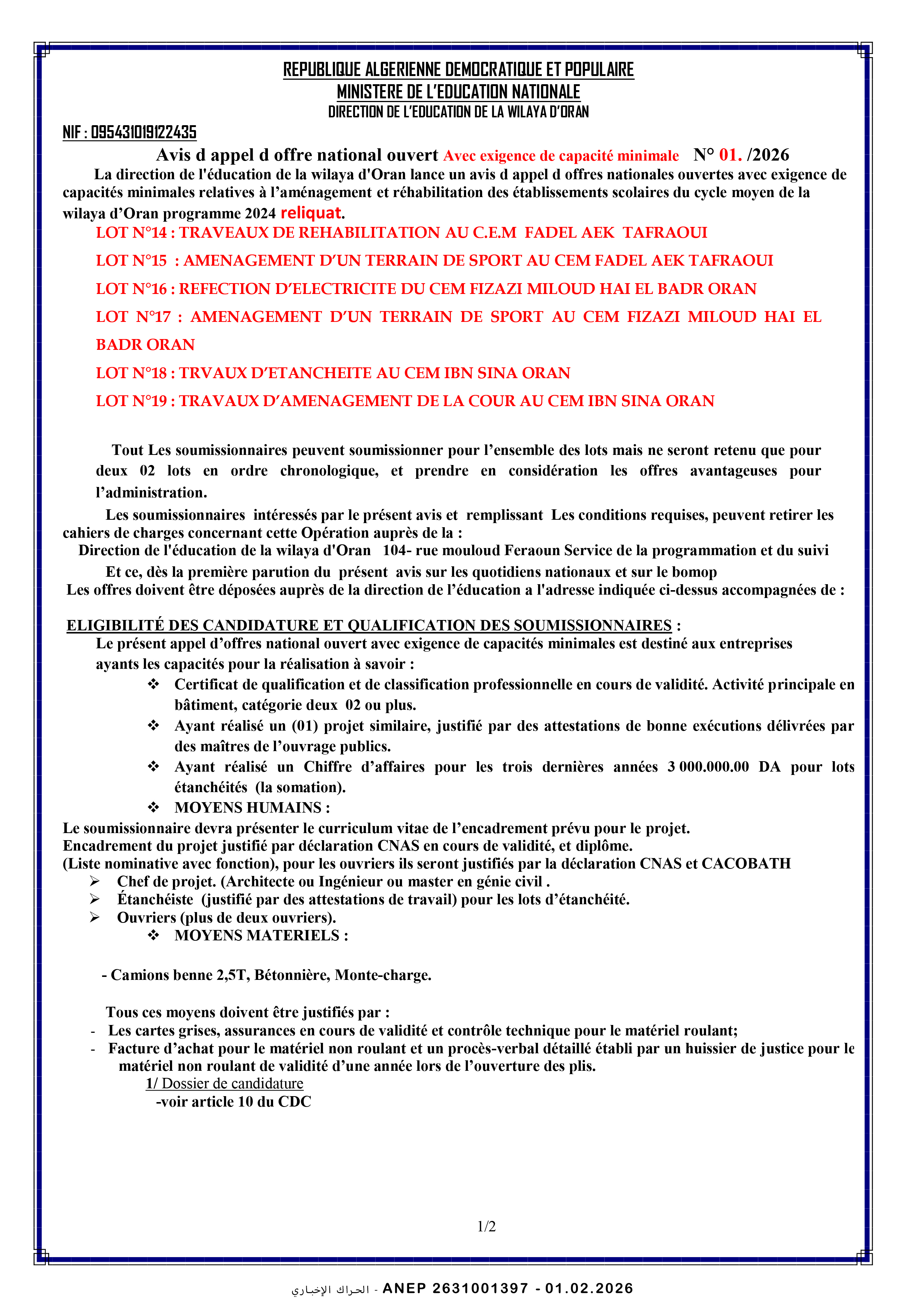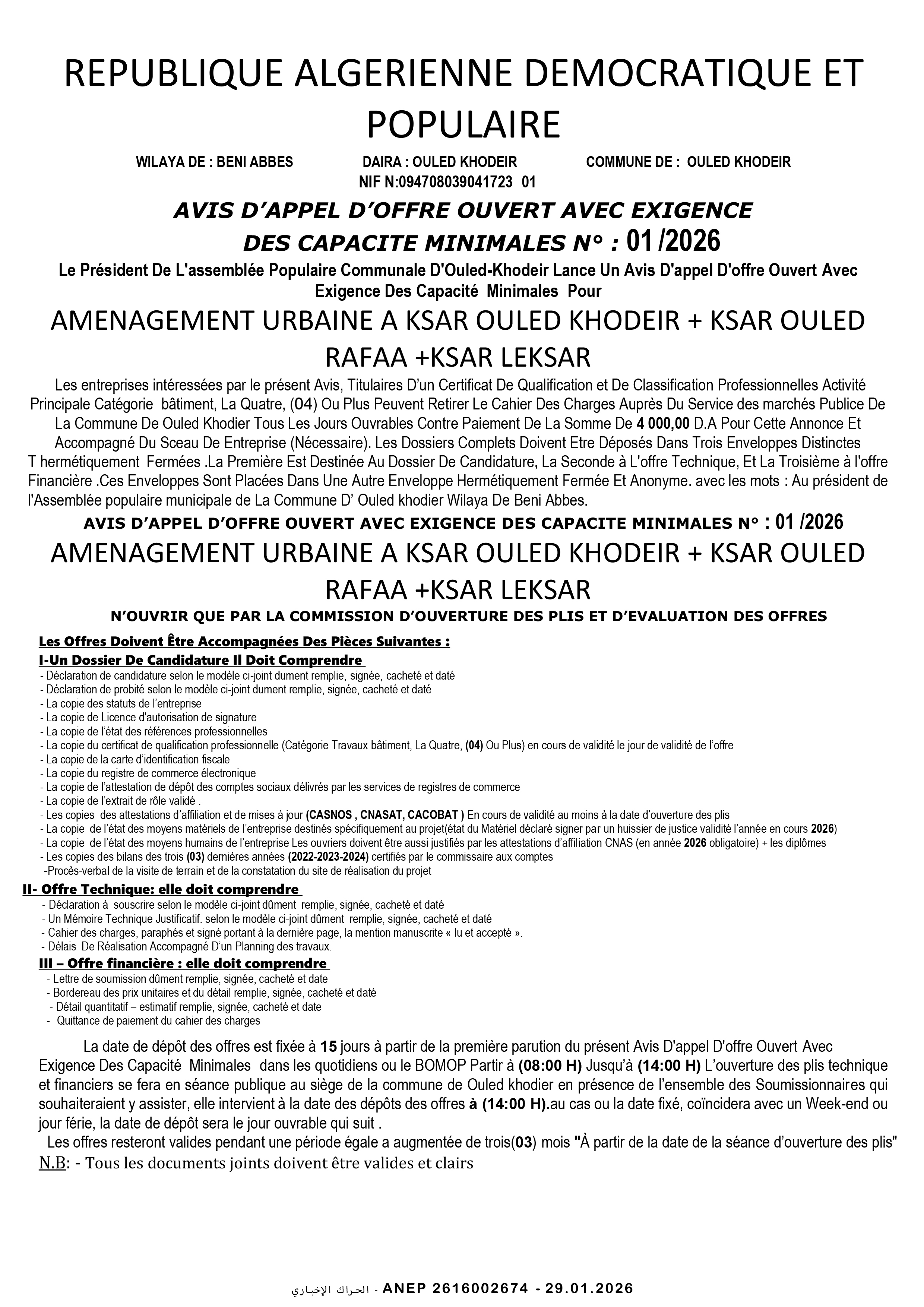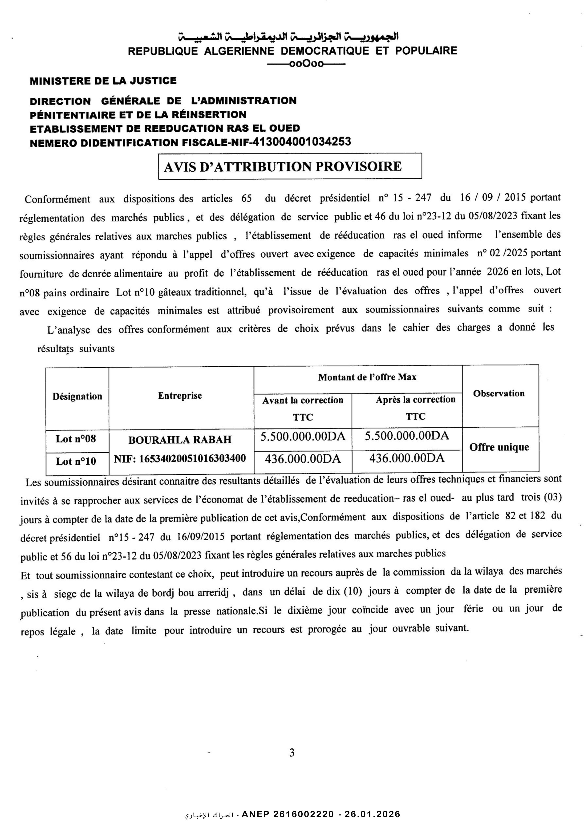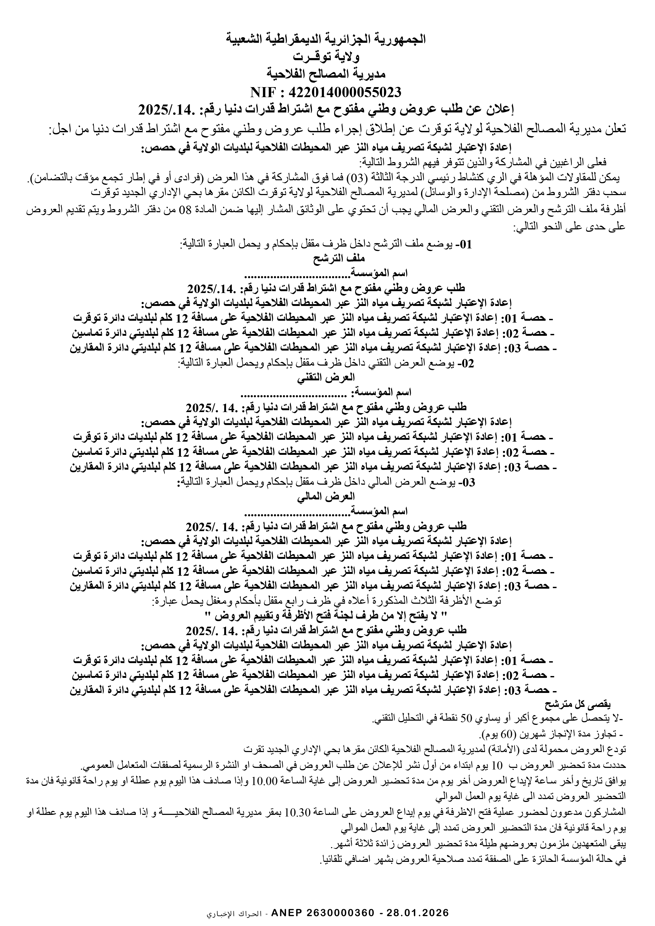 إعلان عن تصحيح طلب عروض وطني مفتوح