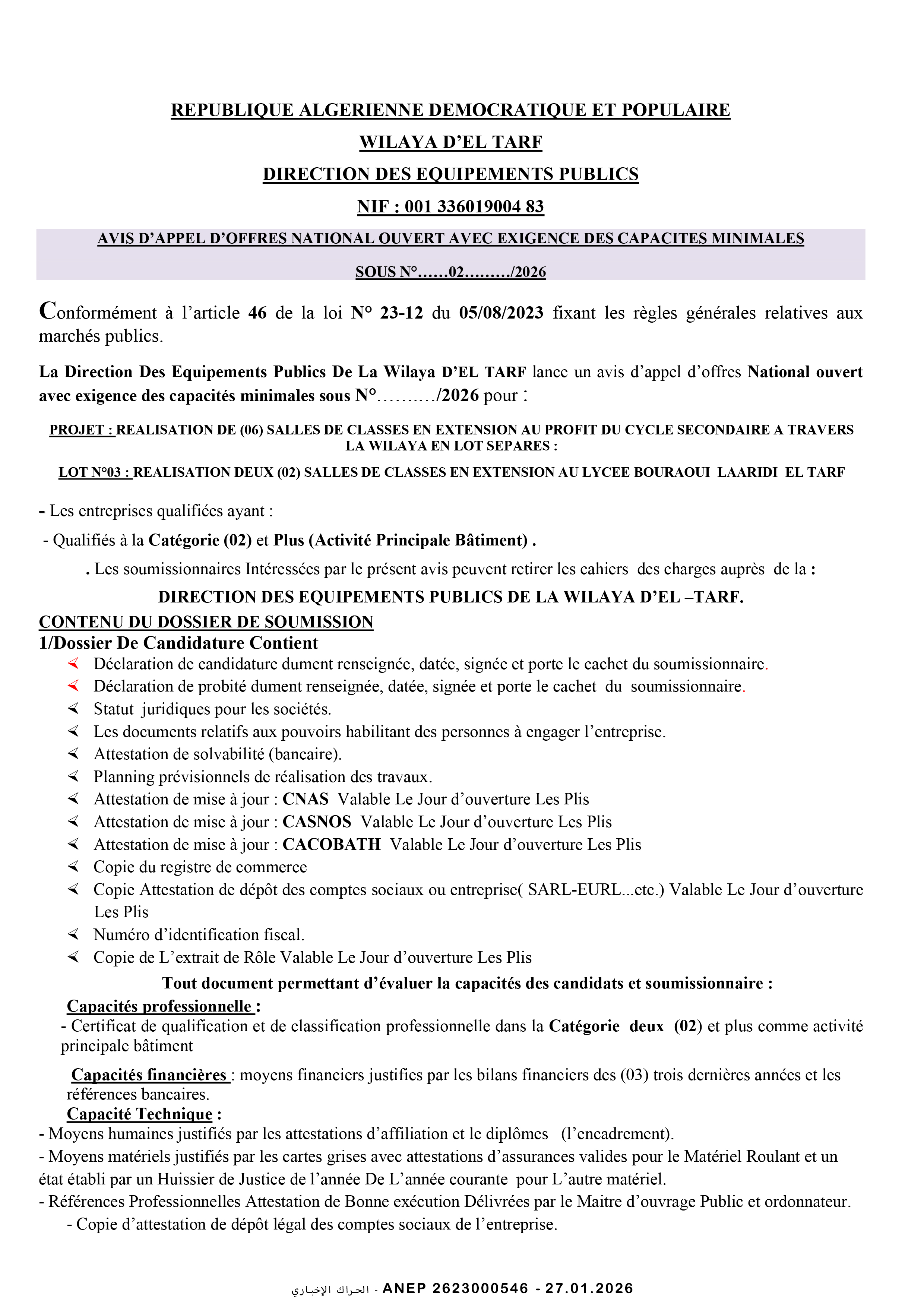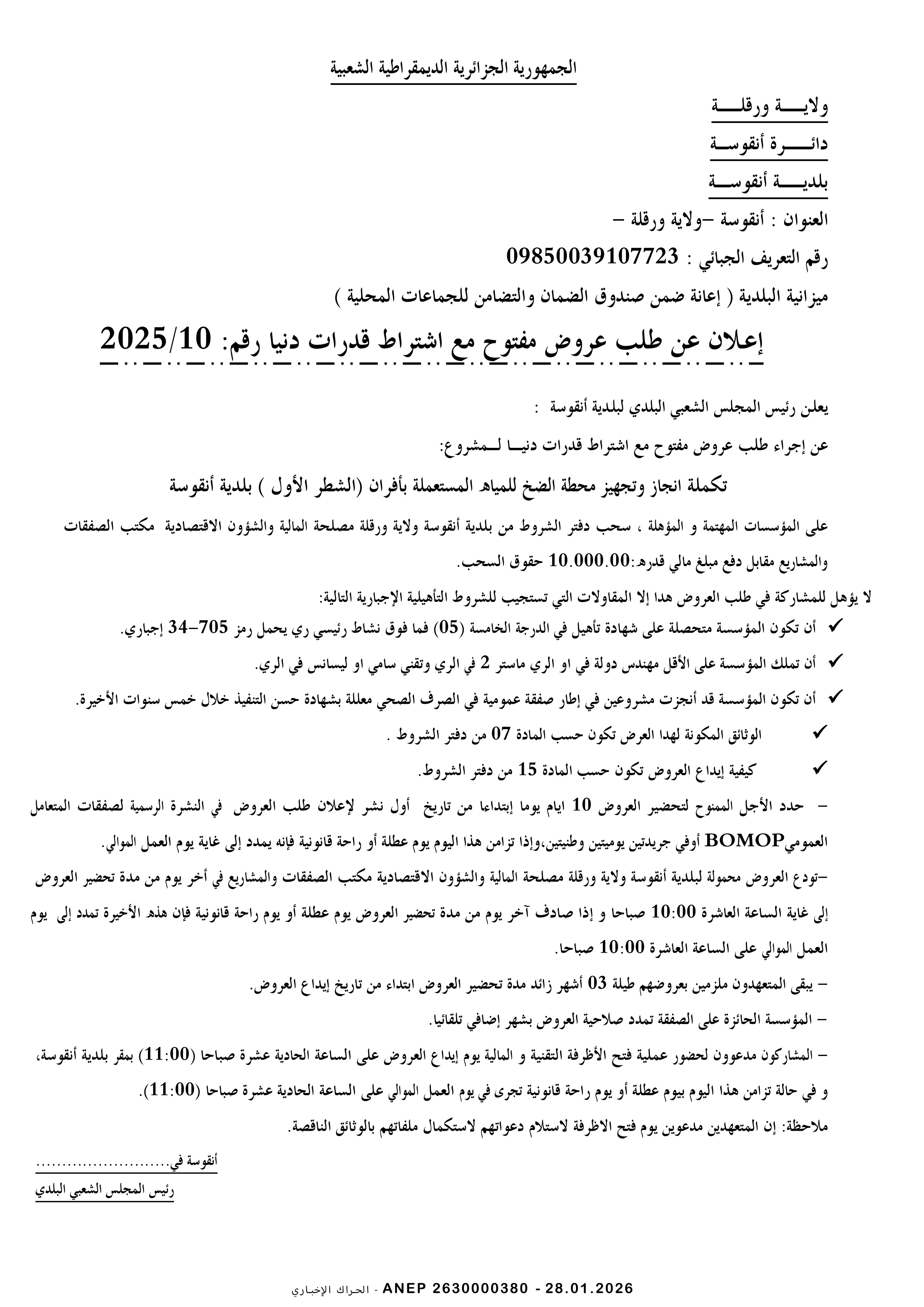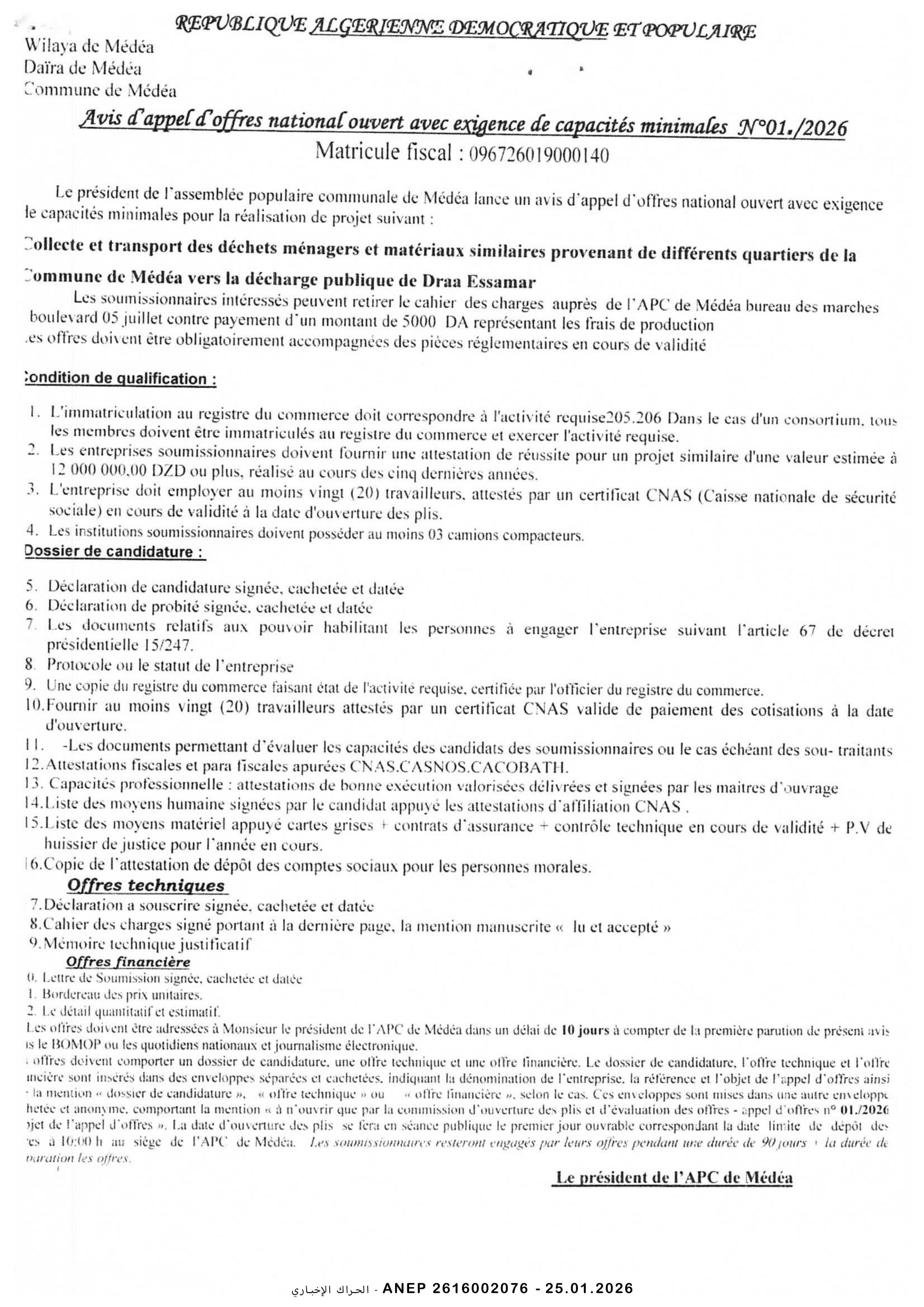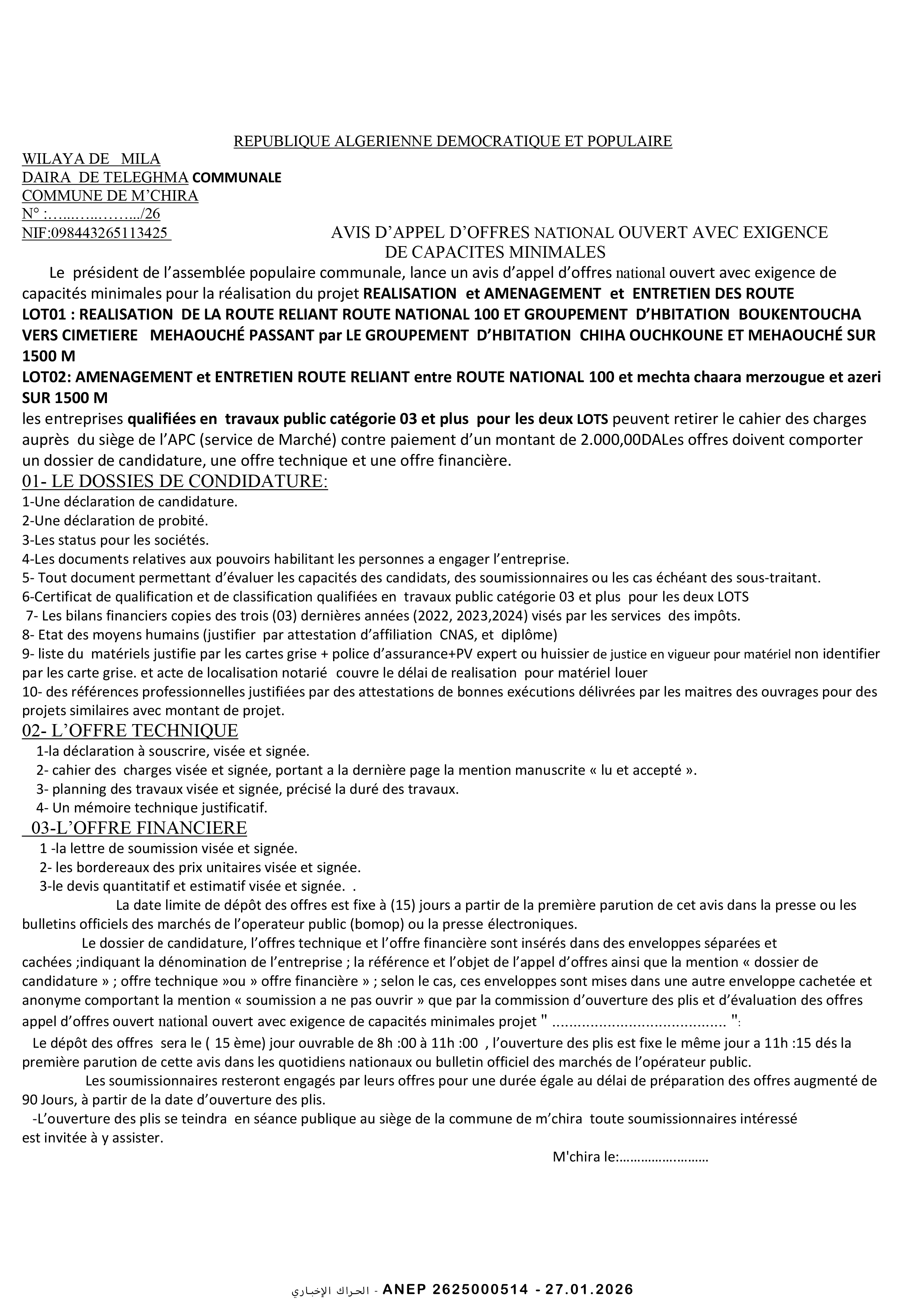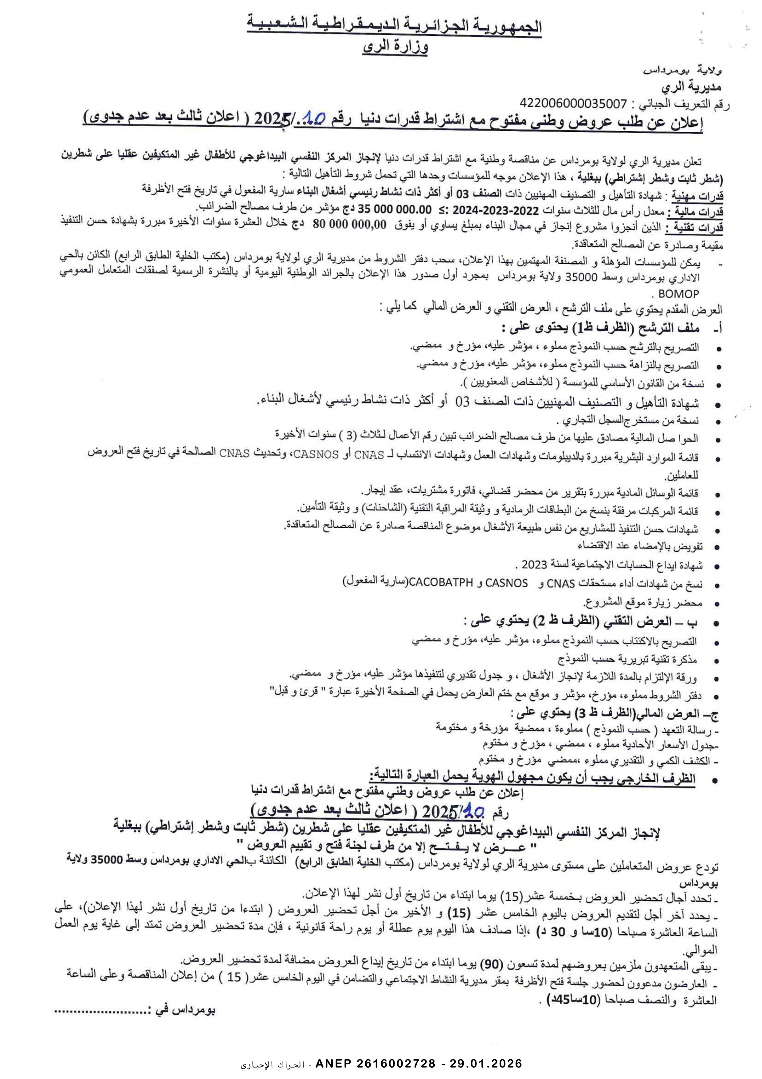 إعلان عن تصحيح طلب عروض وطني مفتوح