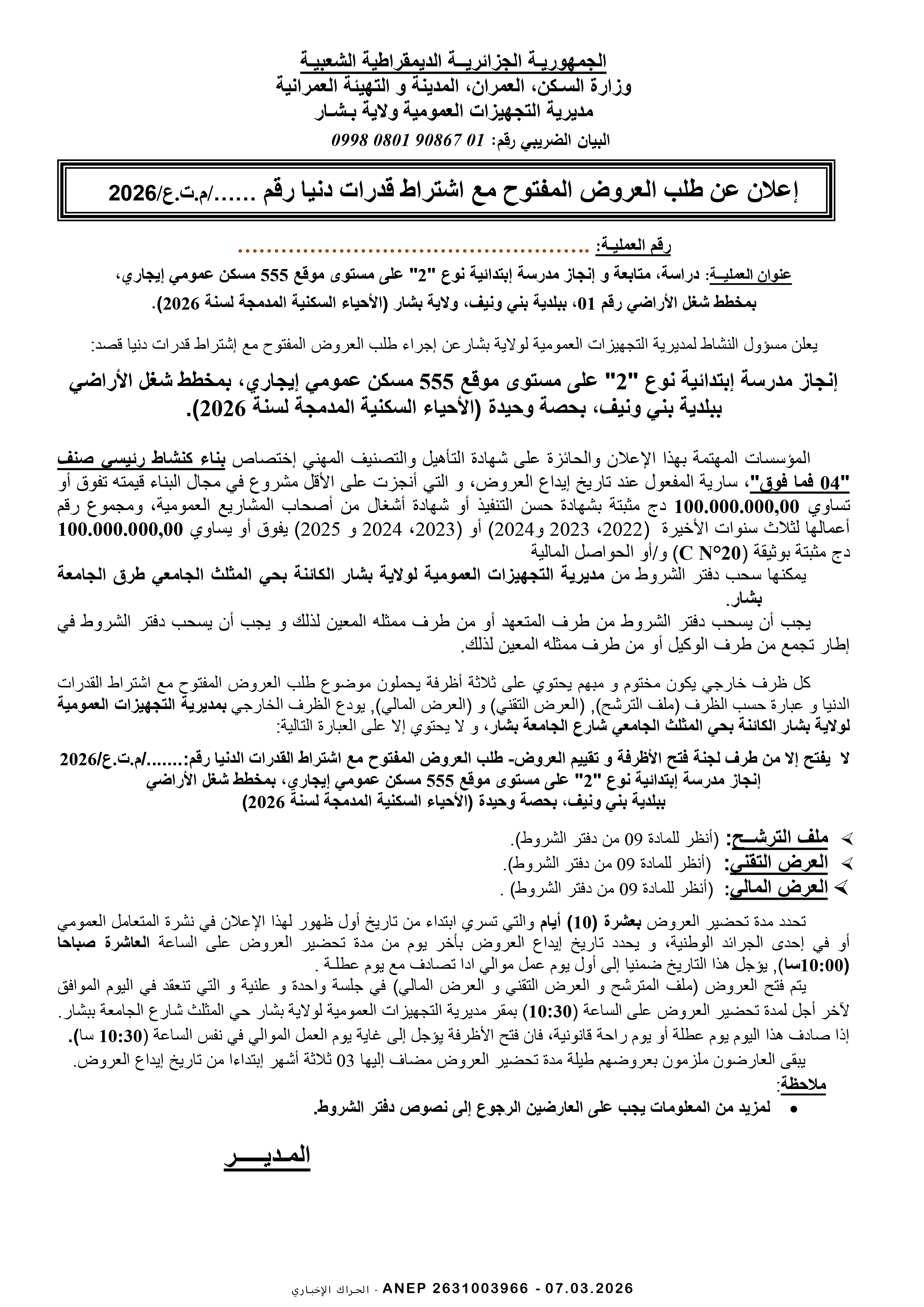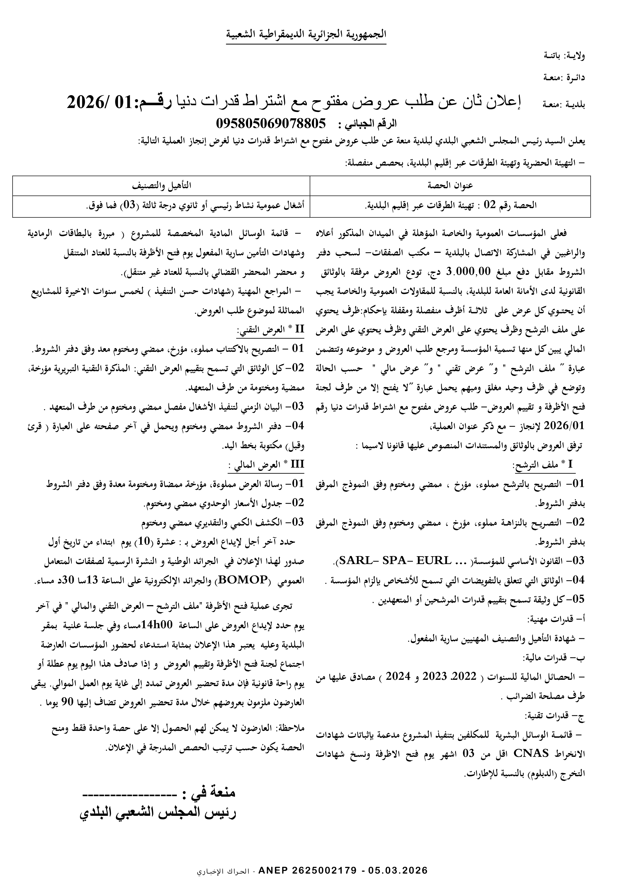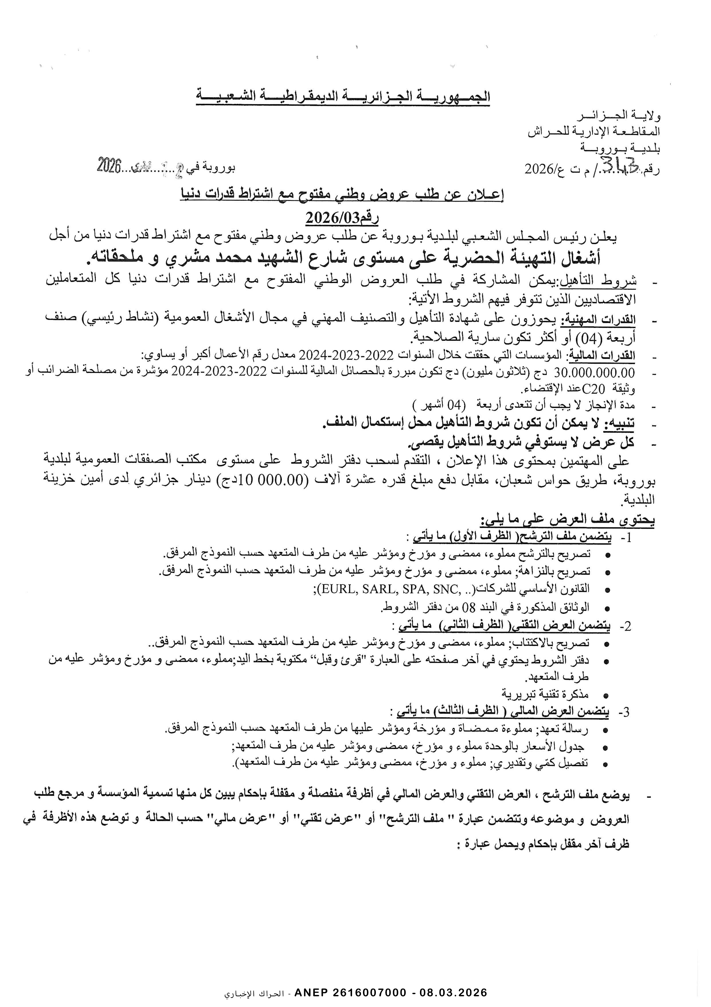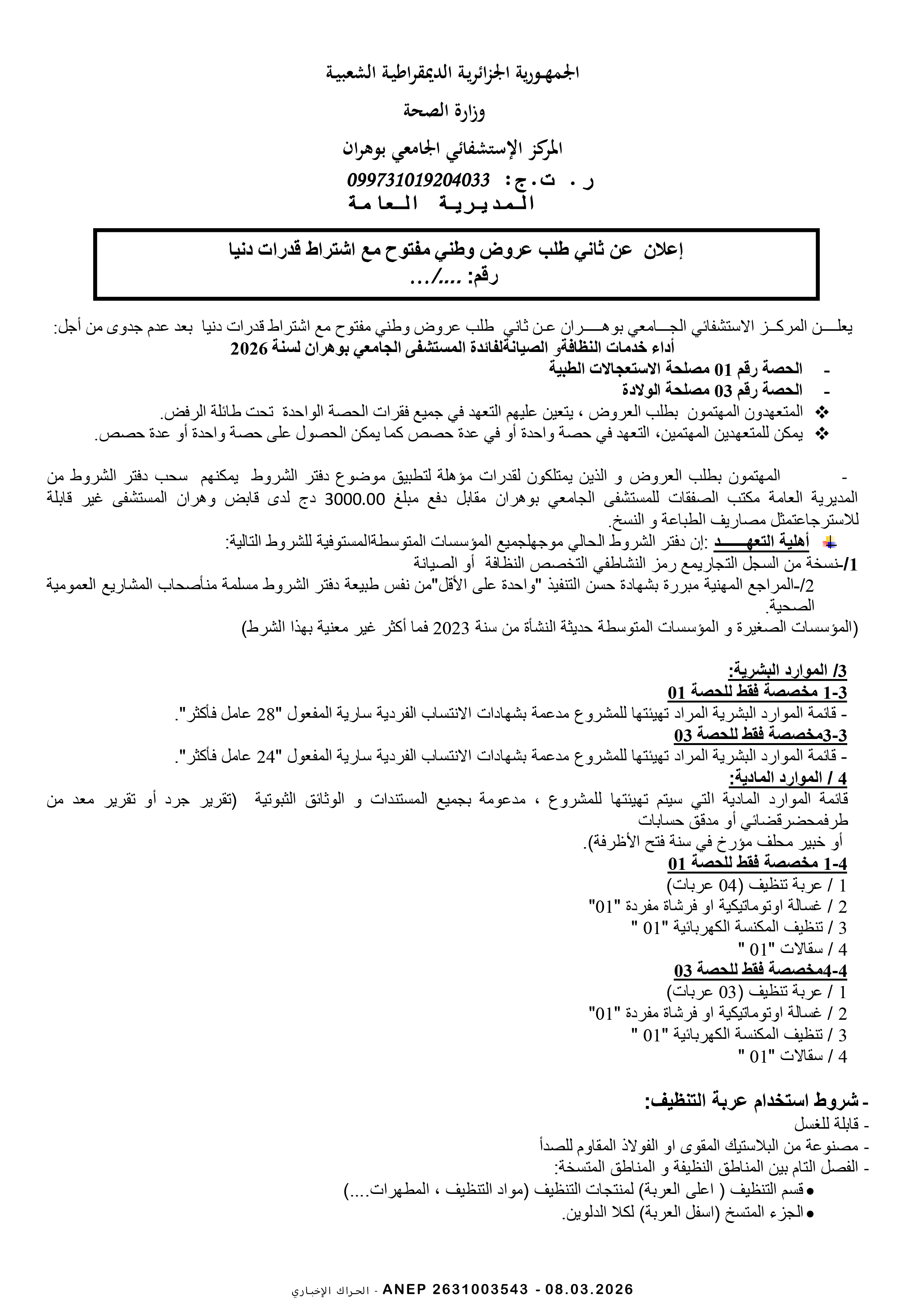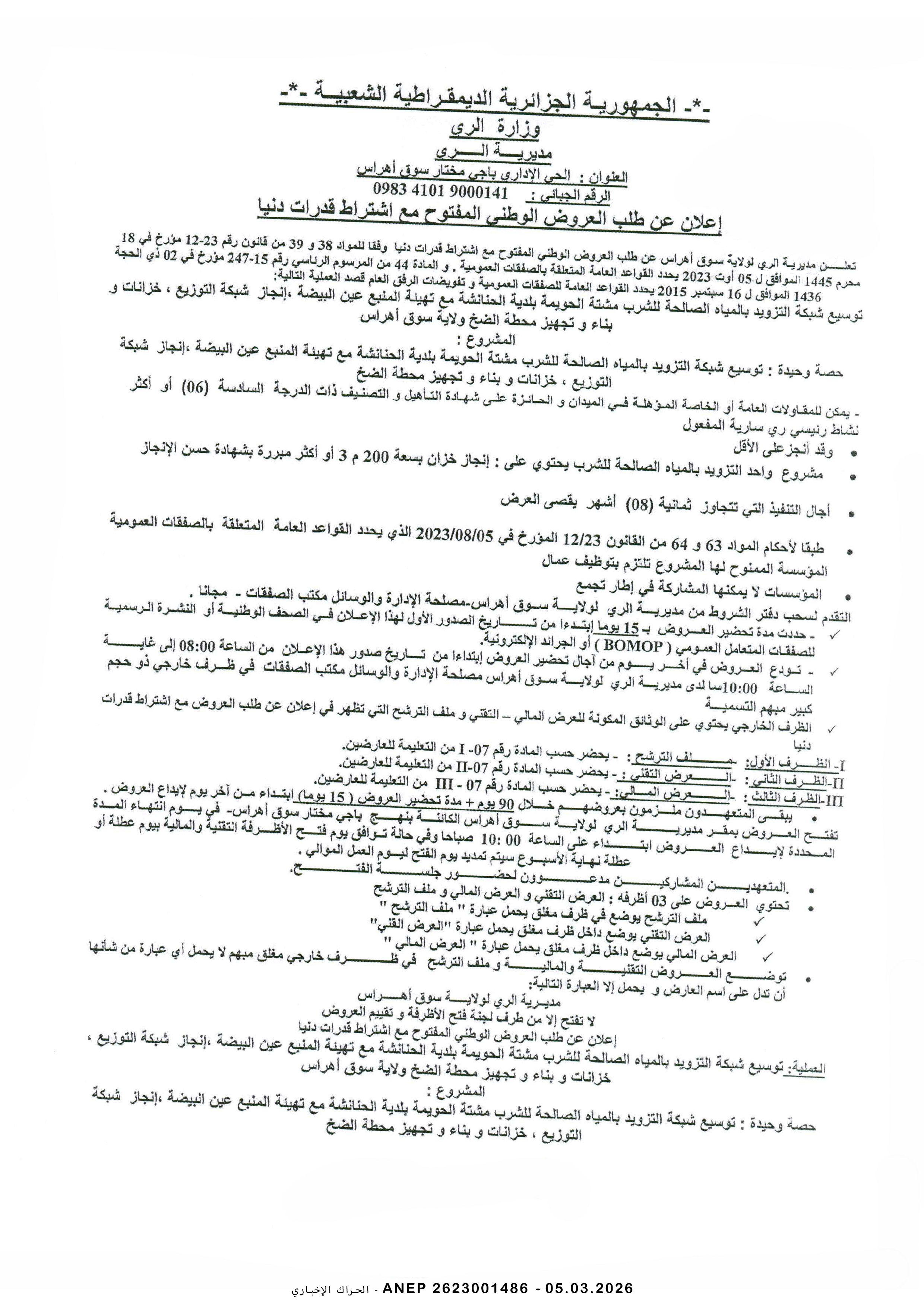 إعلان عن طلب عروض وطني محدود