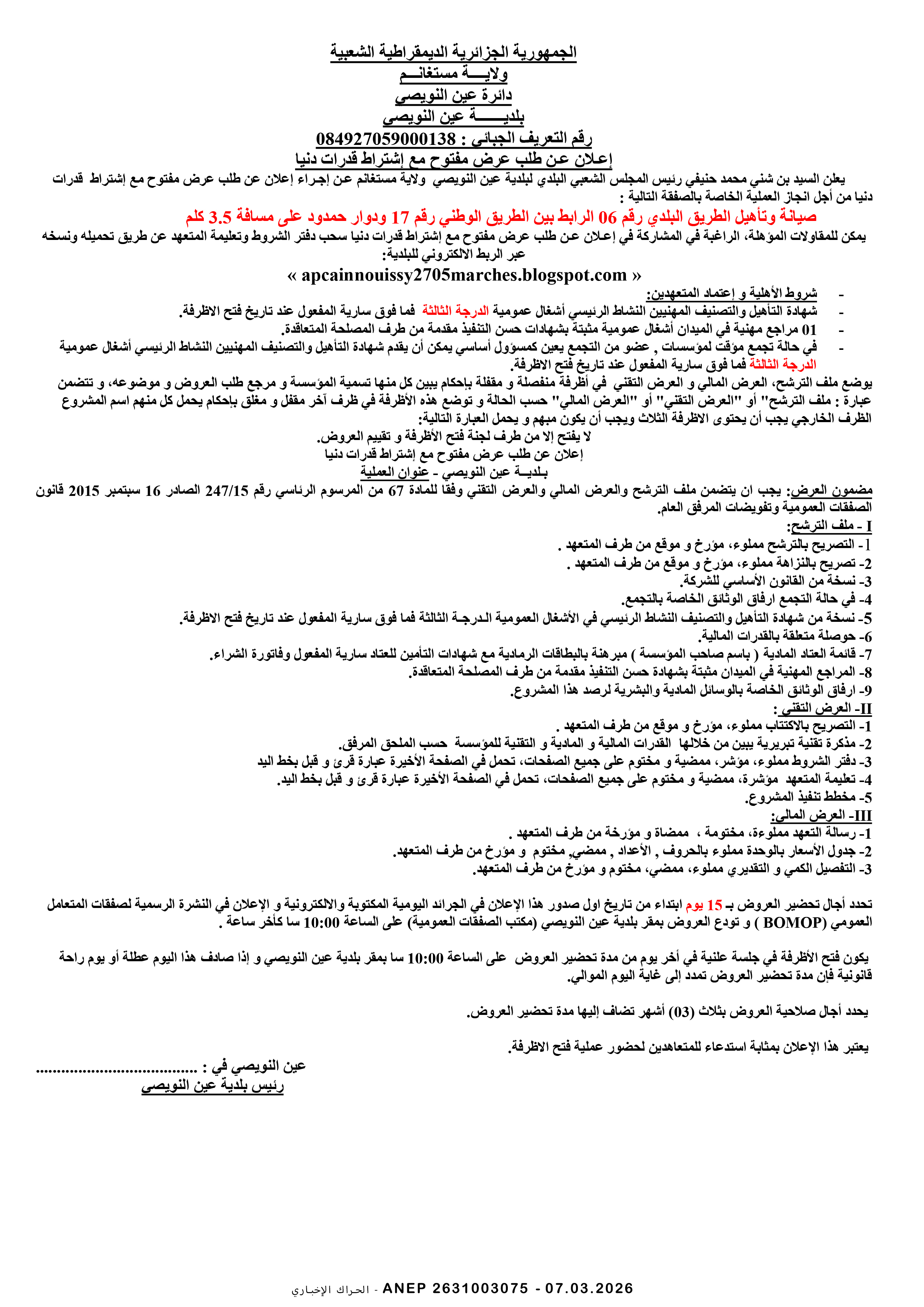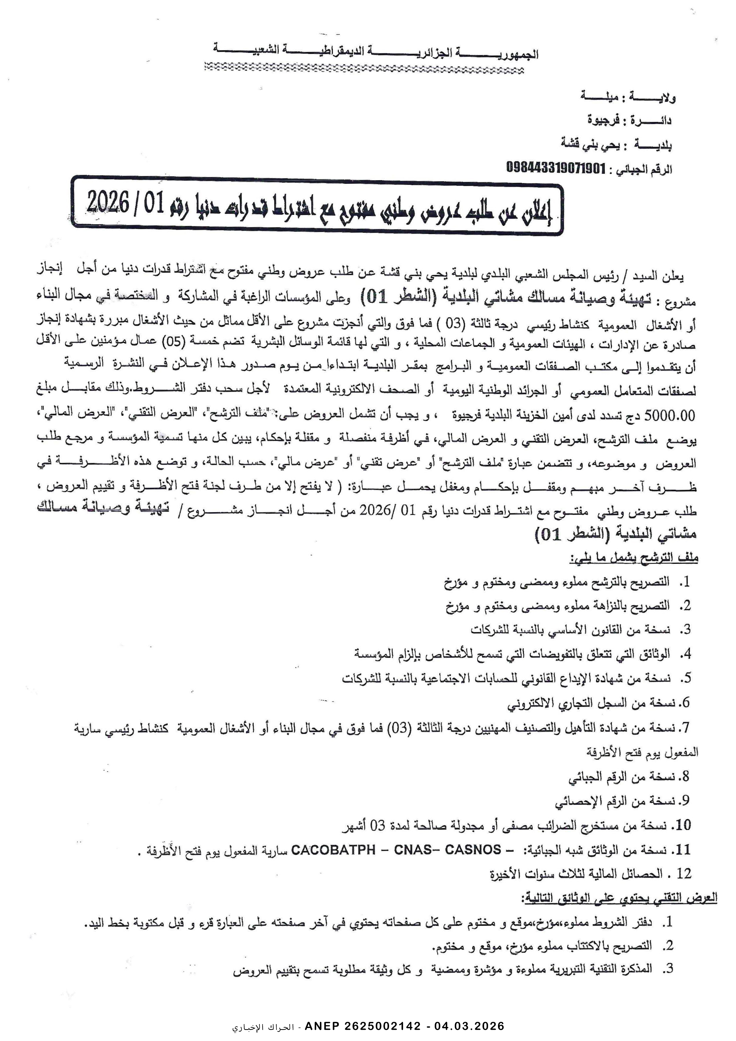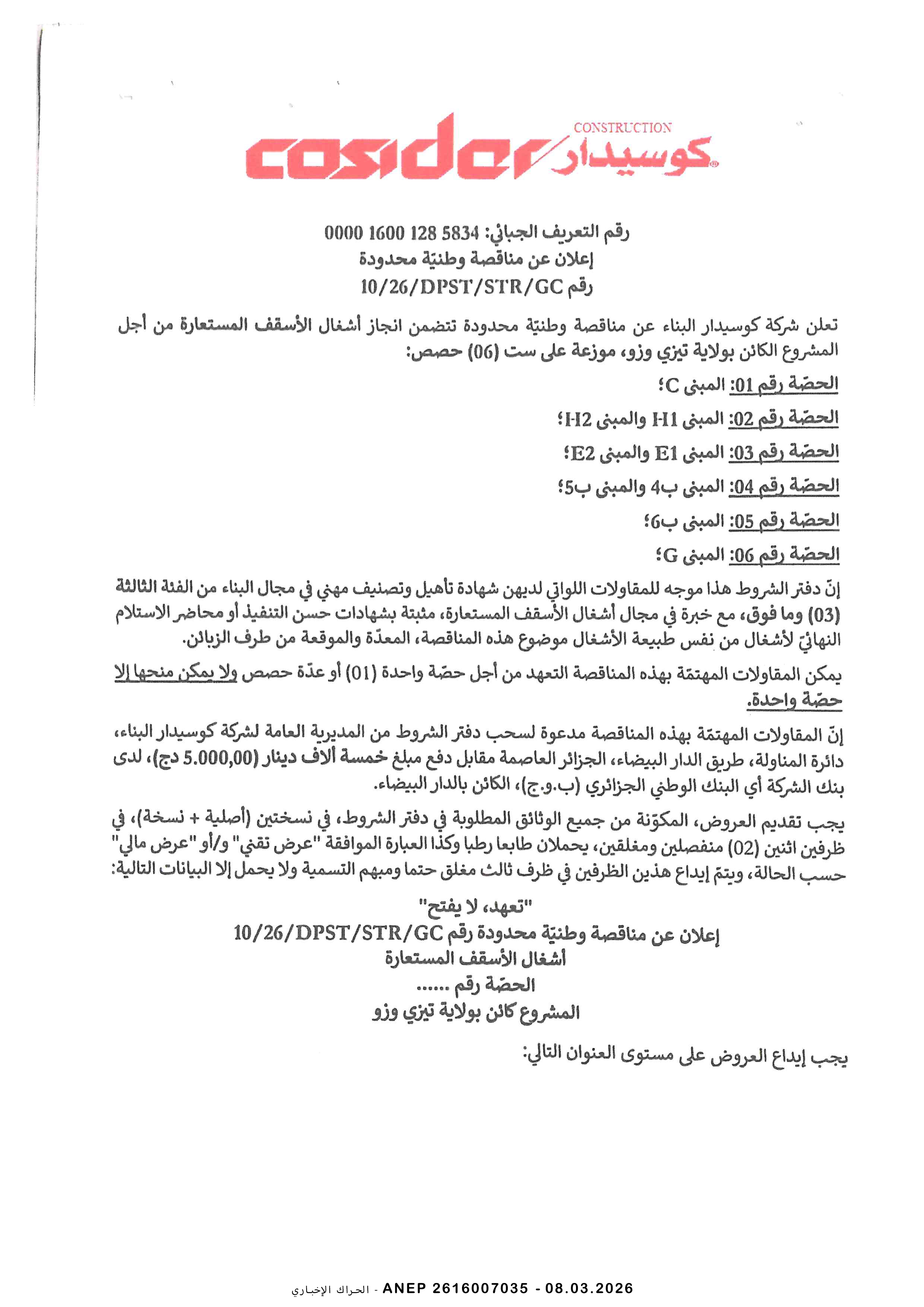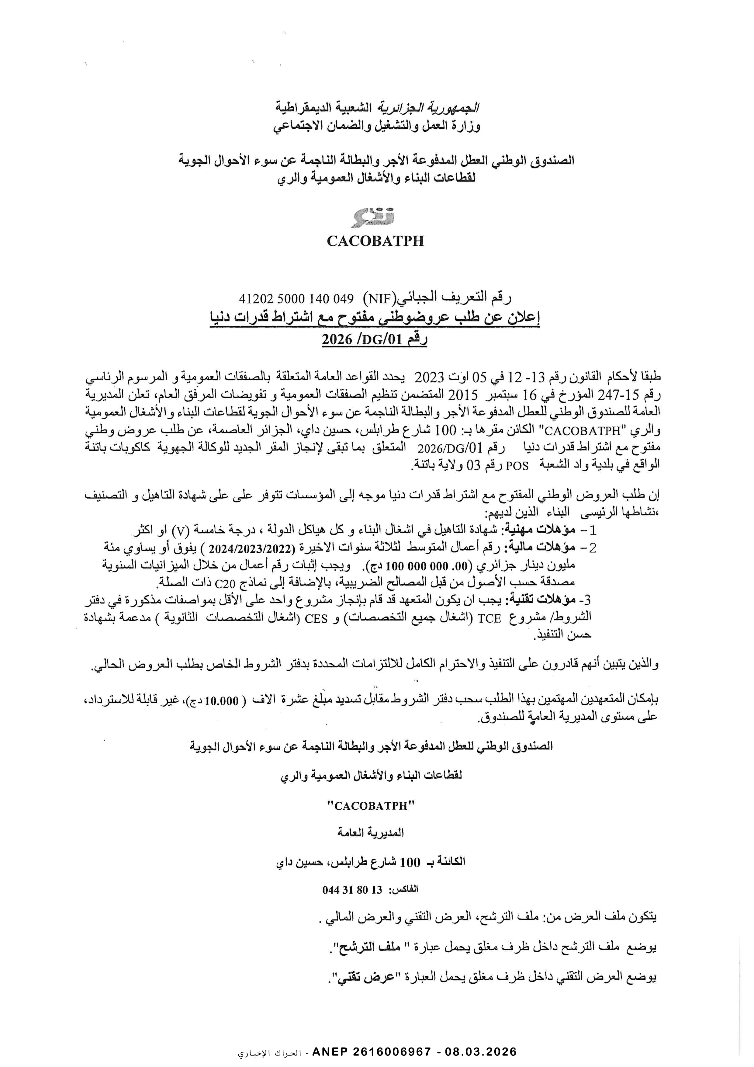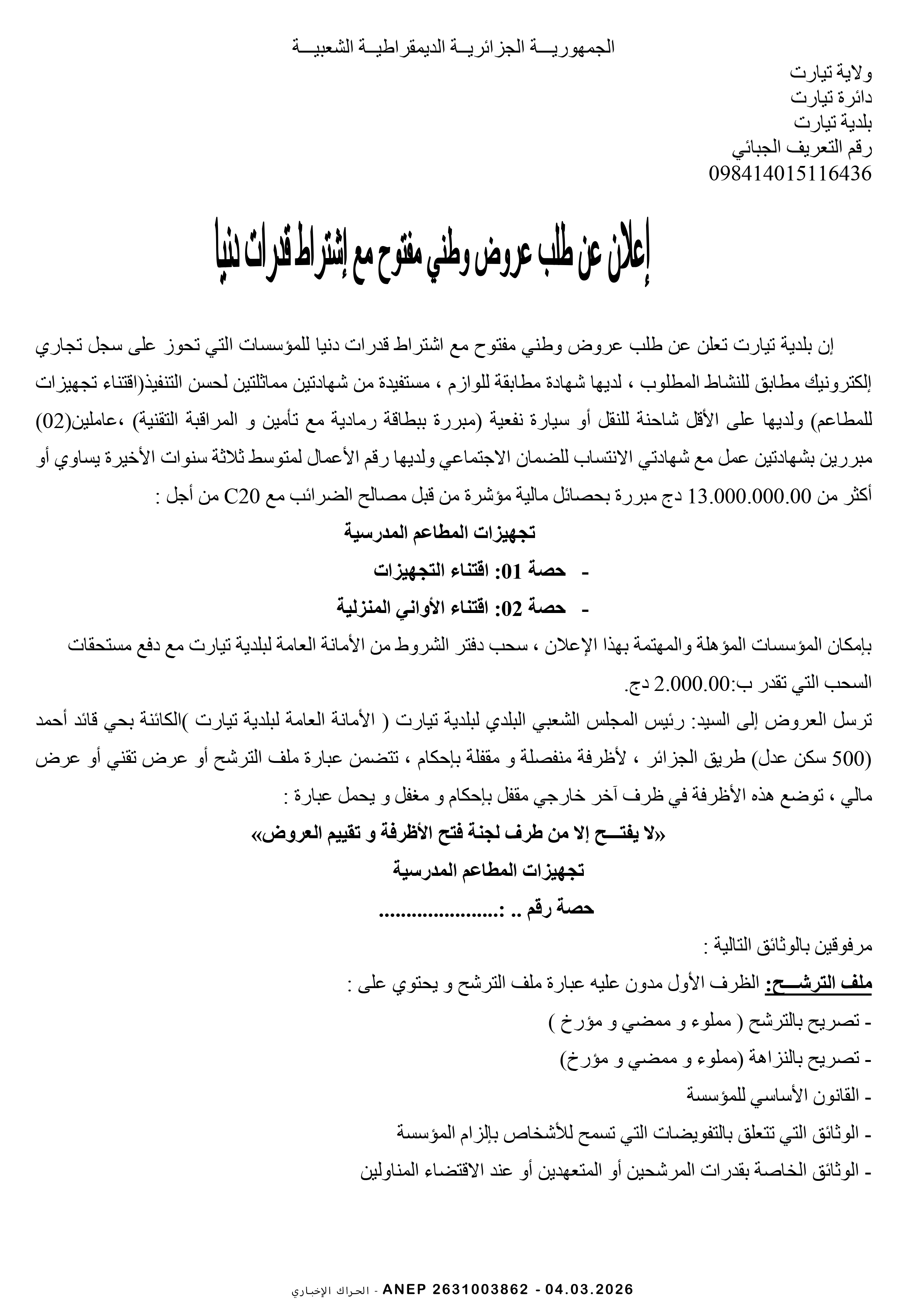 إعلان عن طلب عروض وطني محدود