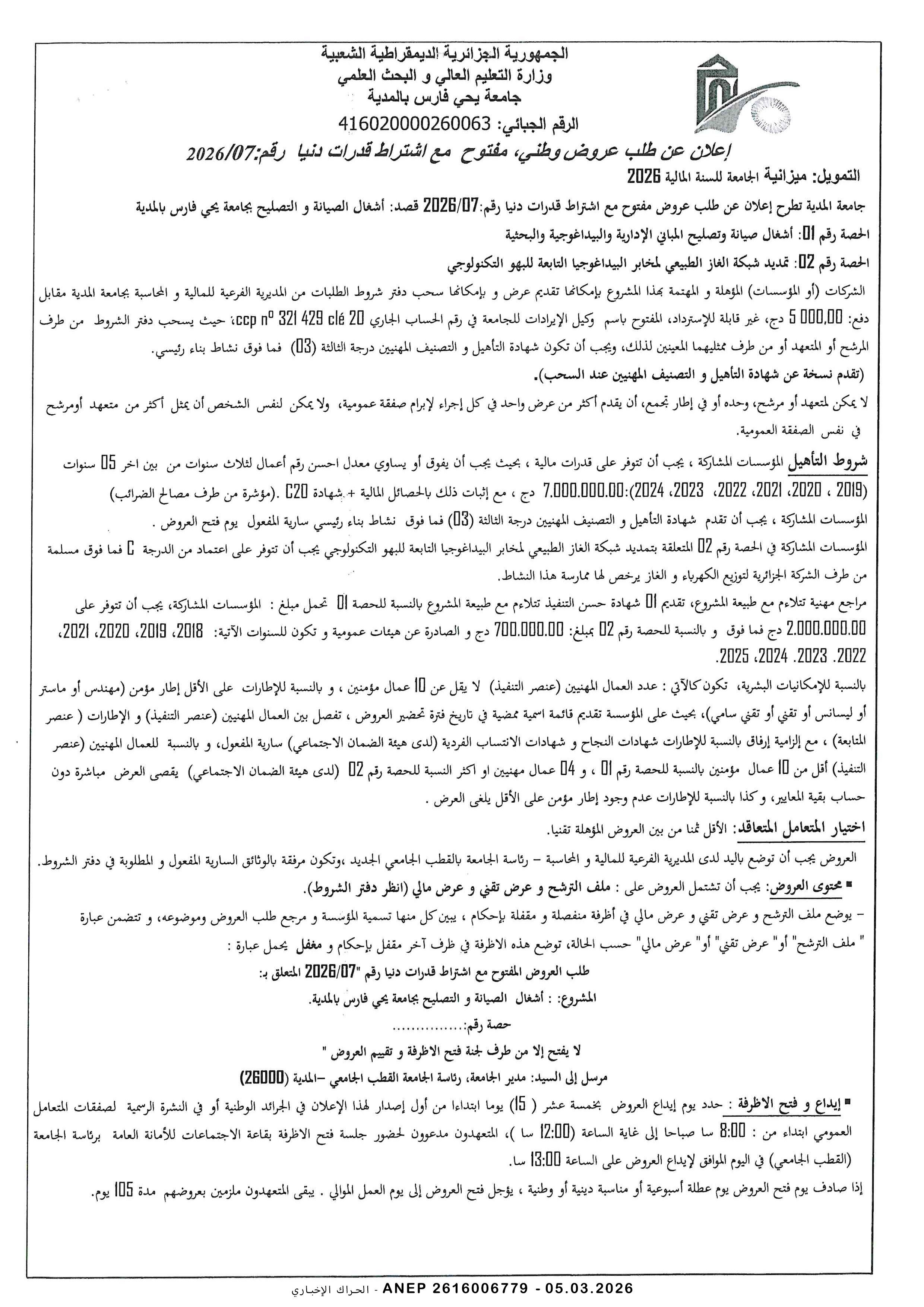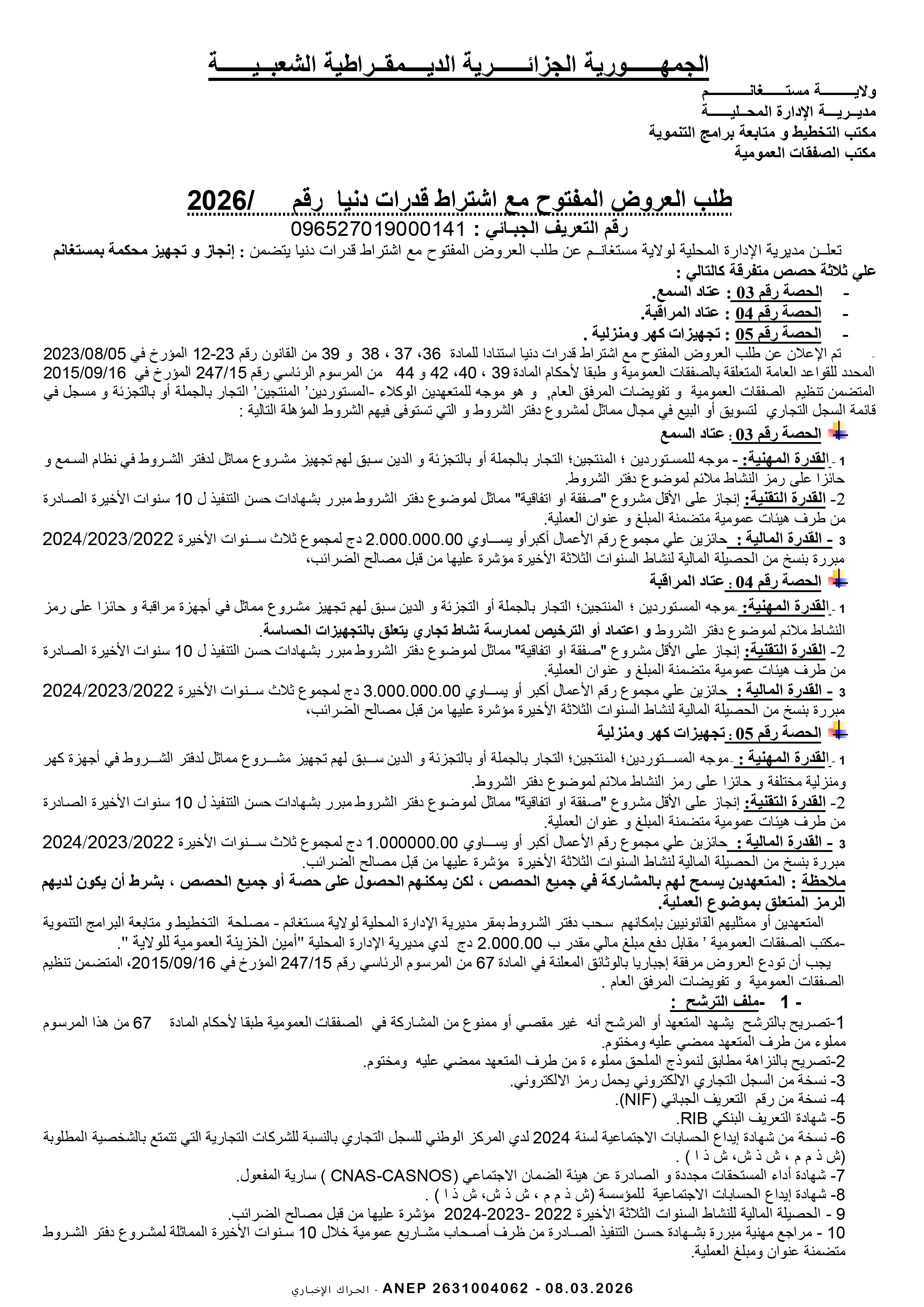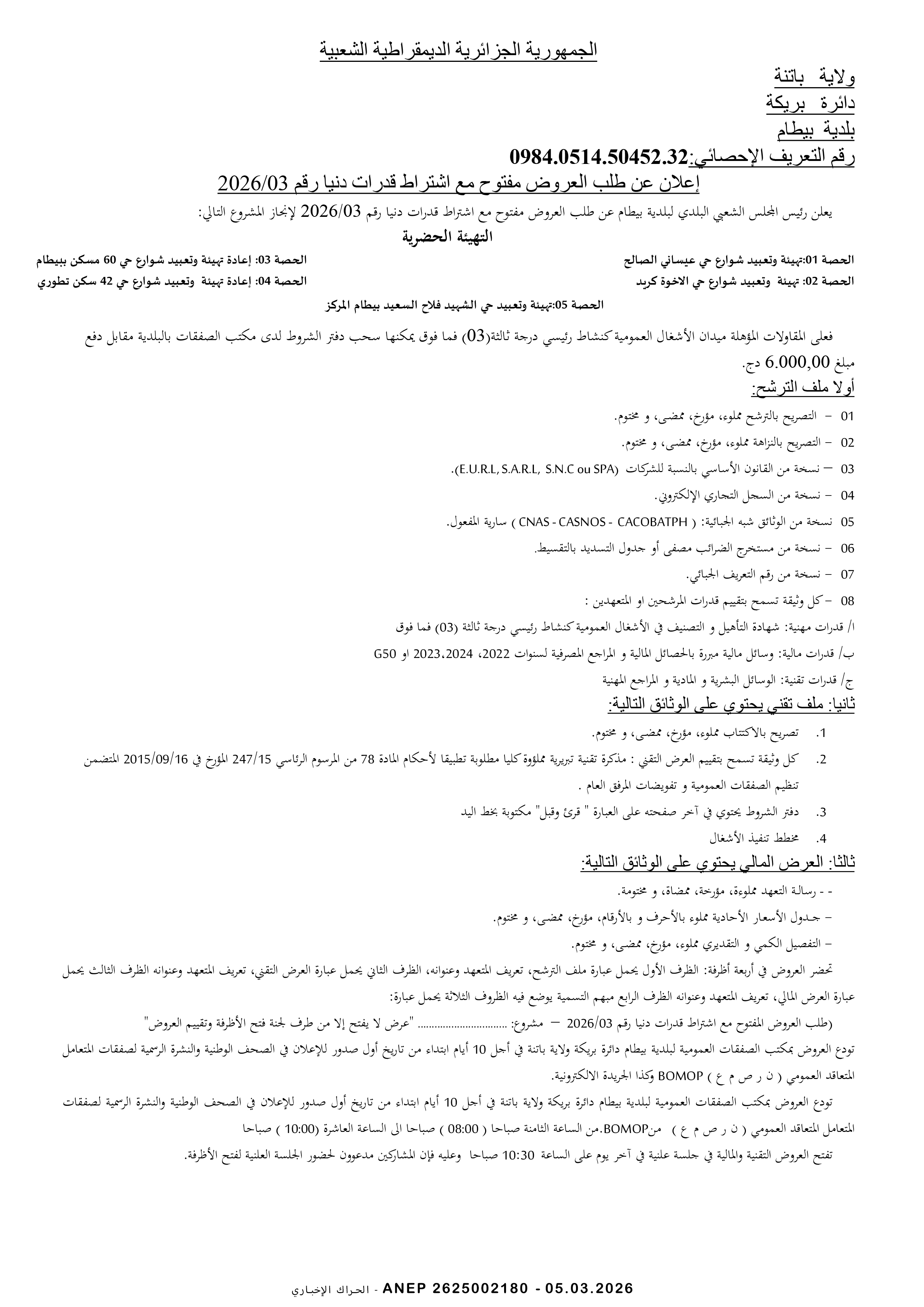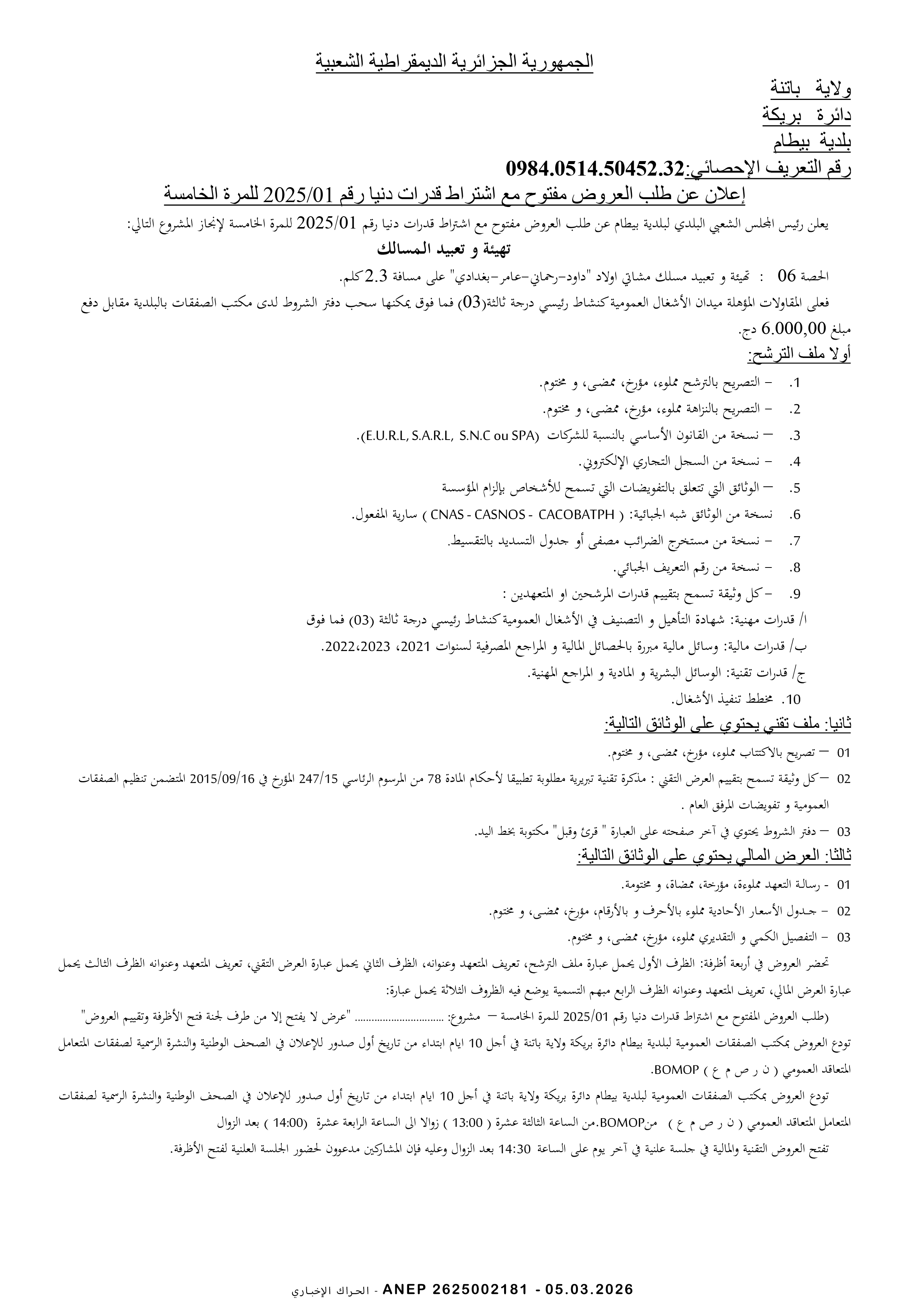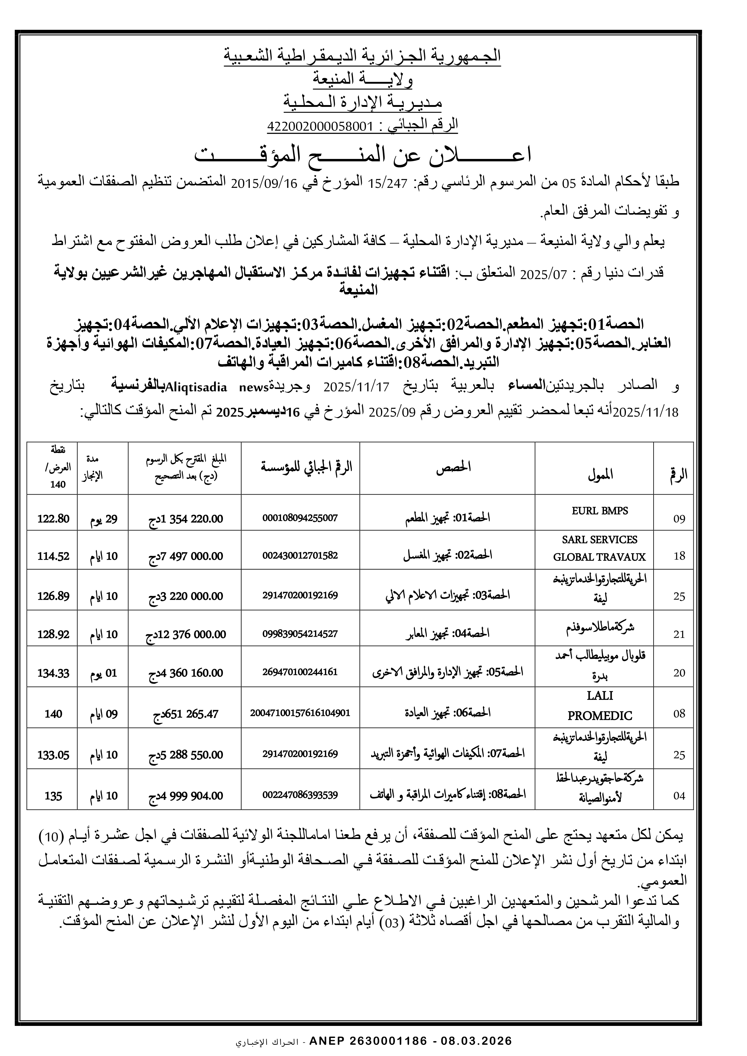 إعلان عن طلب عروض وطني محدود