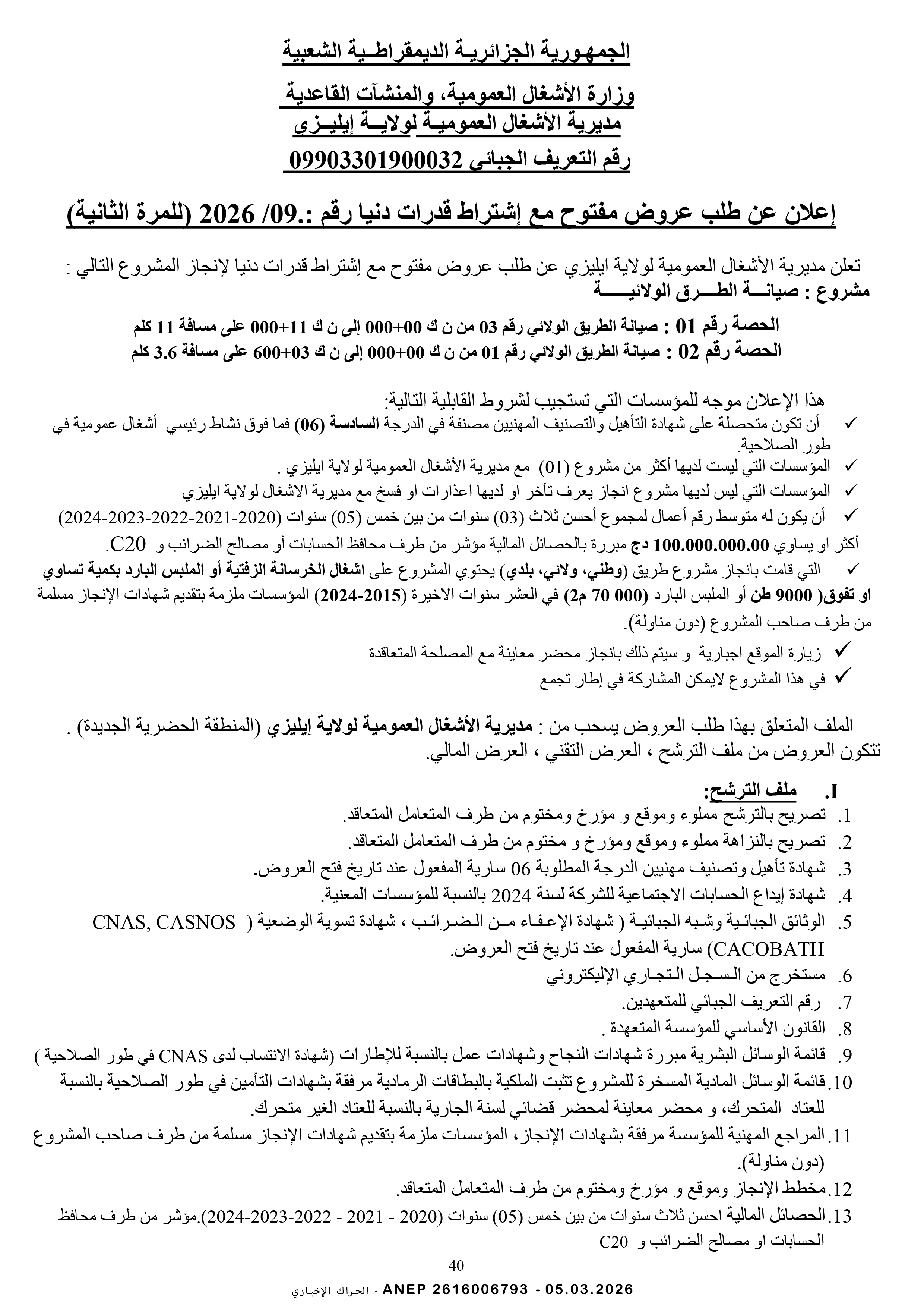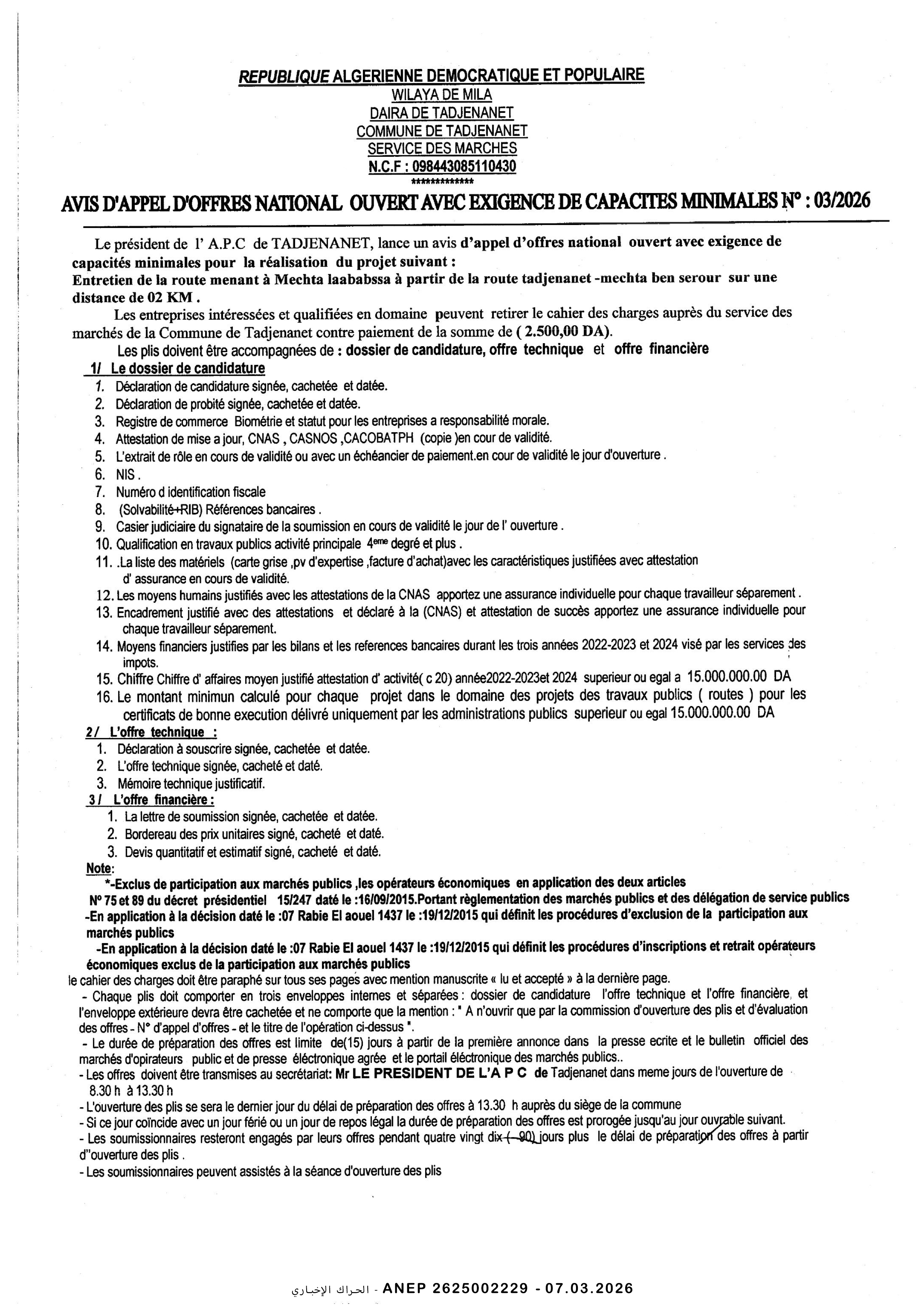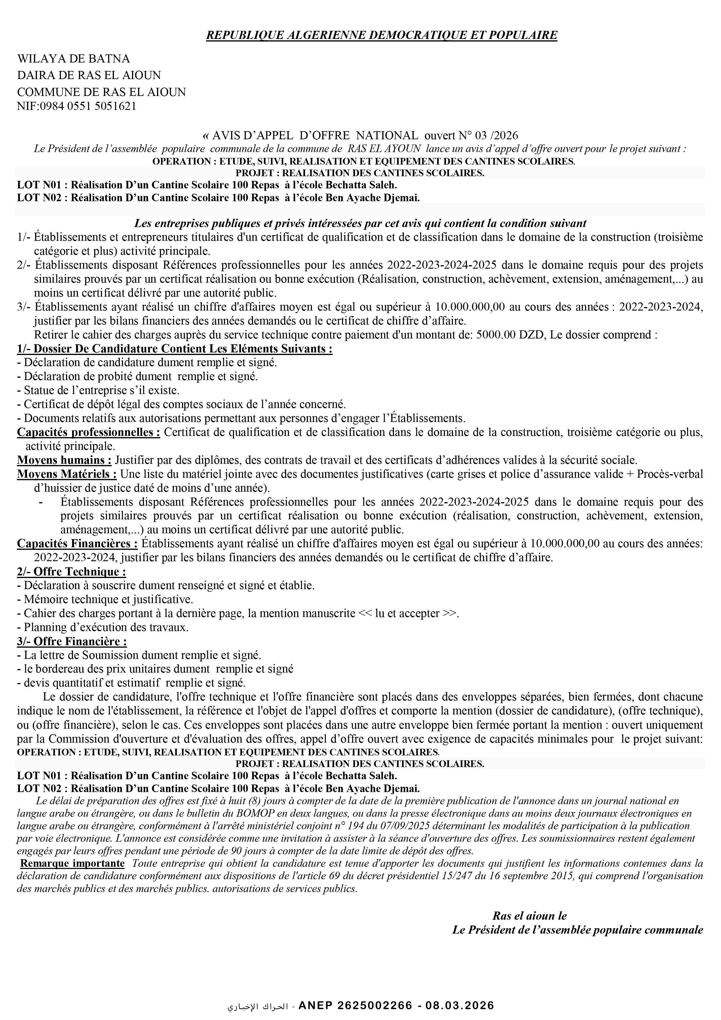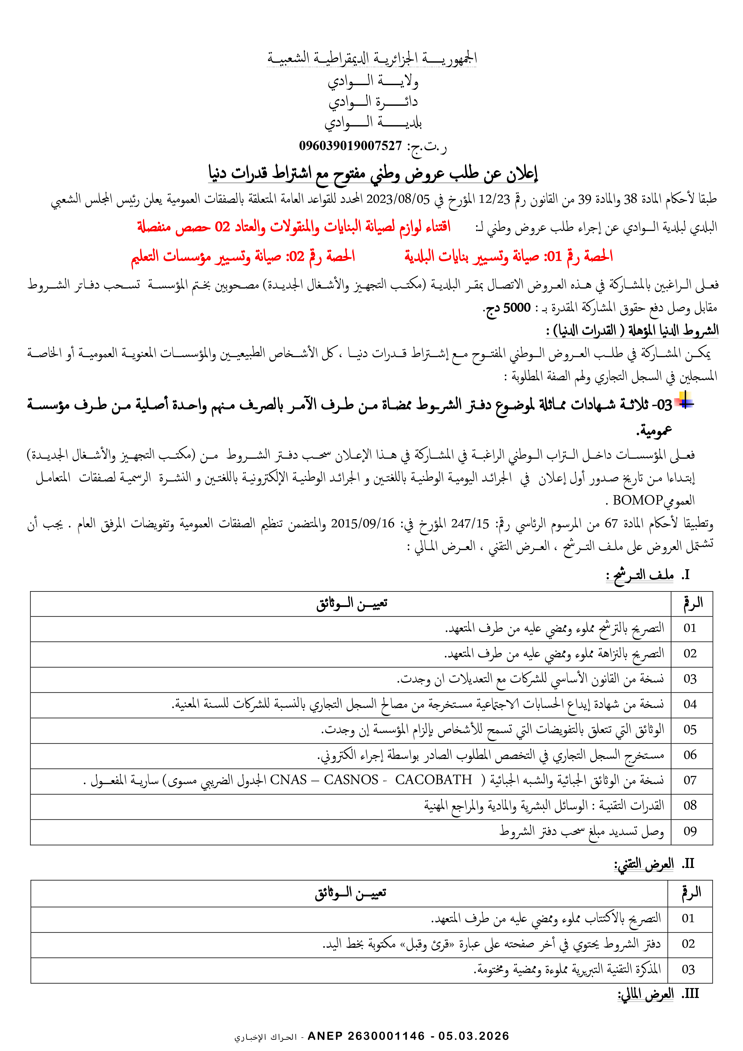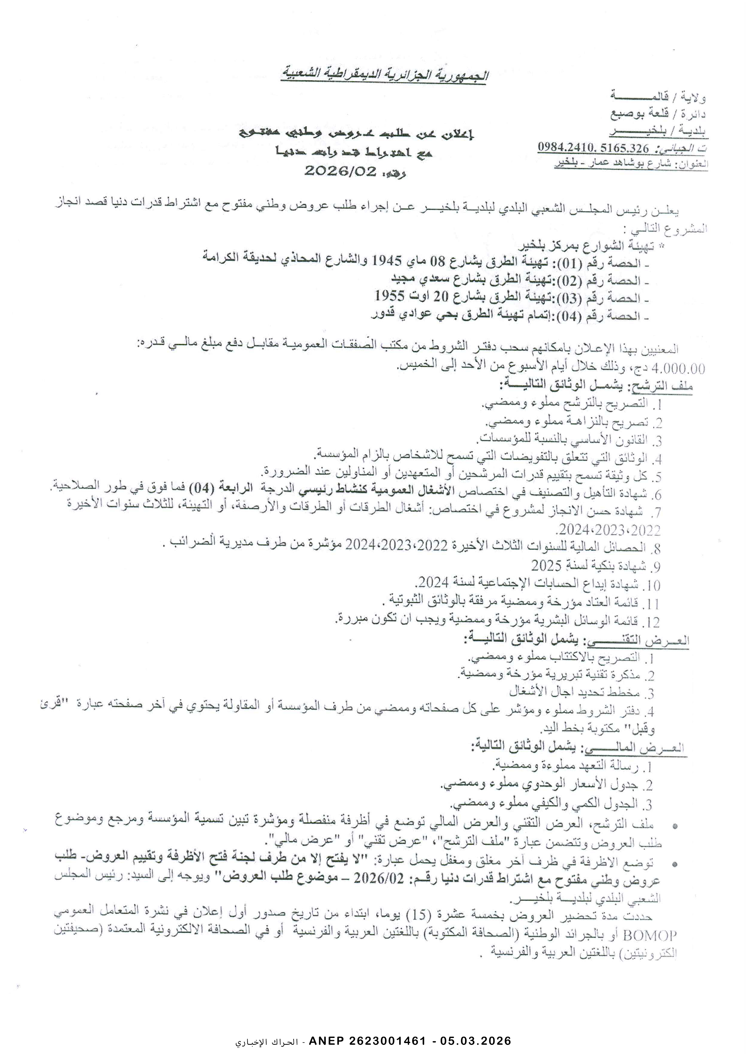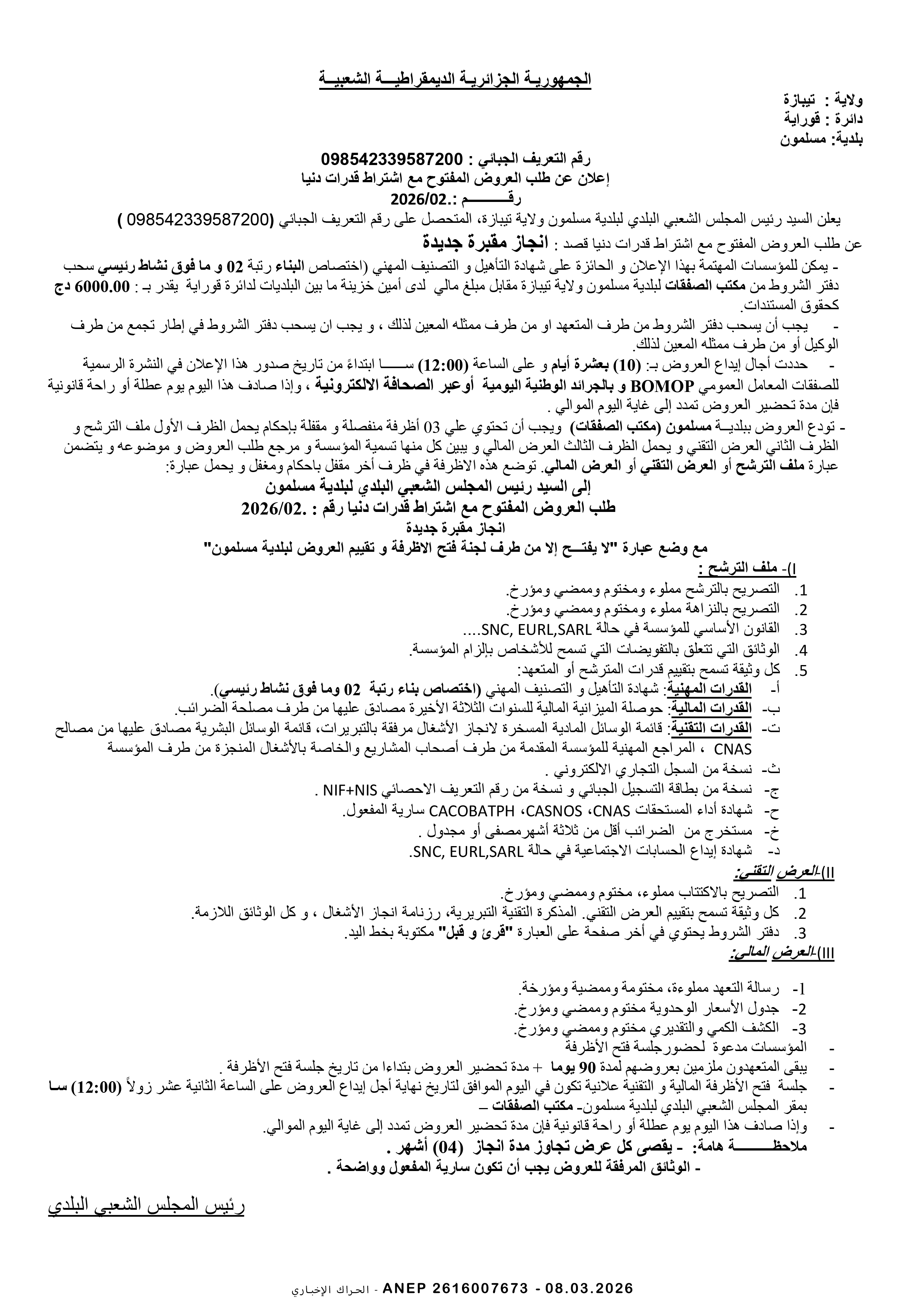 إعلان عن طلب عروض وطني محدود