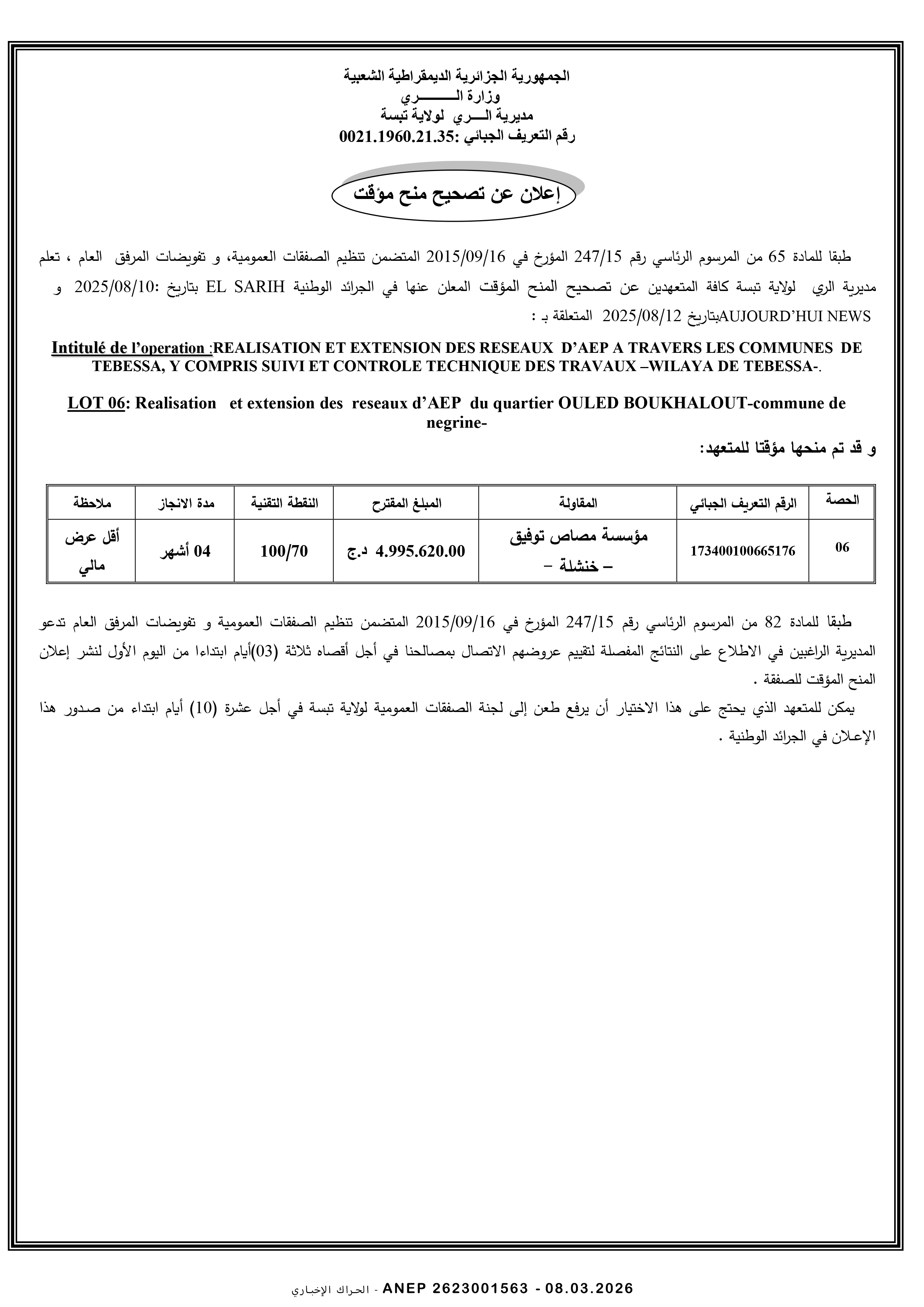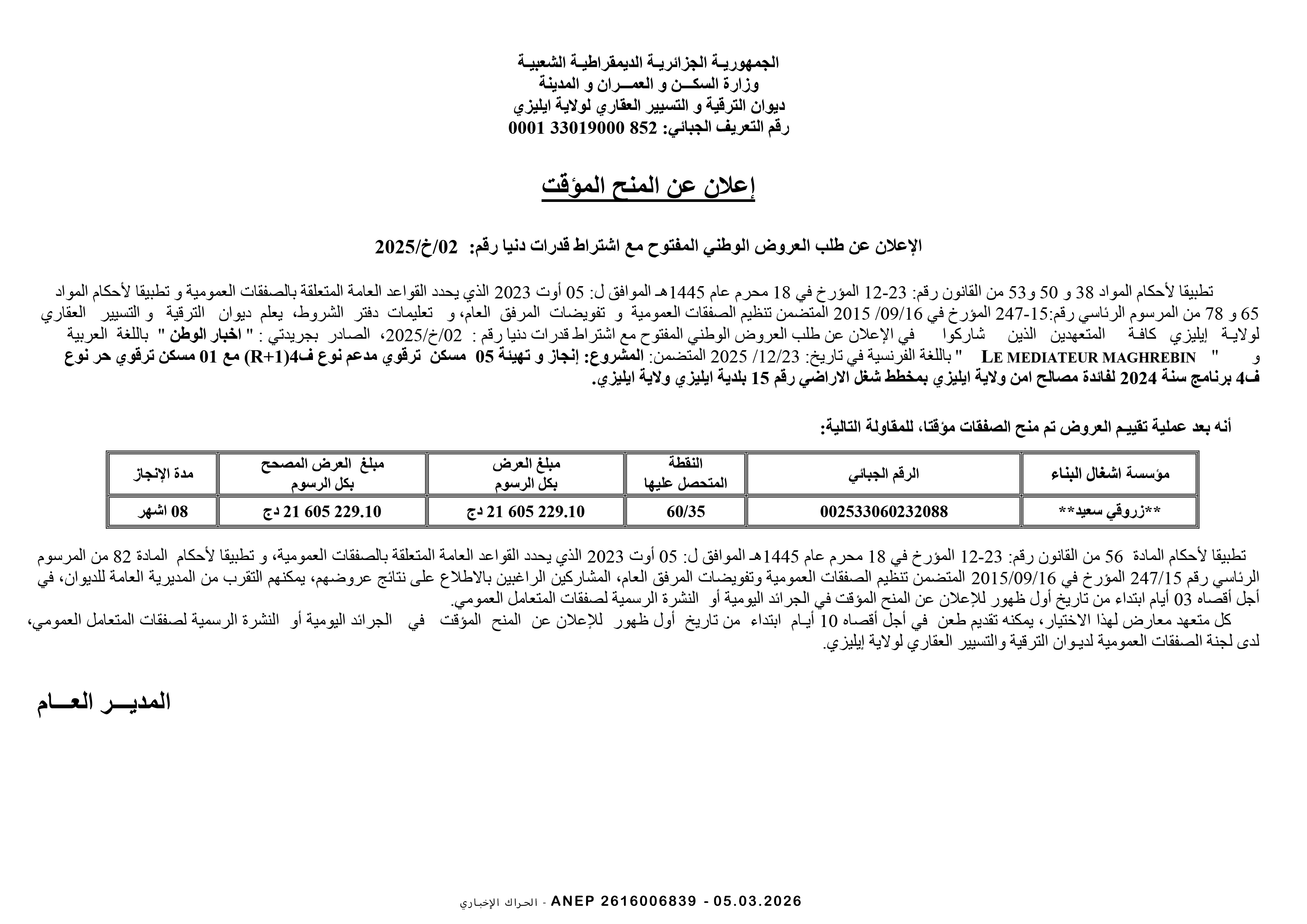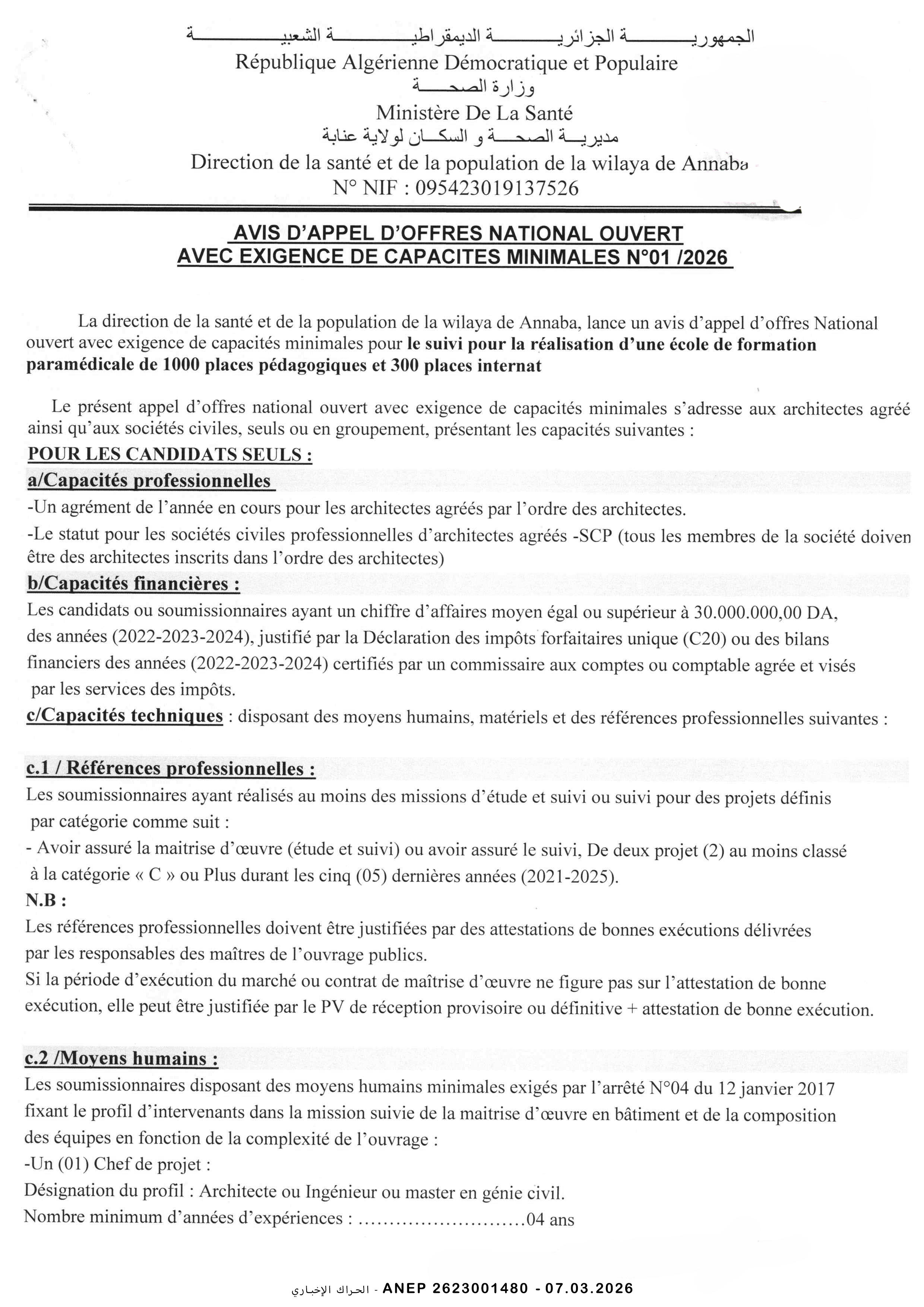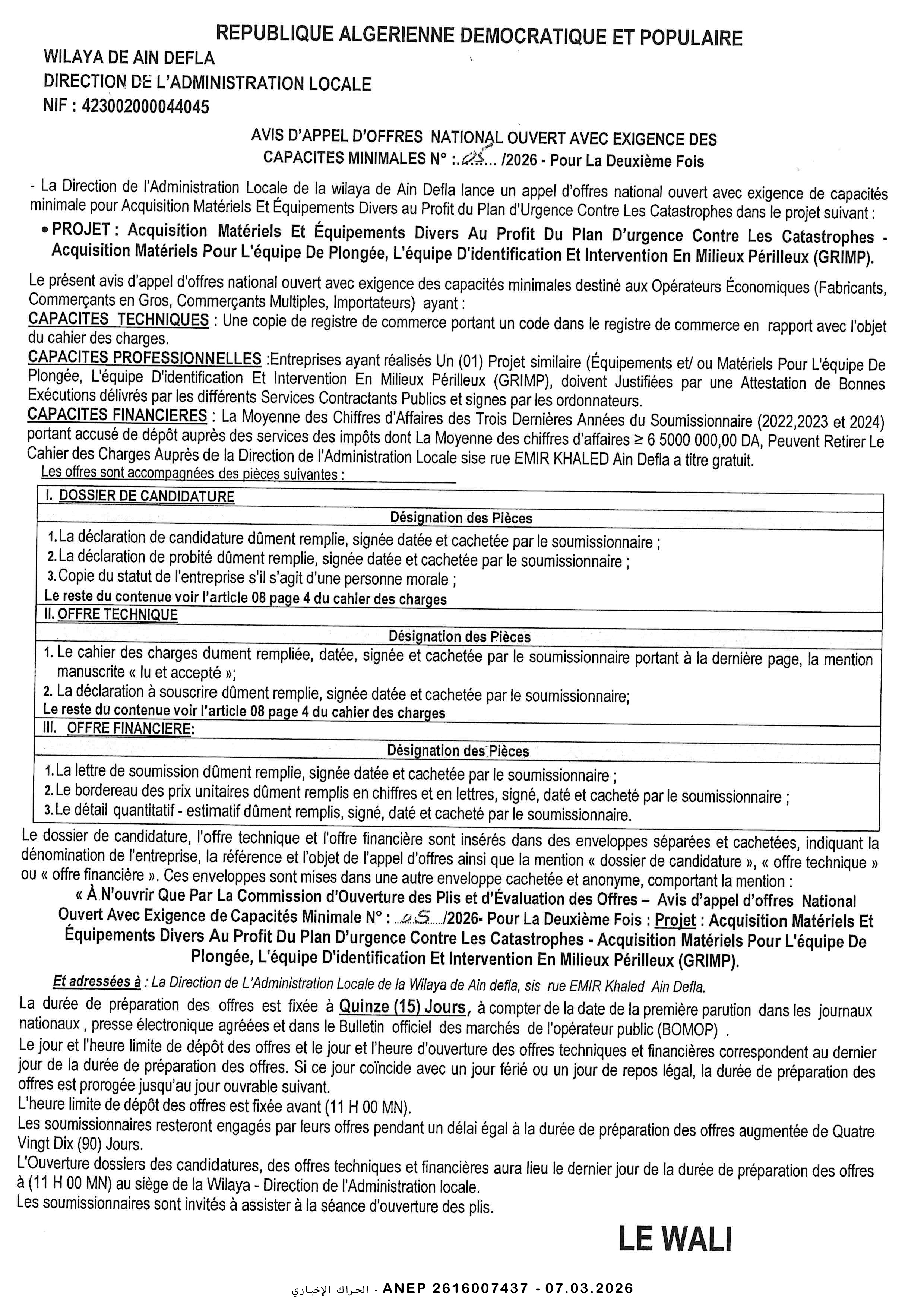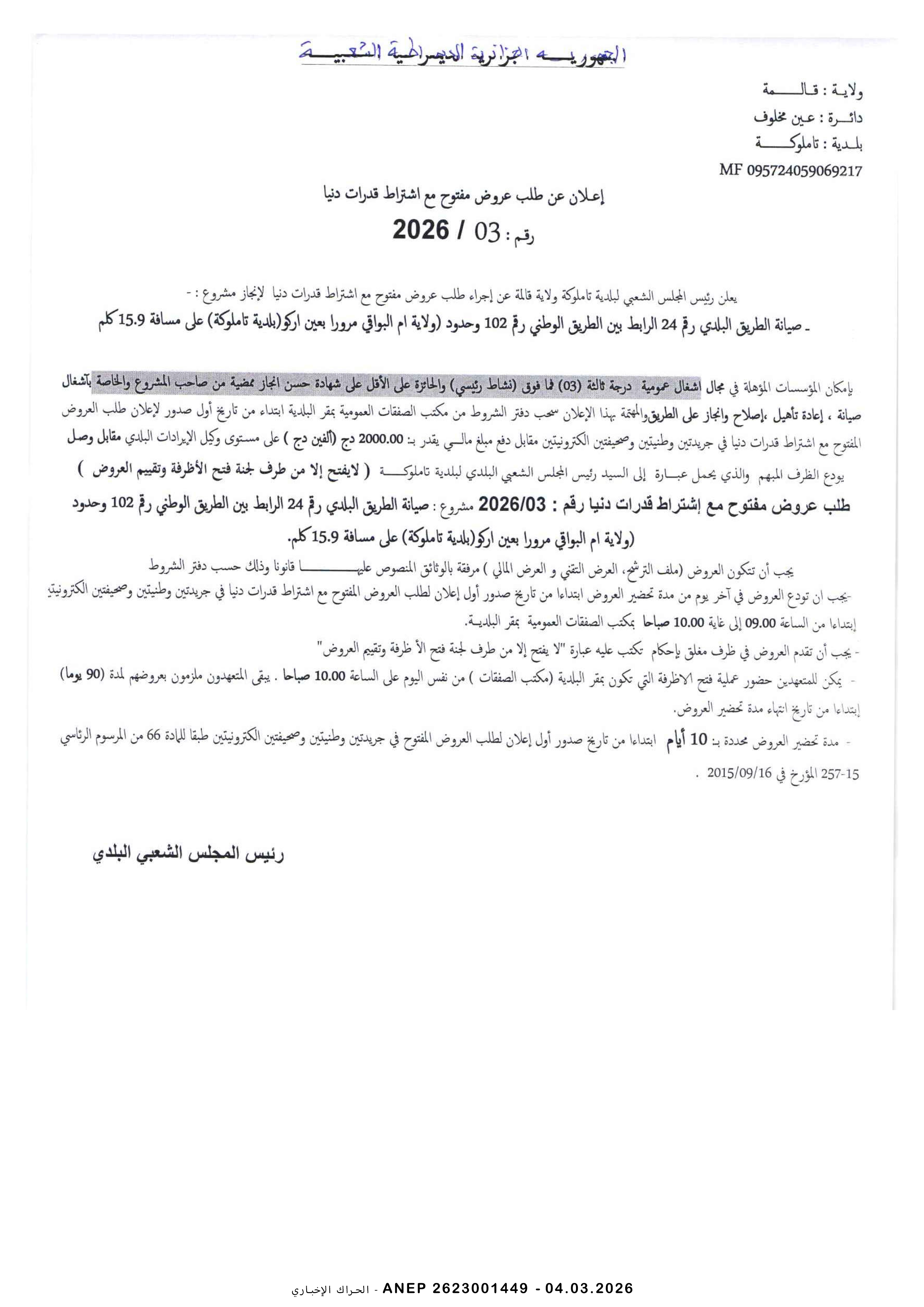 إعلان عن طلب عروض وطني محدود