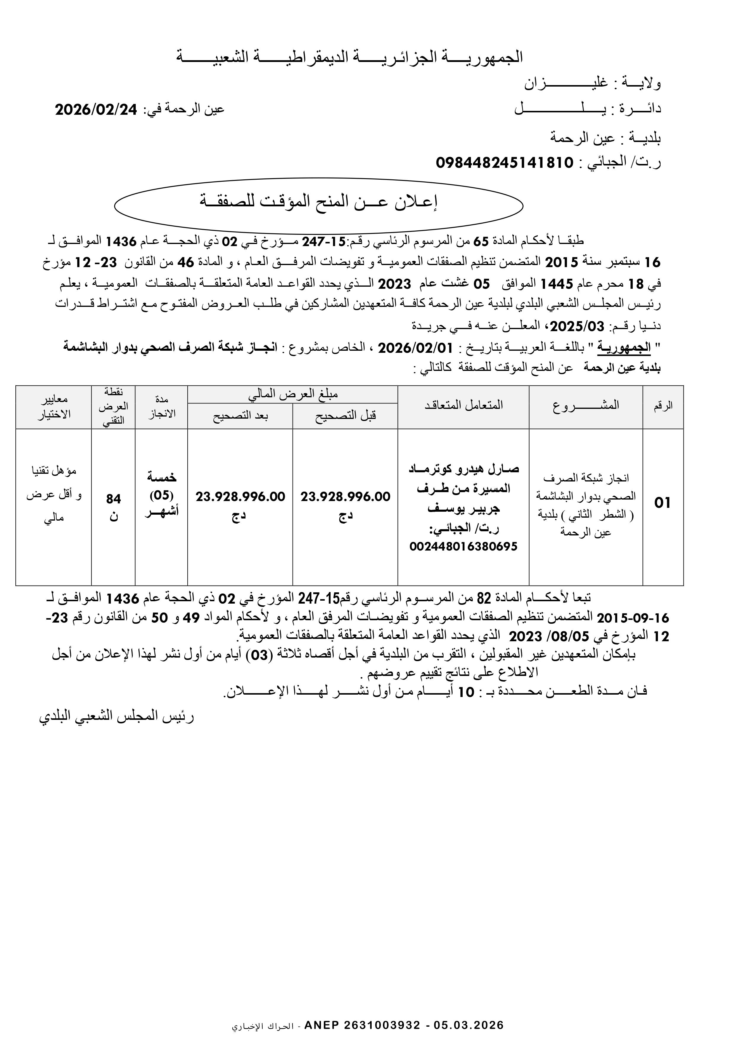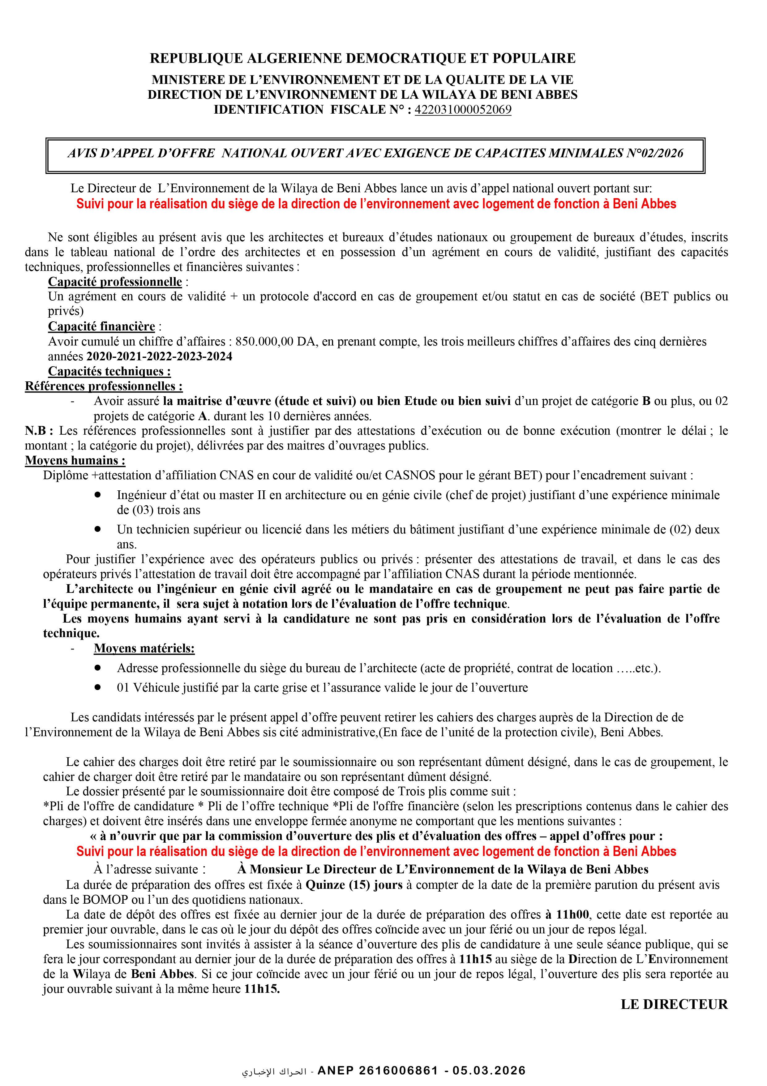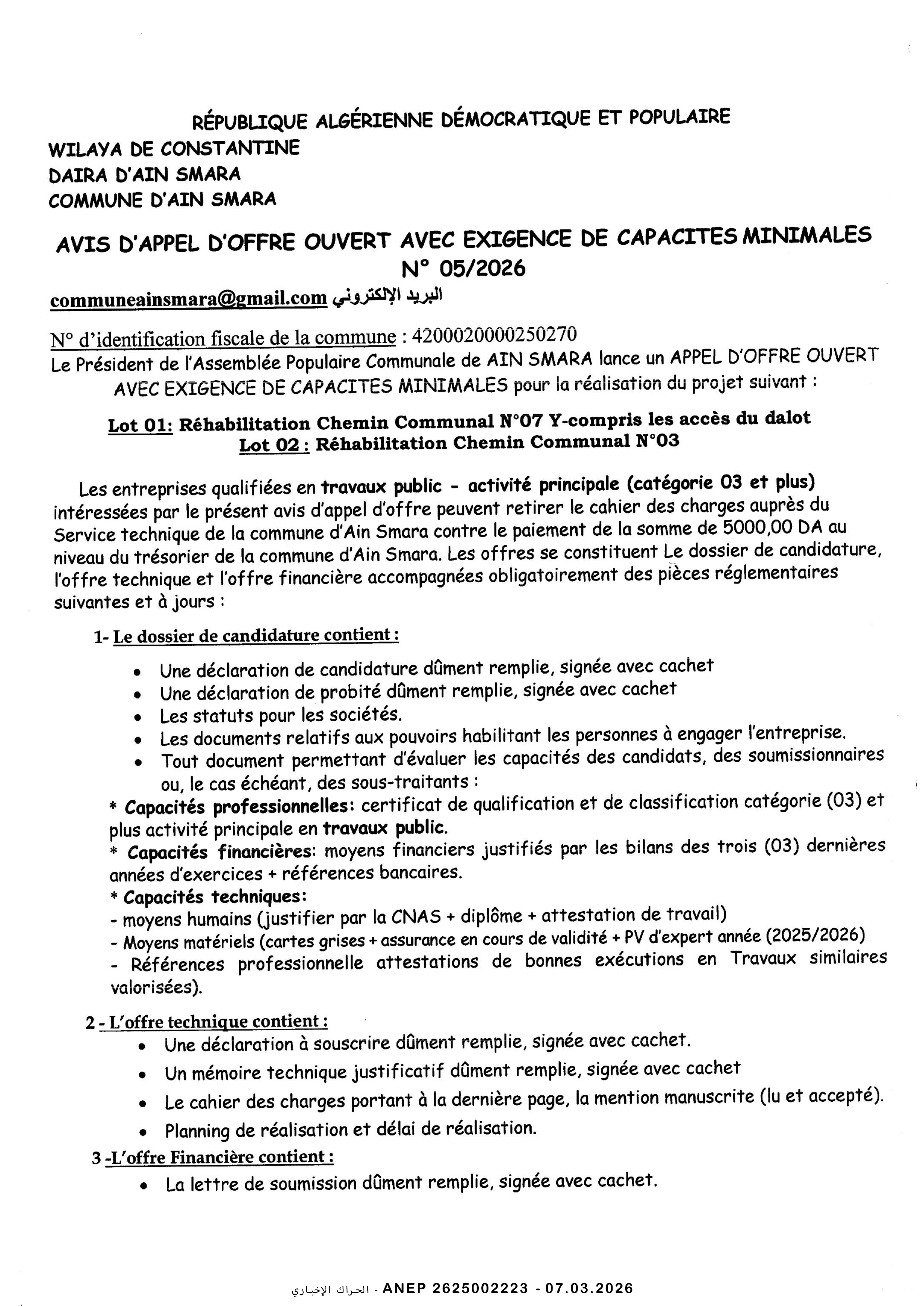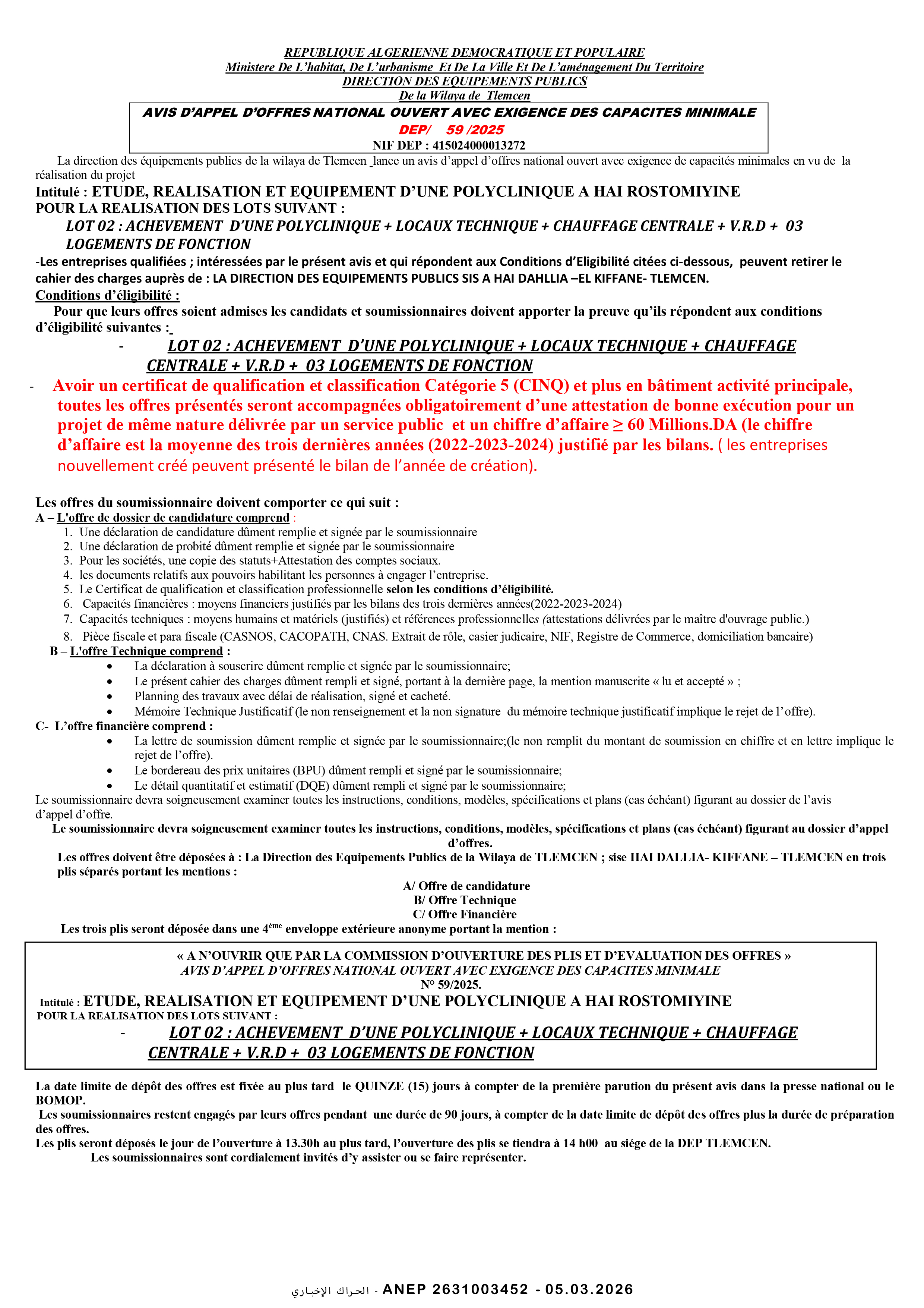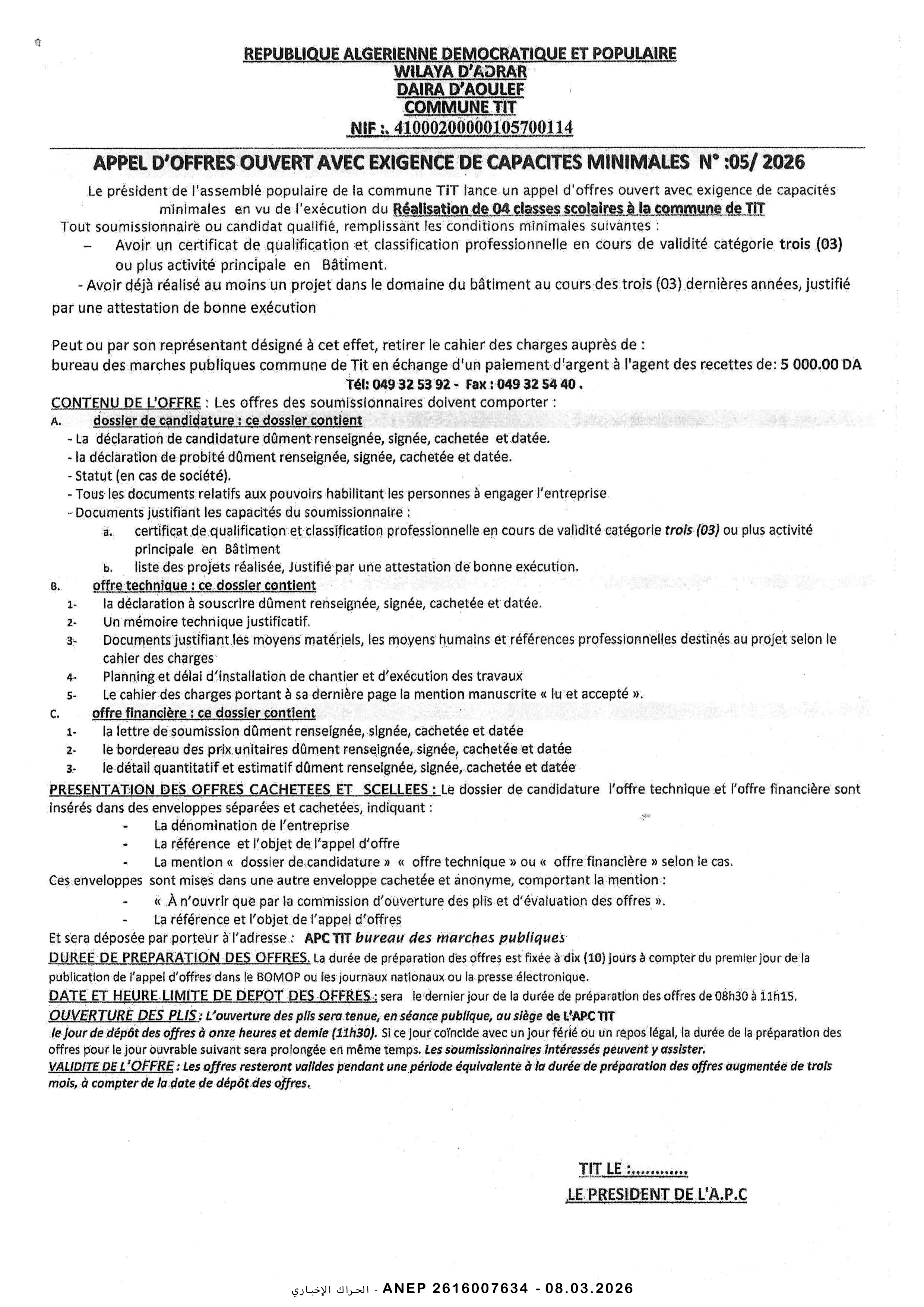 إعلان عن طلب عروض وطني محدود