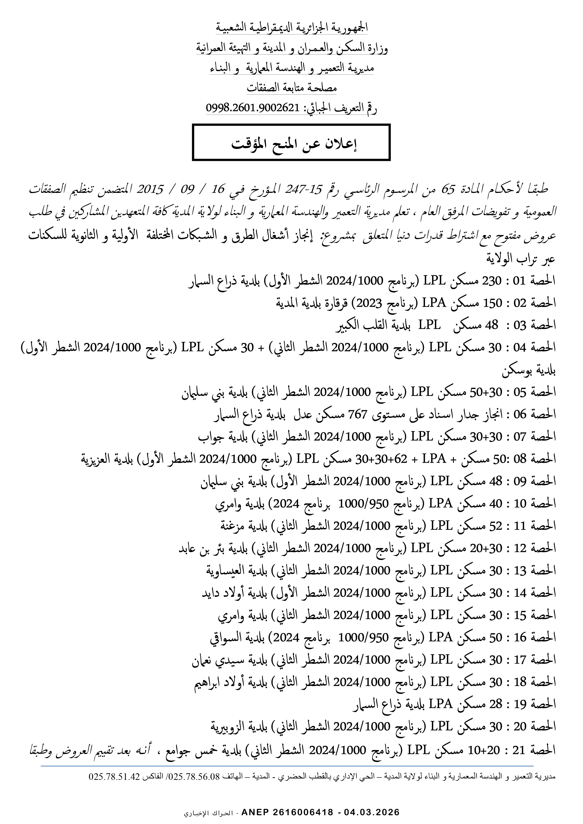 إنجاز 4000/250 مسكن عمومي إيجاري مع أشغال كل المرافق و الشبكات المختلفة - ولاية الجلفة