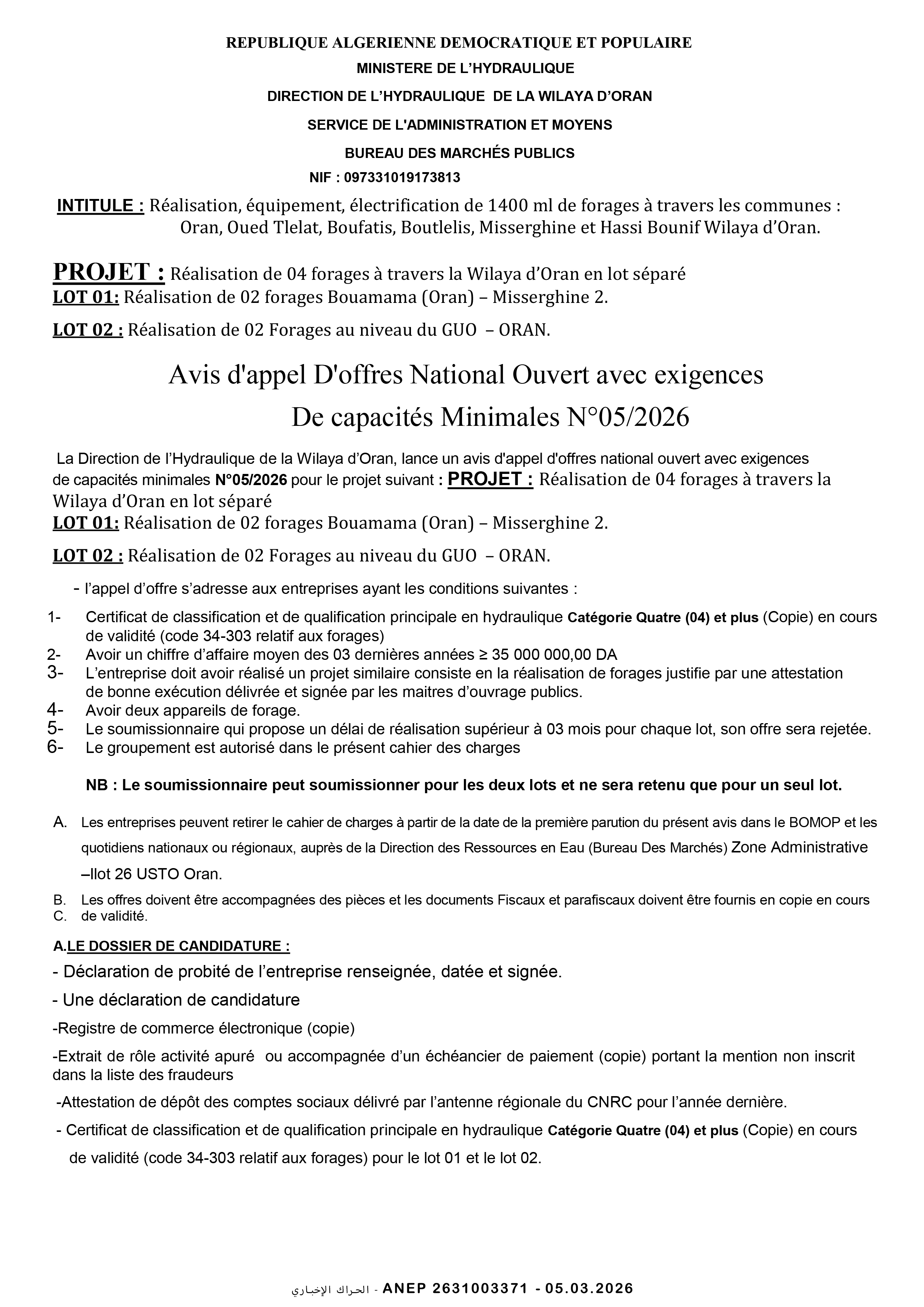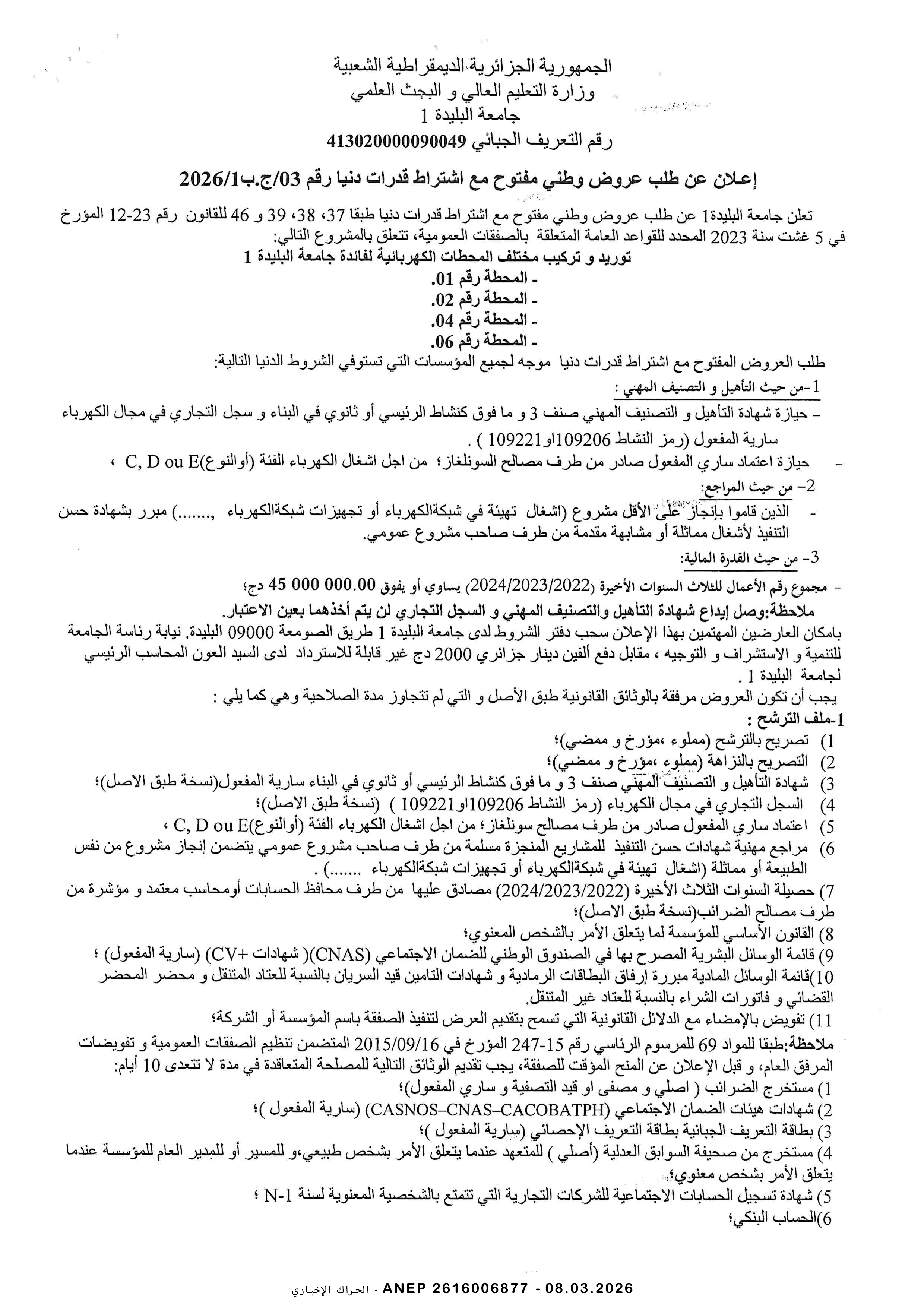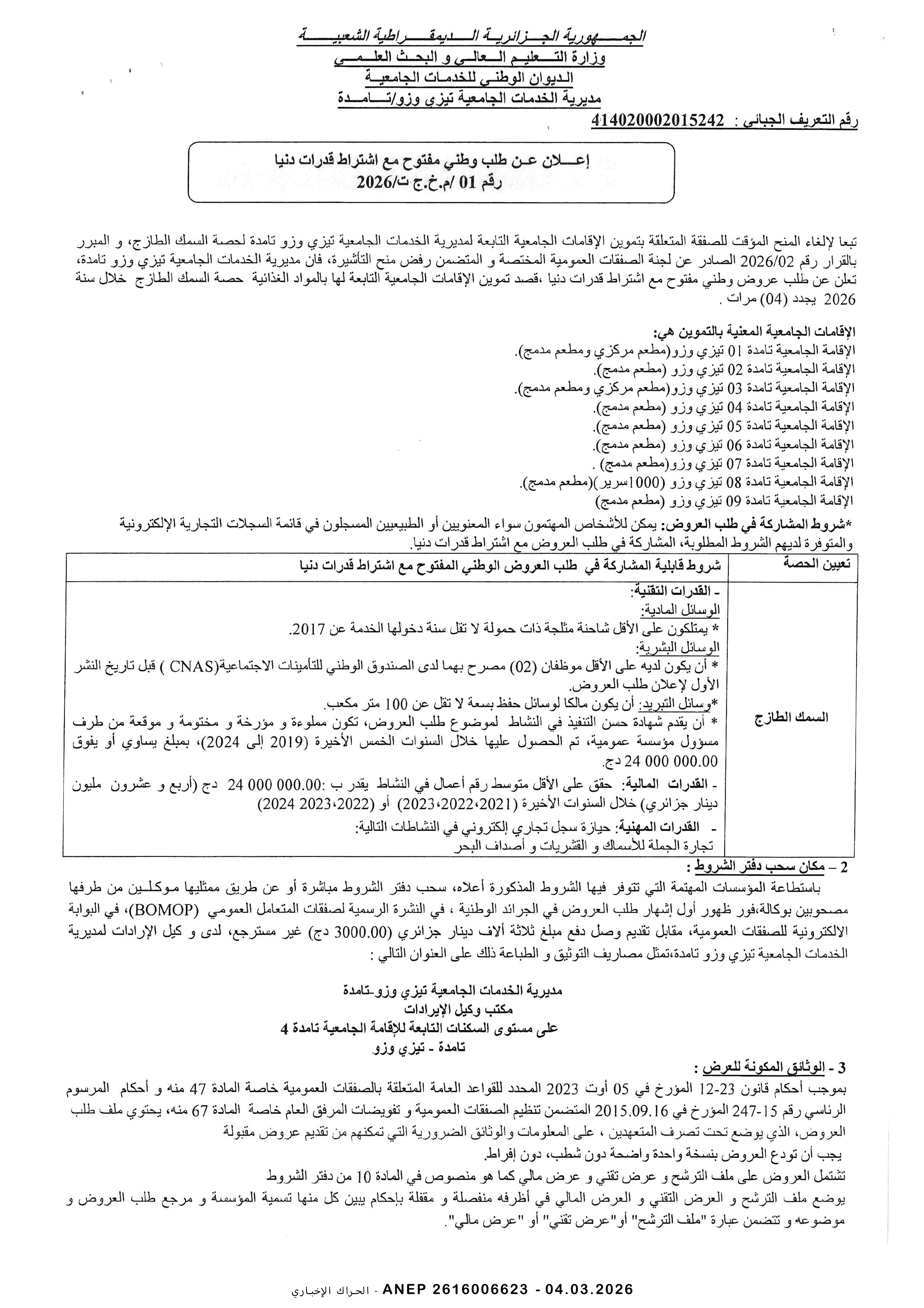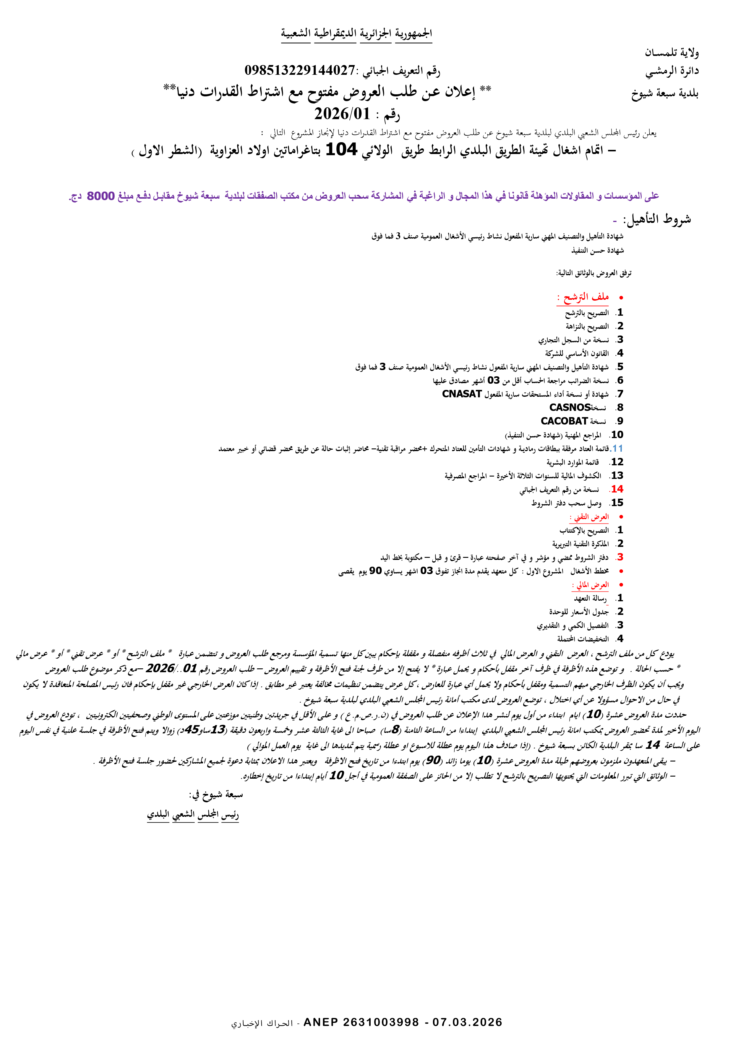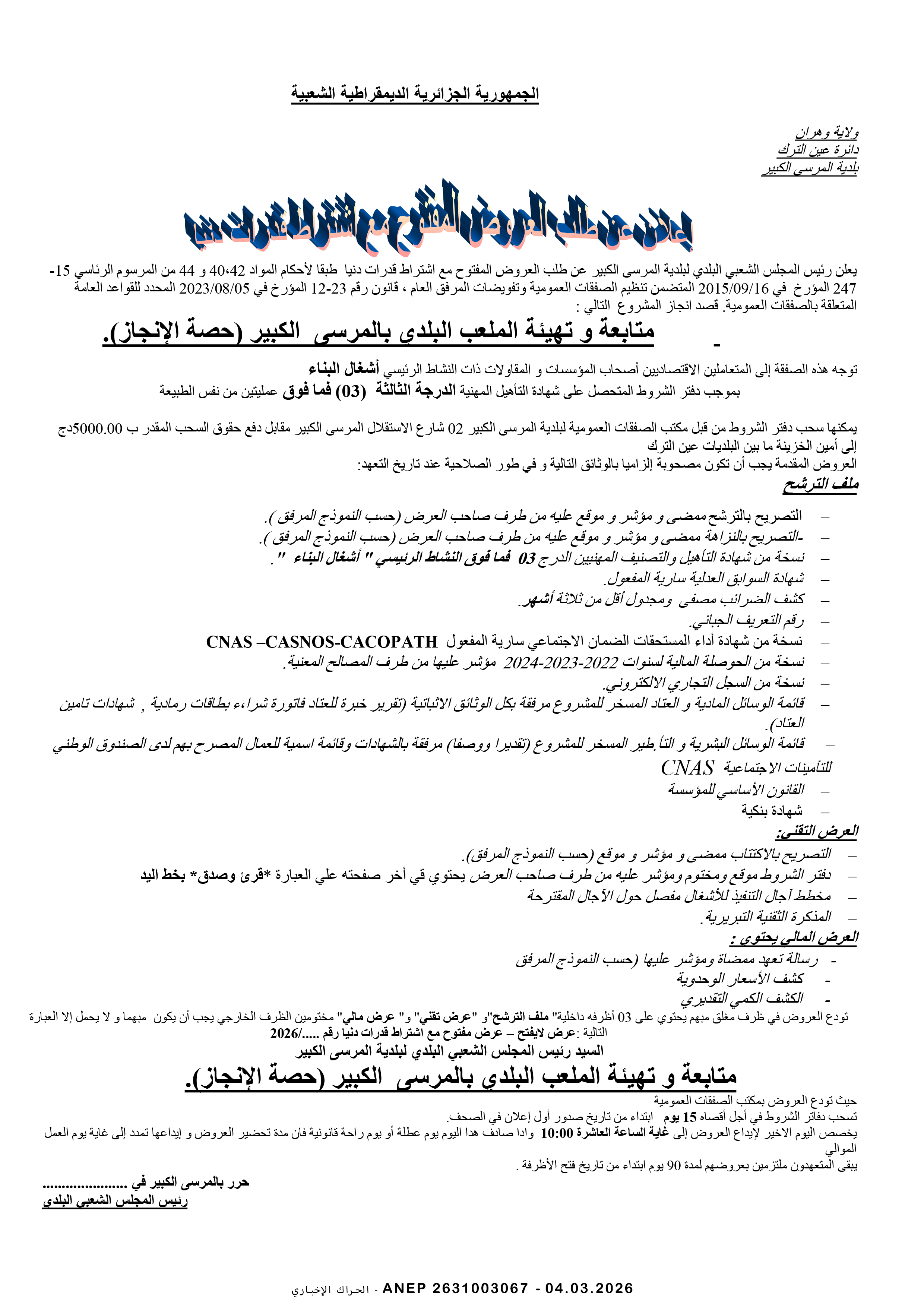 إعلان عن طلب عروض وطني مفتوح