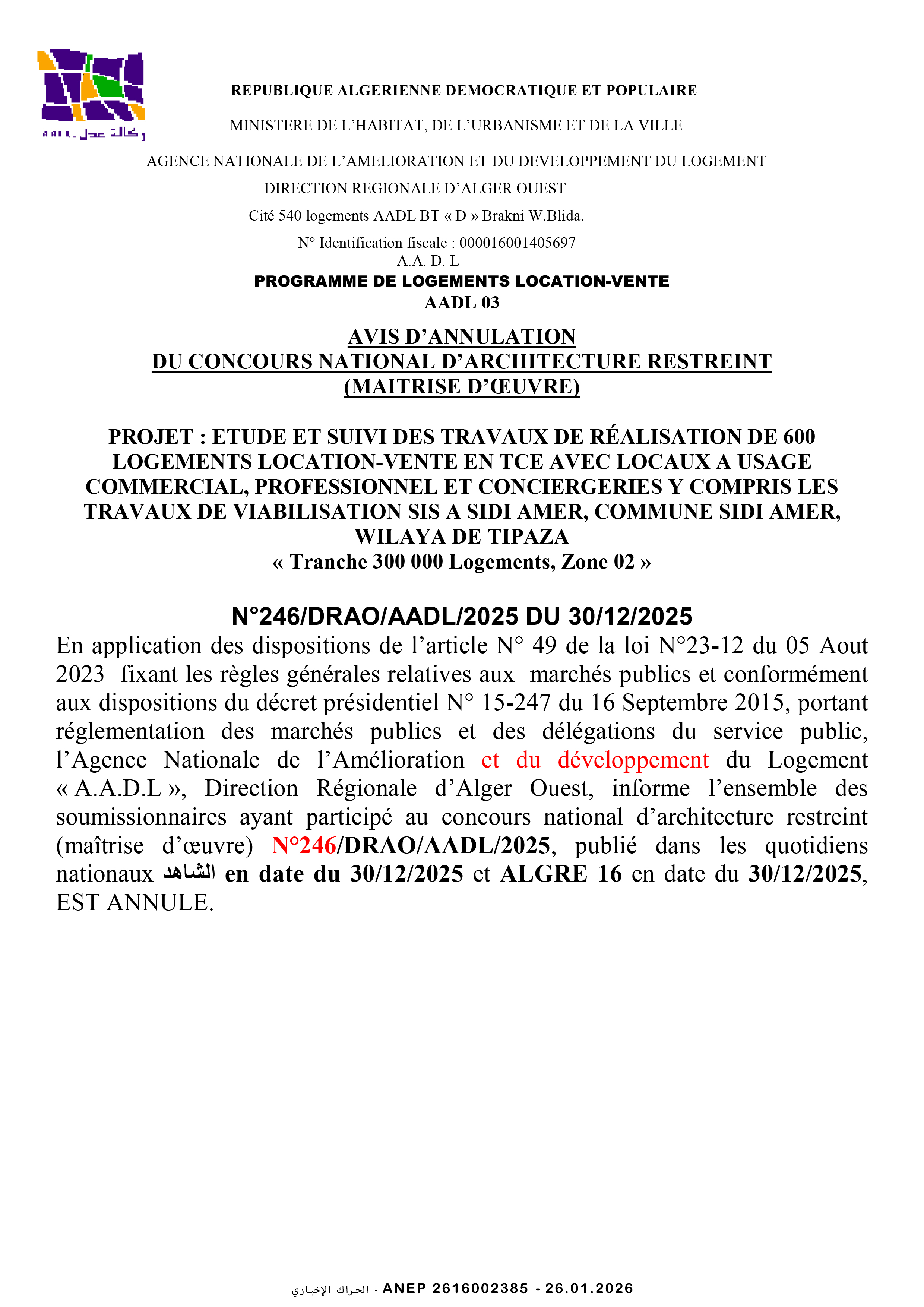 دراسة و متابعة لانجاز 600 مسكن بيع - إيجار مع محلات بلدية سيدي اعمر ولاية تيبازة