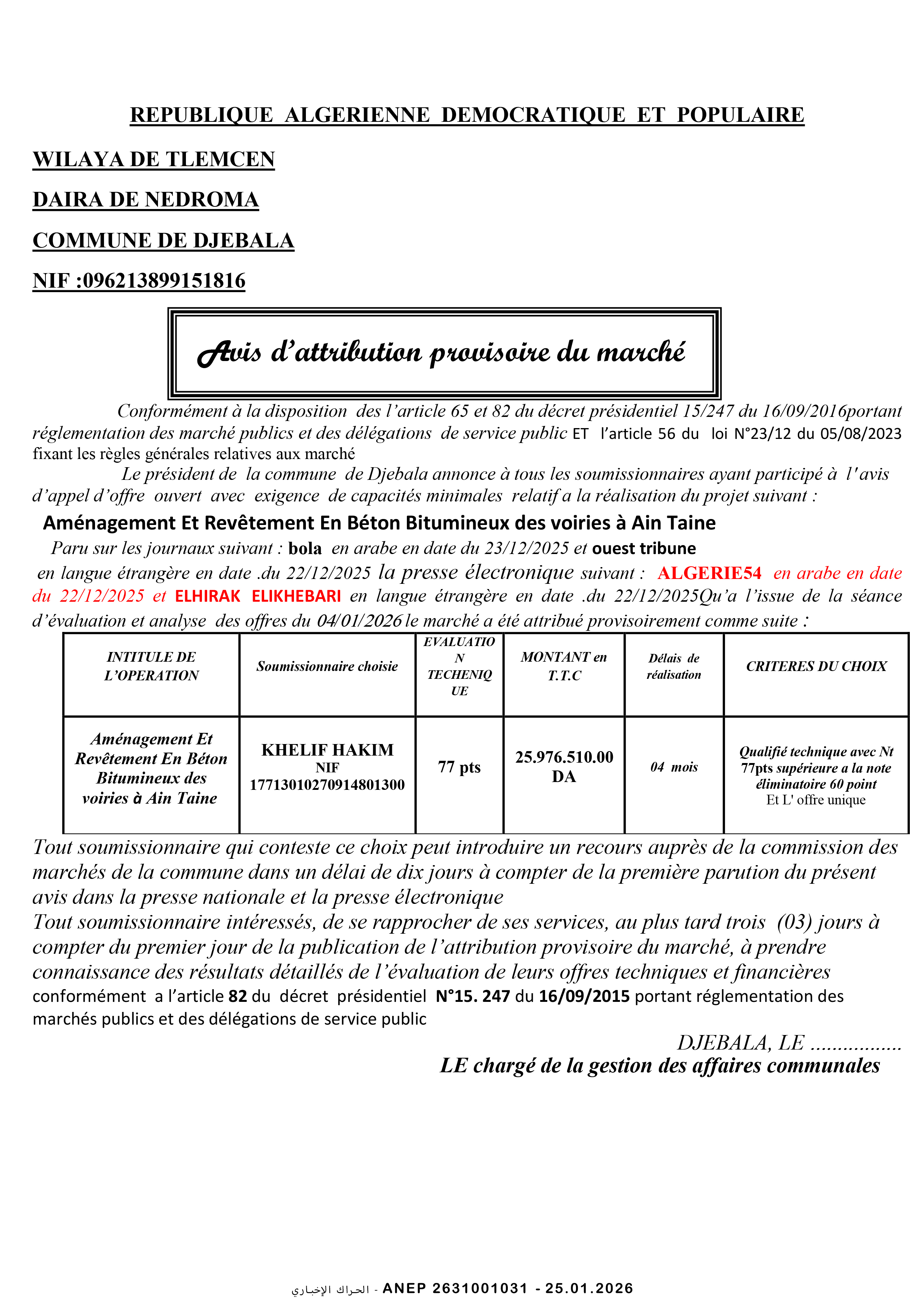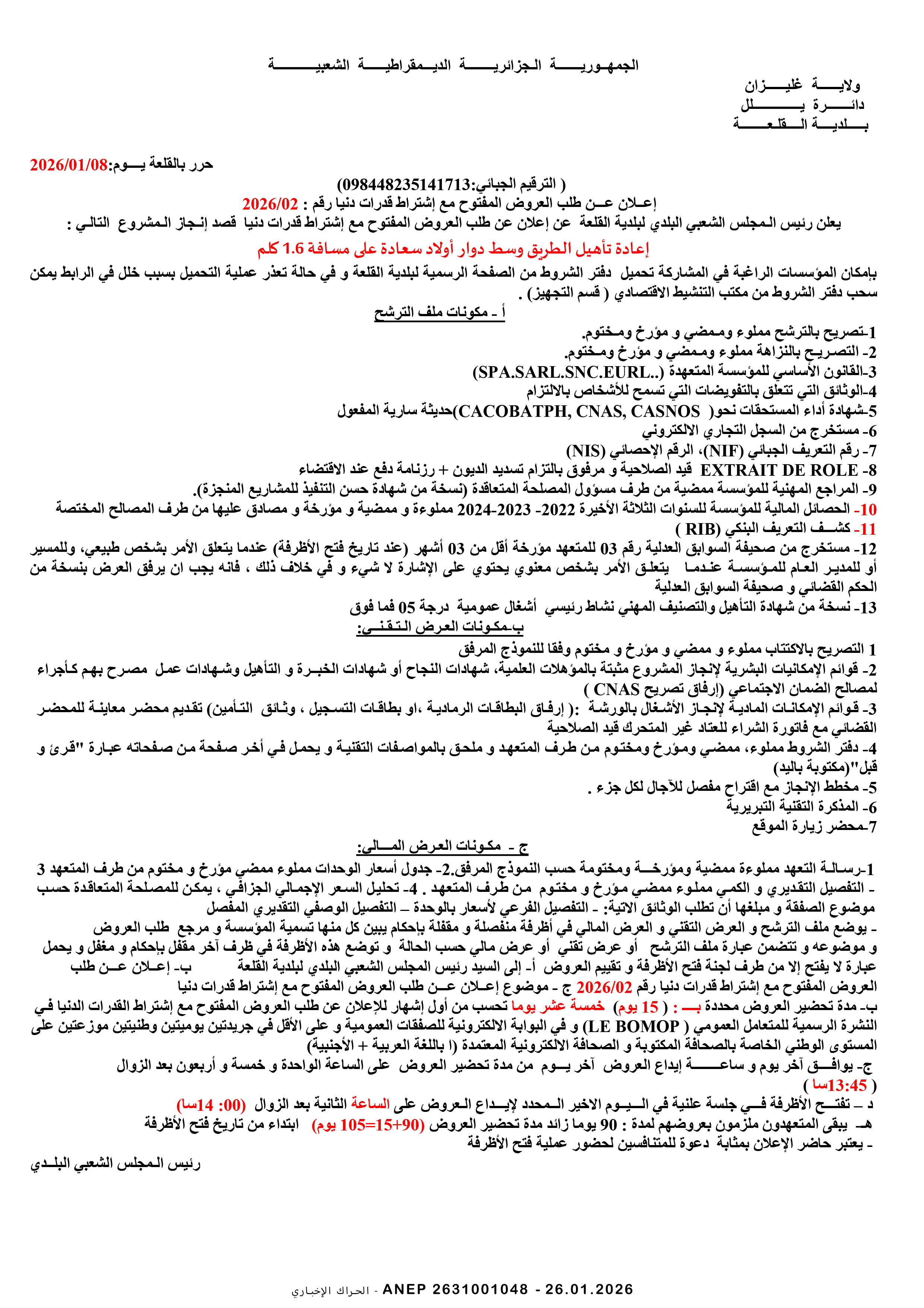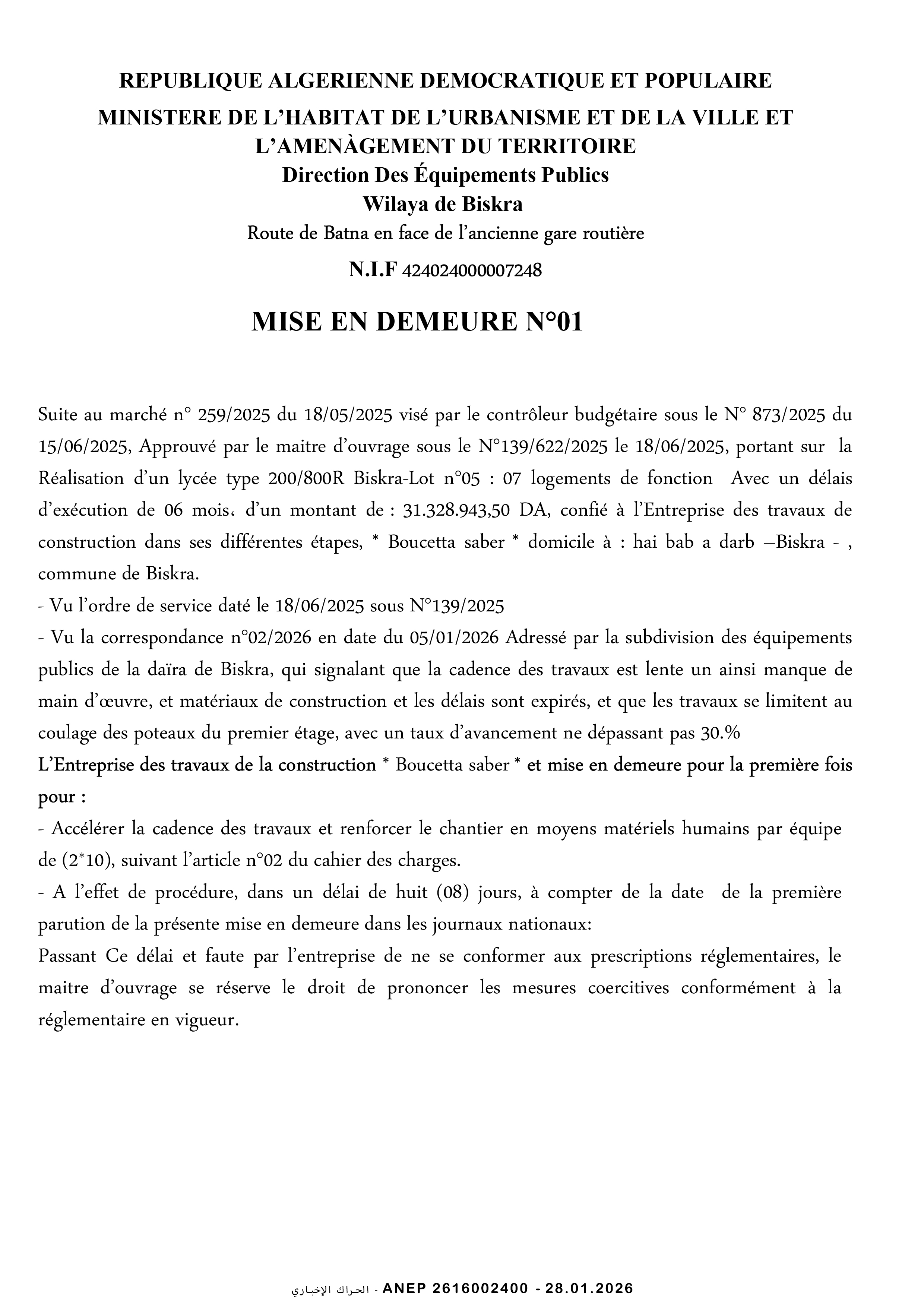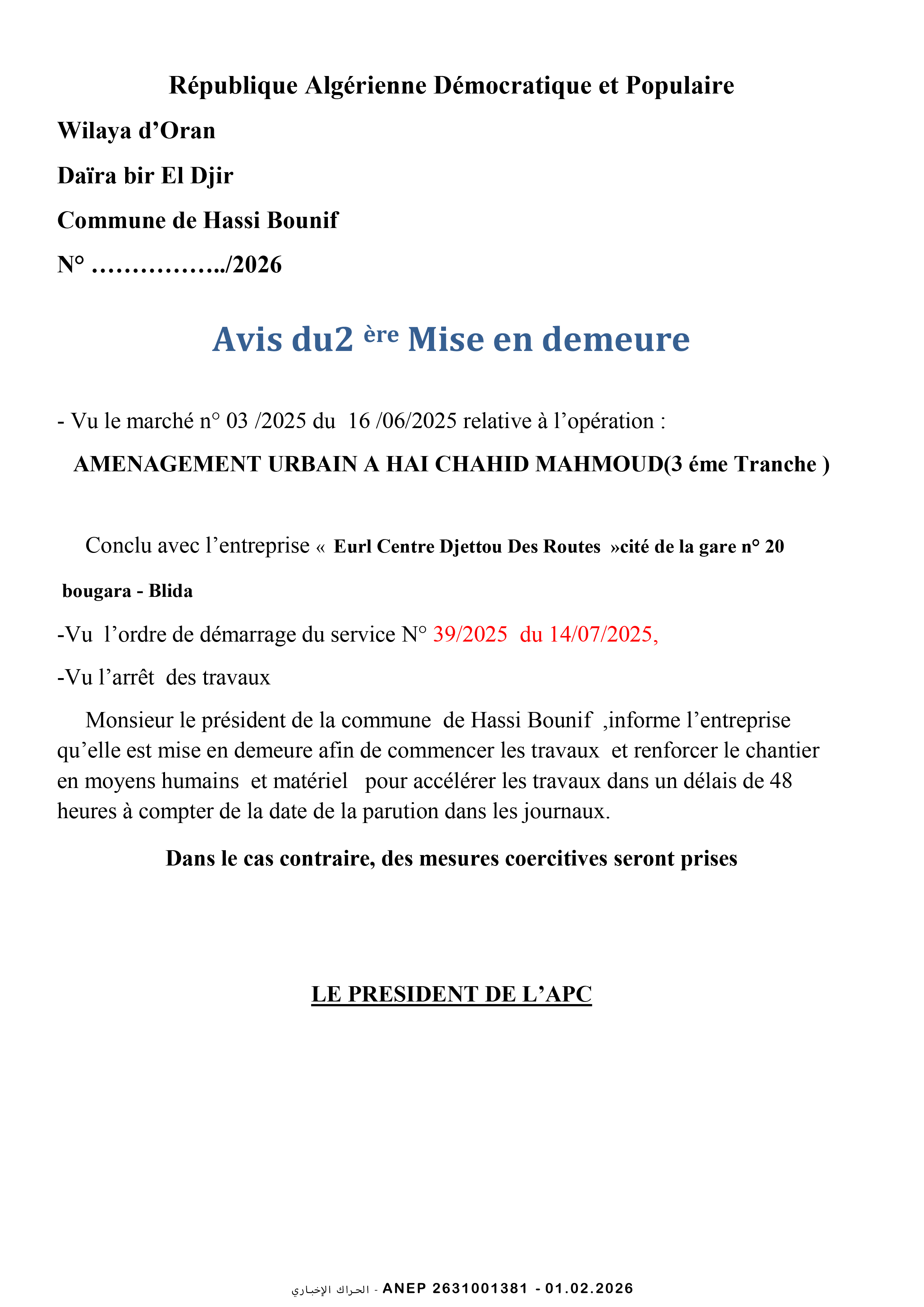 أشغال انجاز 1500 مسكن بيع بالايجار مع محلات و مساكن البوابين بلدية تيسمسيلت