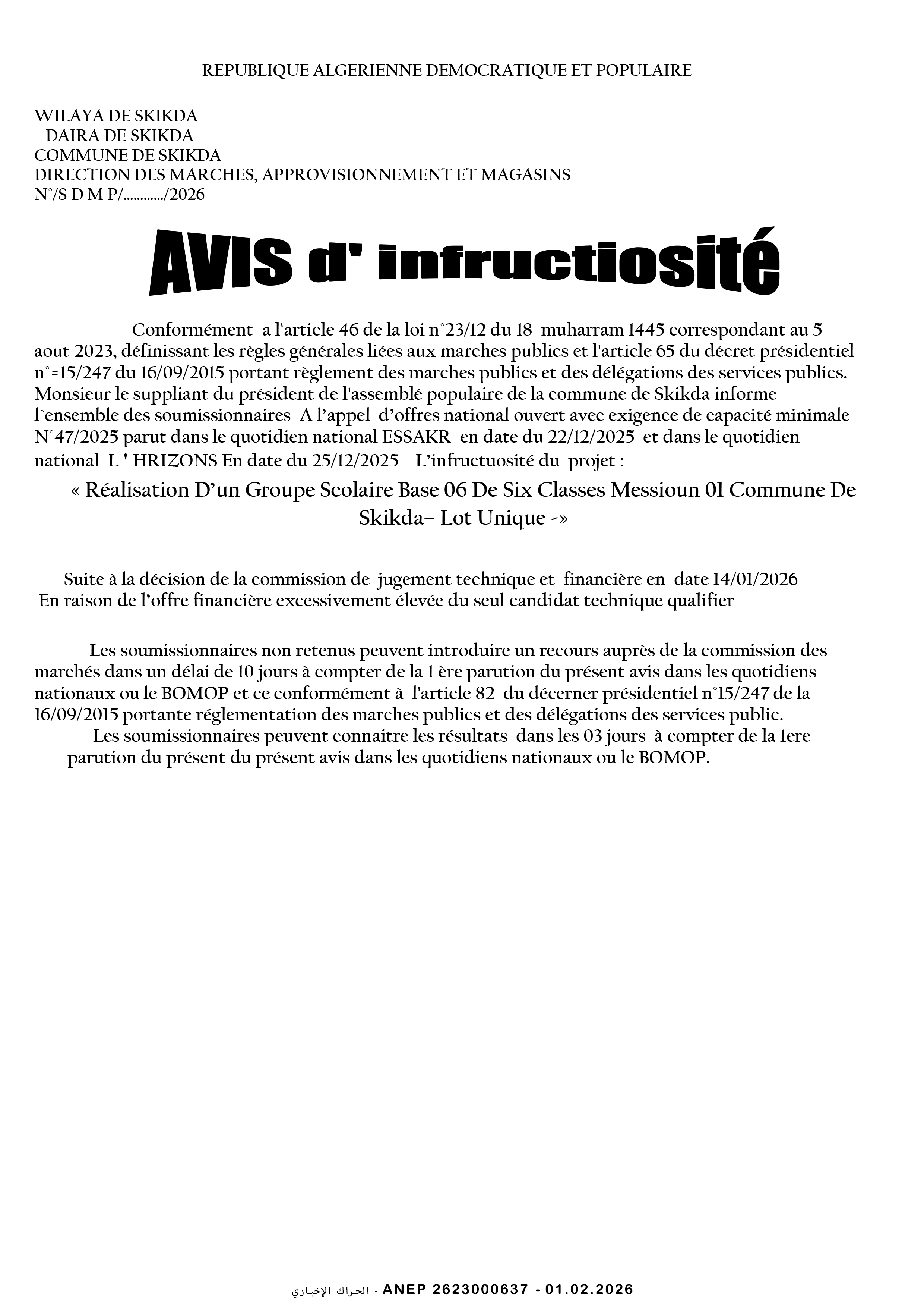 إنجاز مجمع مدرسي صنف 06 بلدية سكيكدة