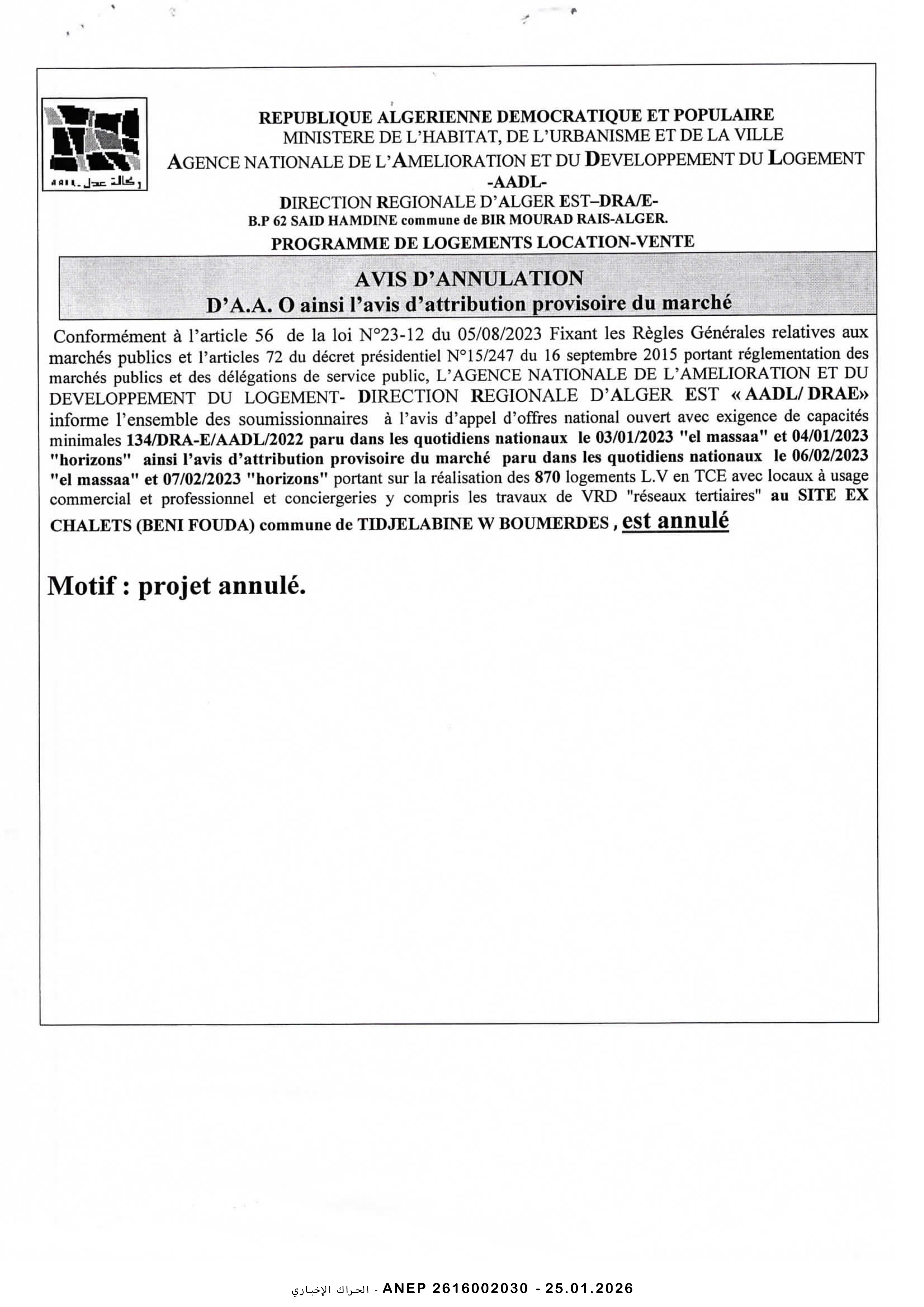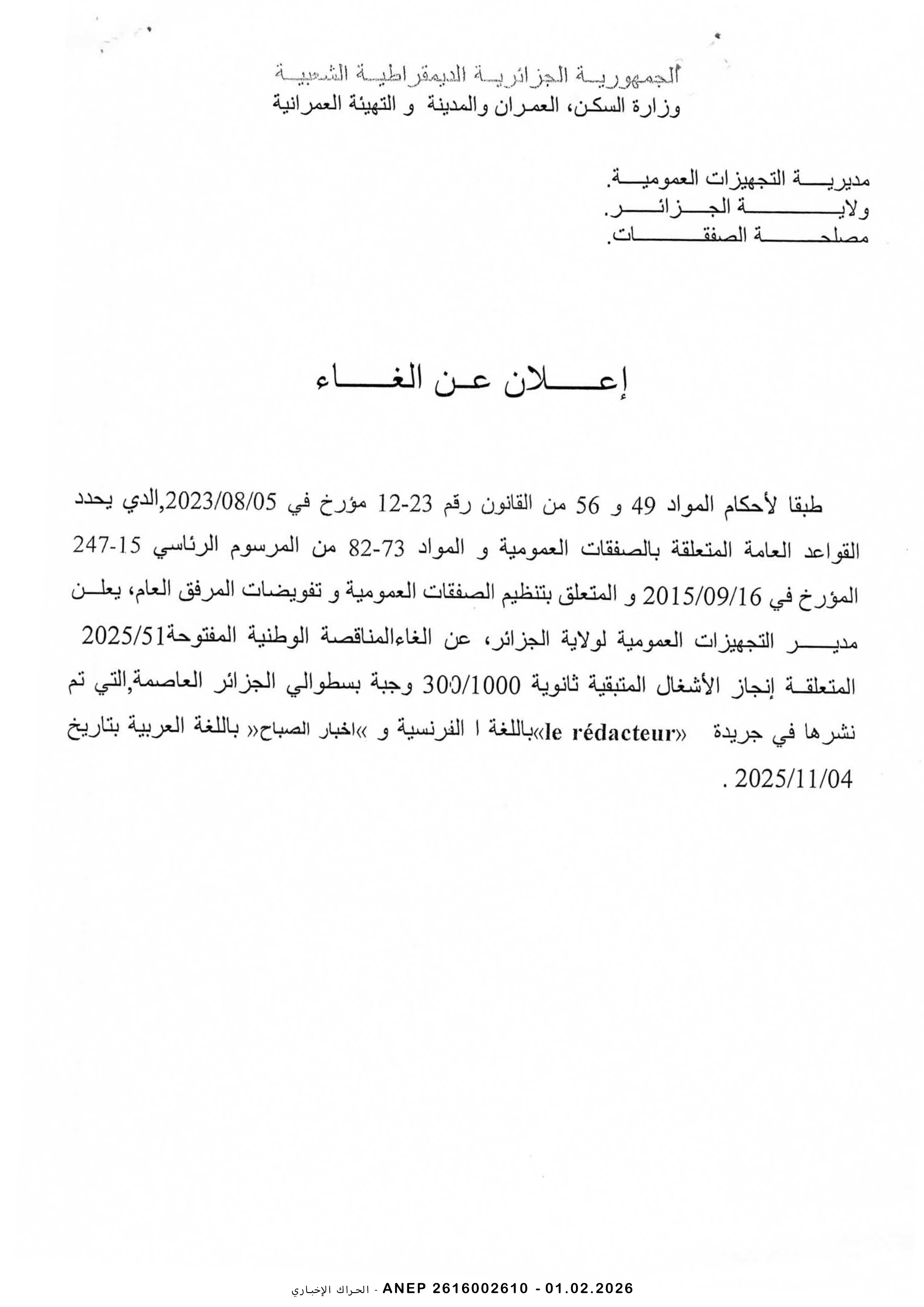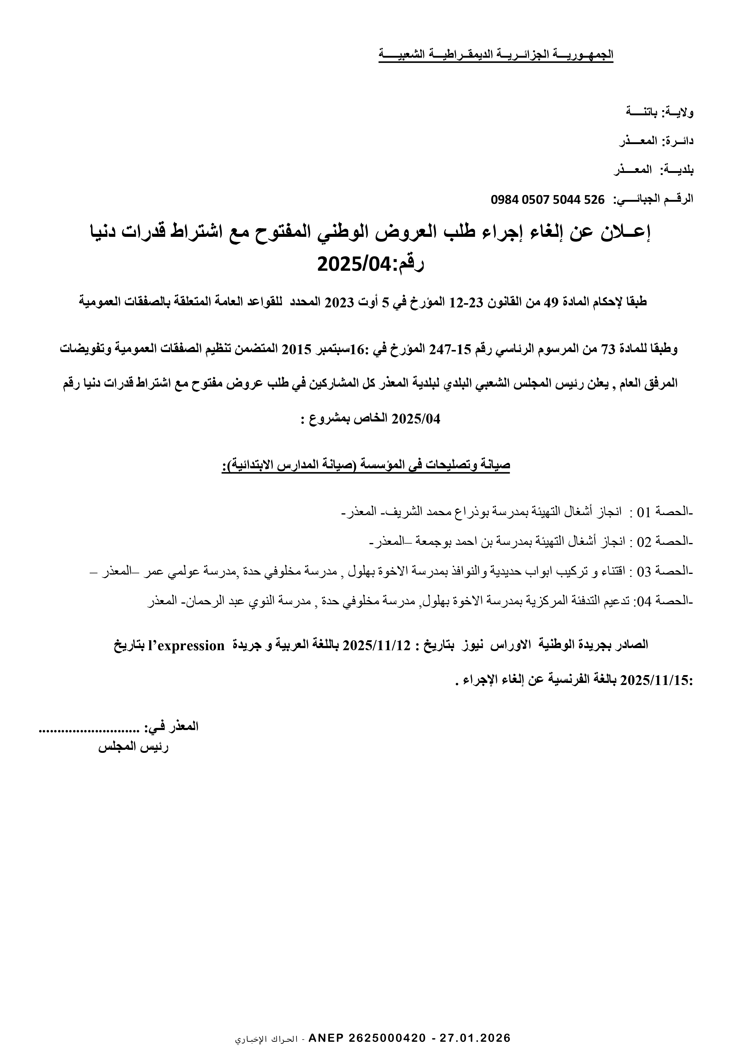 إعلان عن إلغاء طلب عروض وطني مفتوح