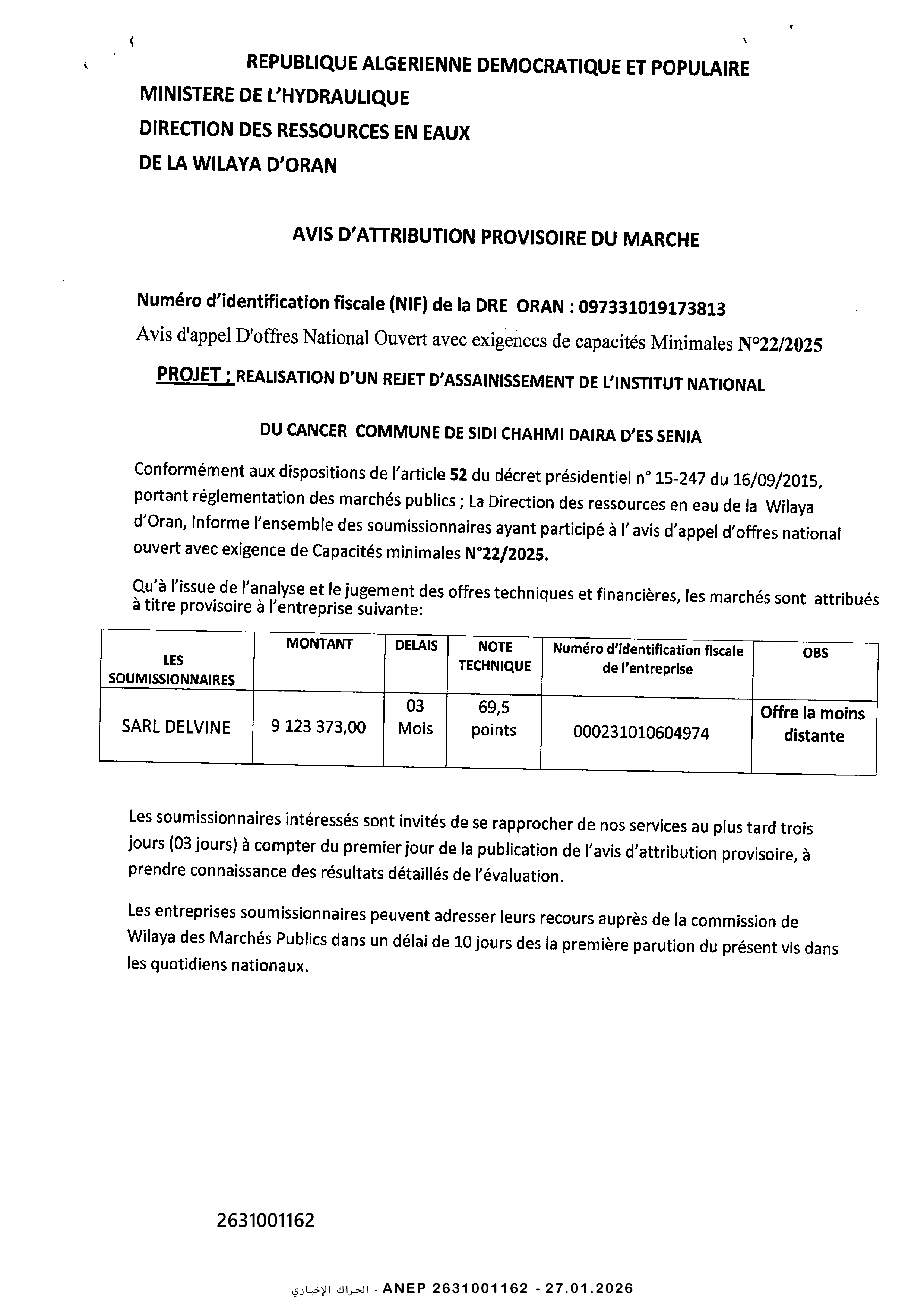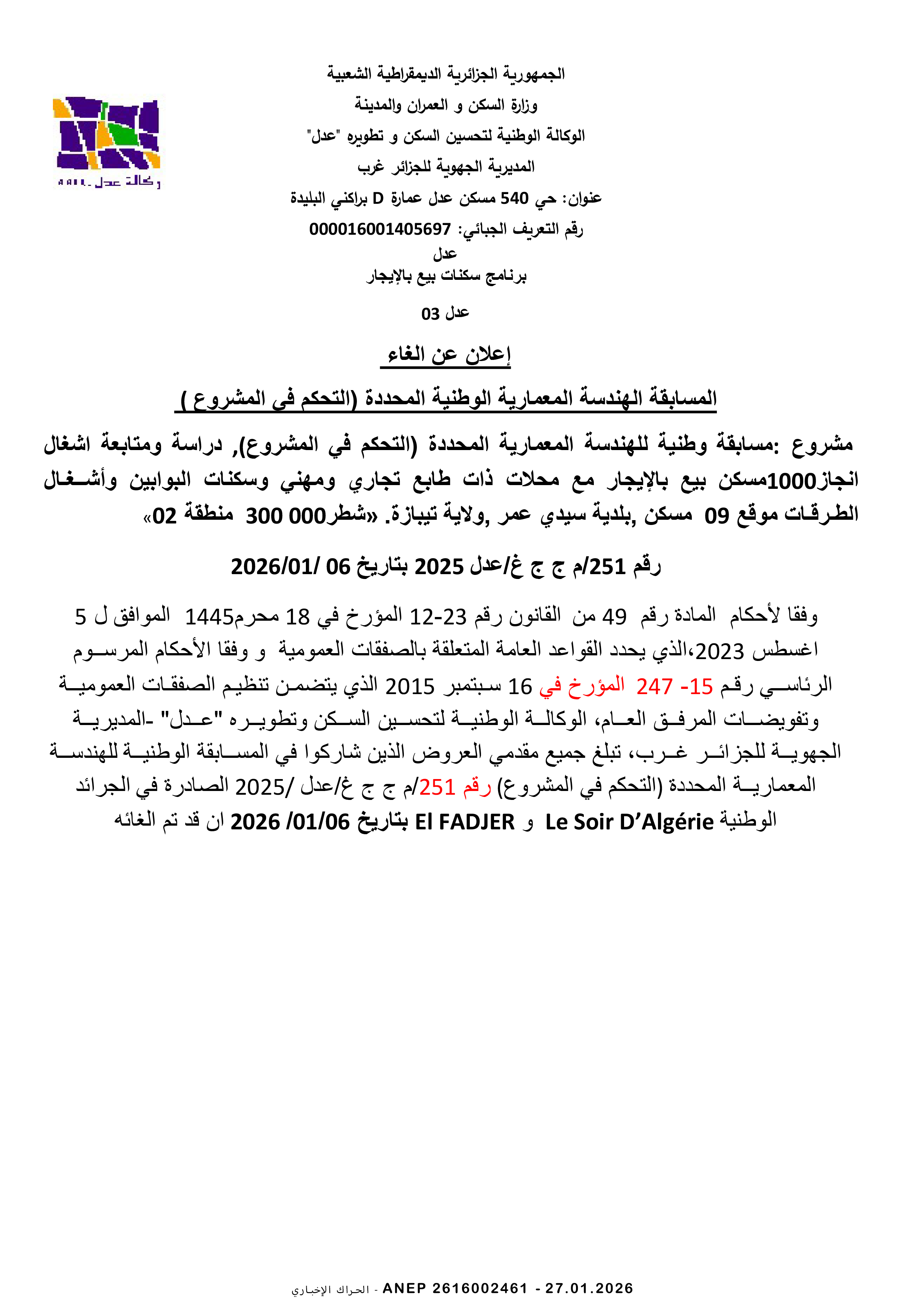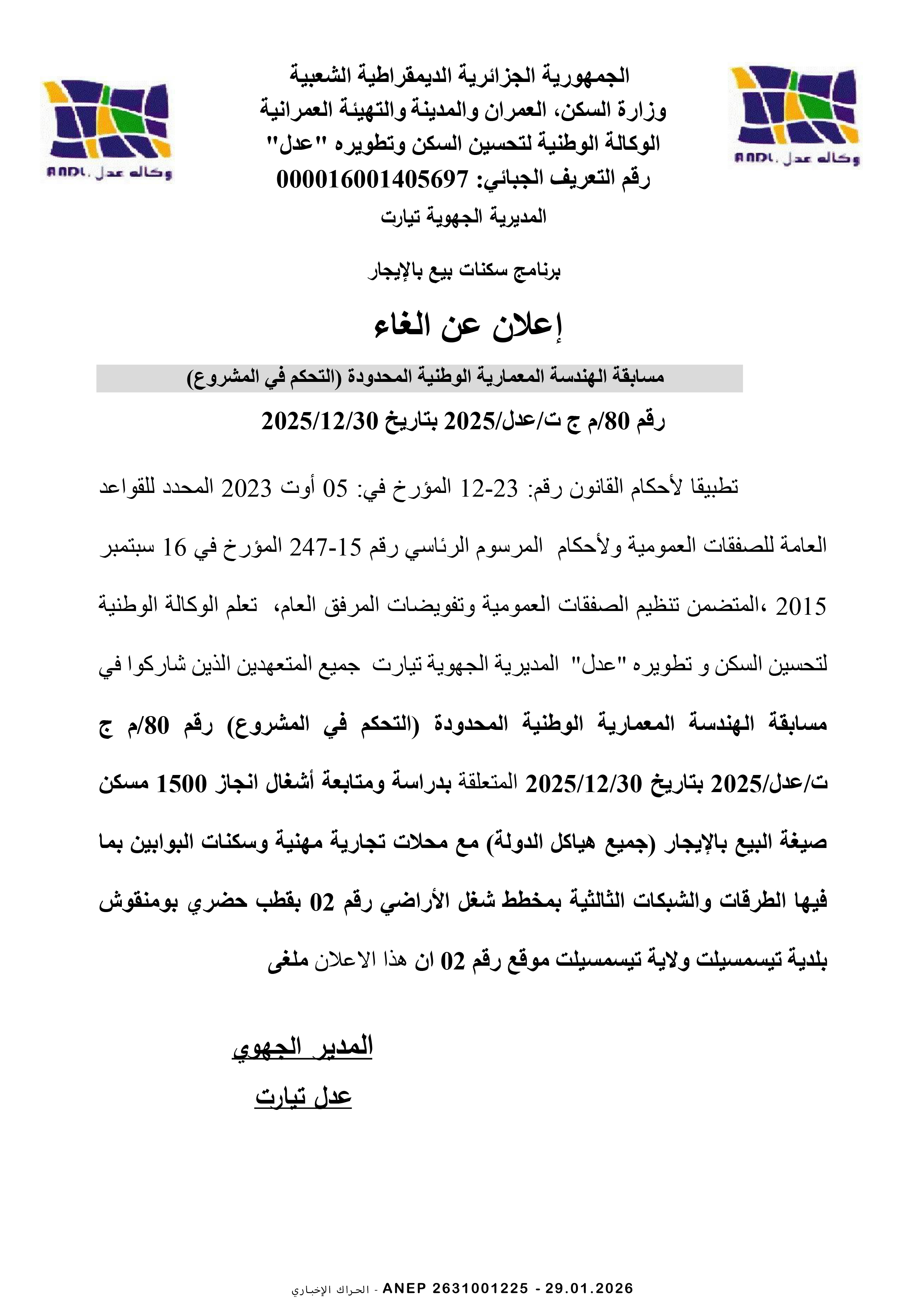 إعلان عن إلغاء طلب عروض وطني مفتوح