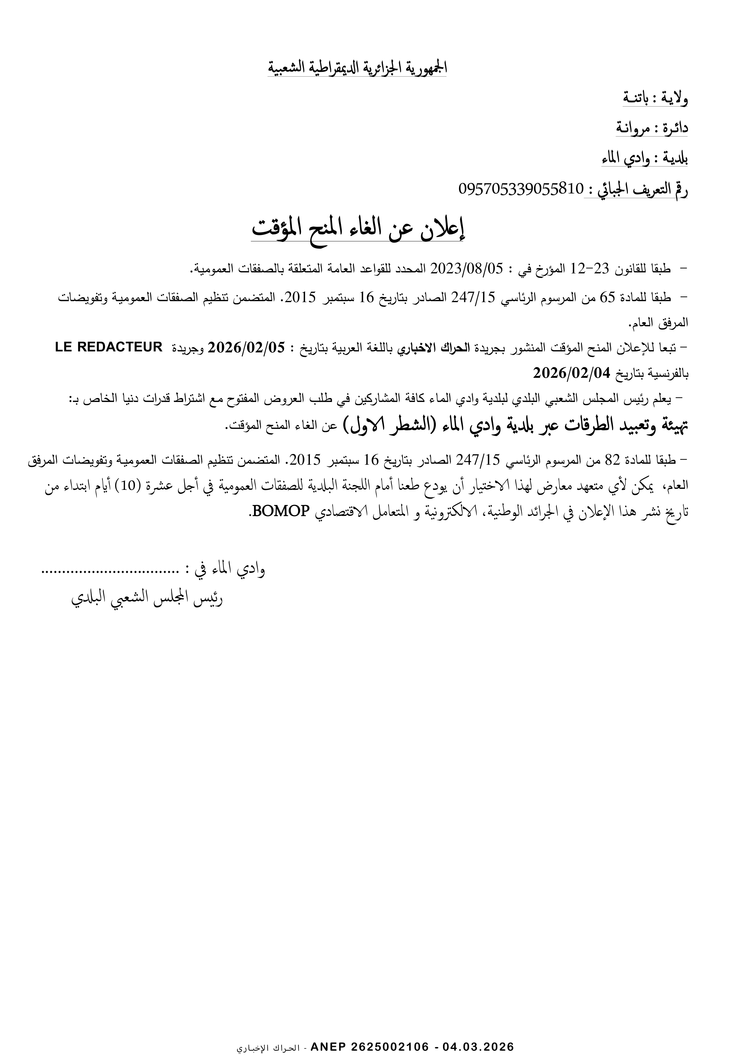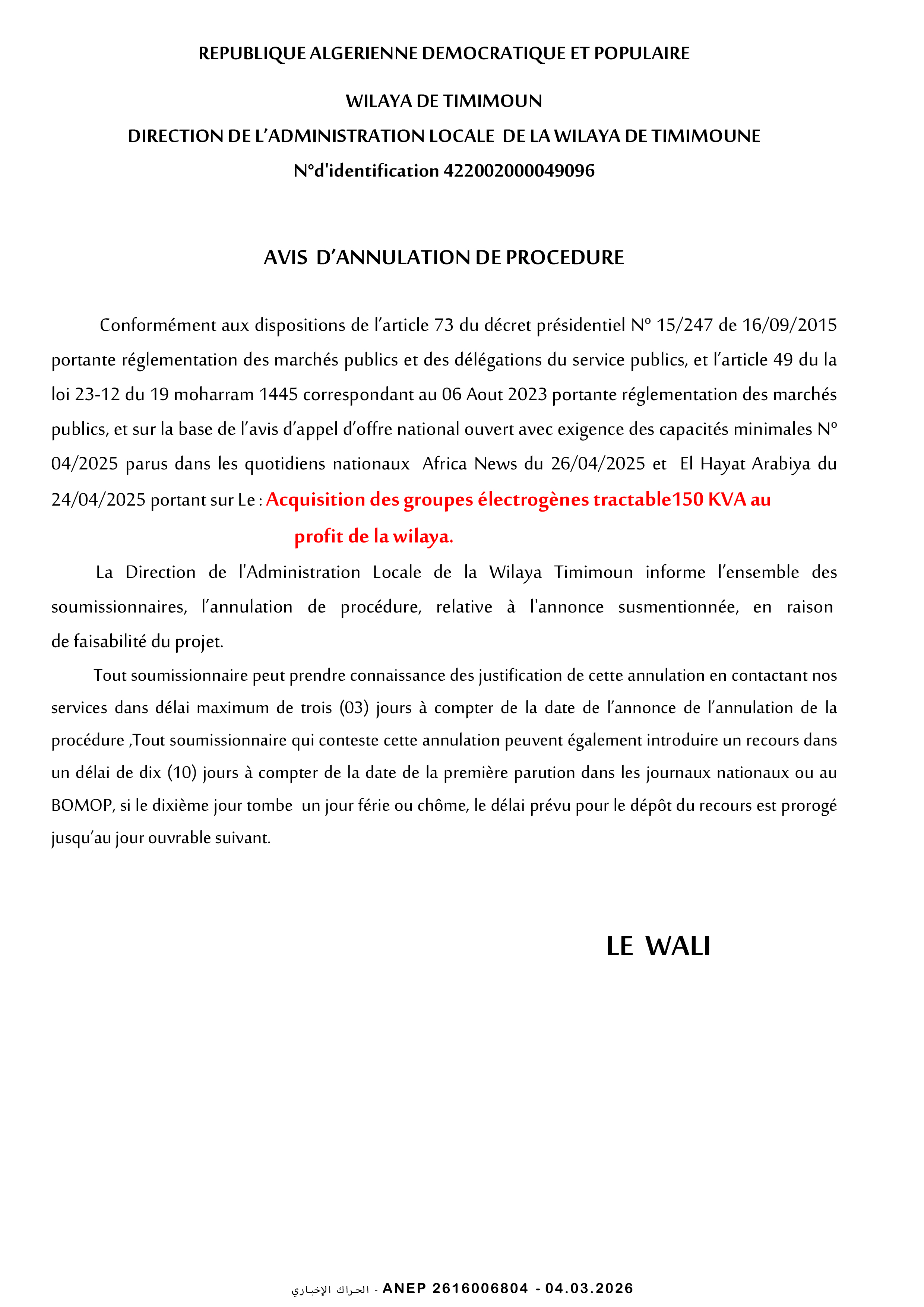 إعلان عن إلغاء الاجراء