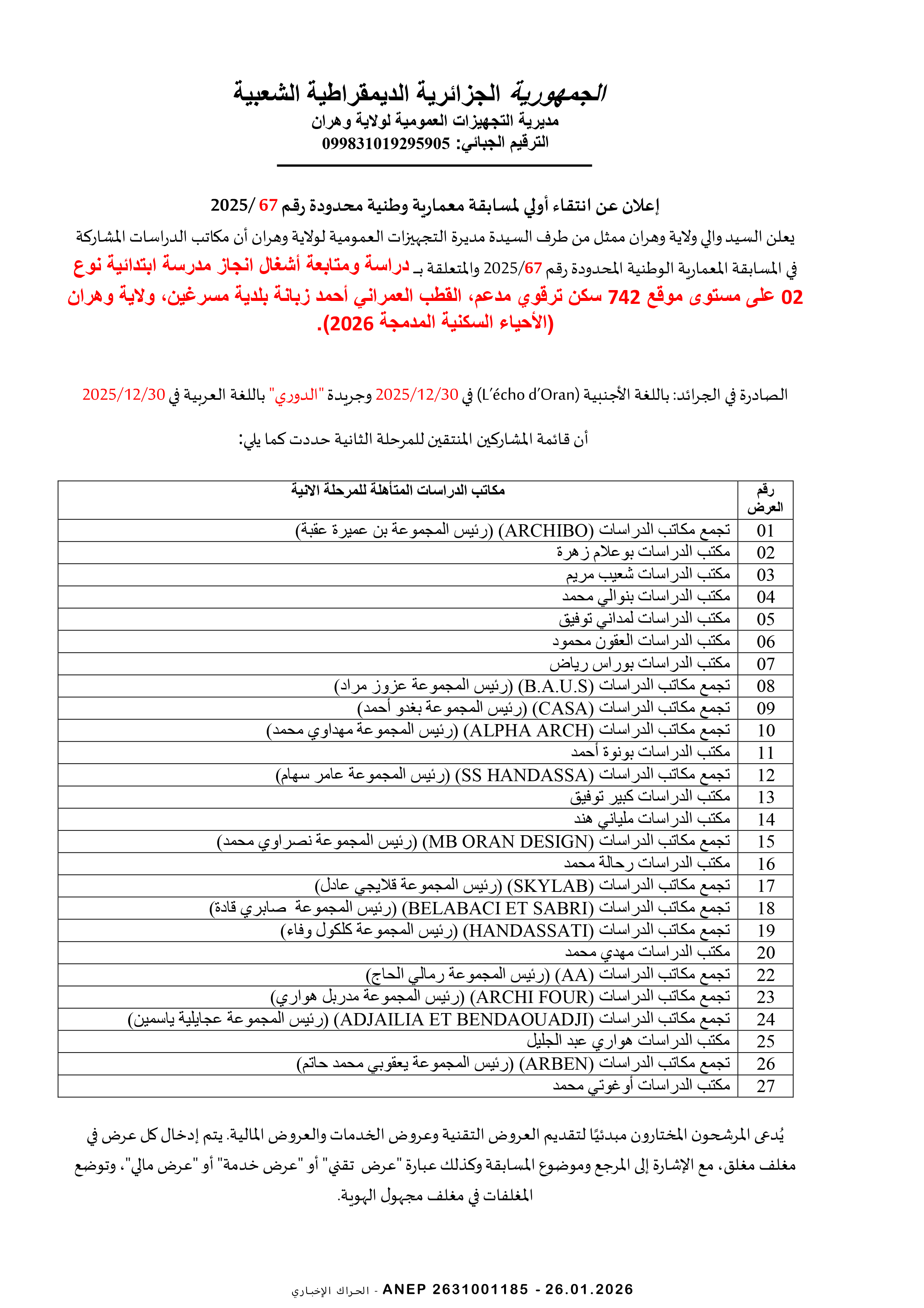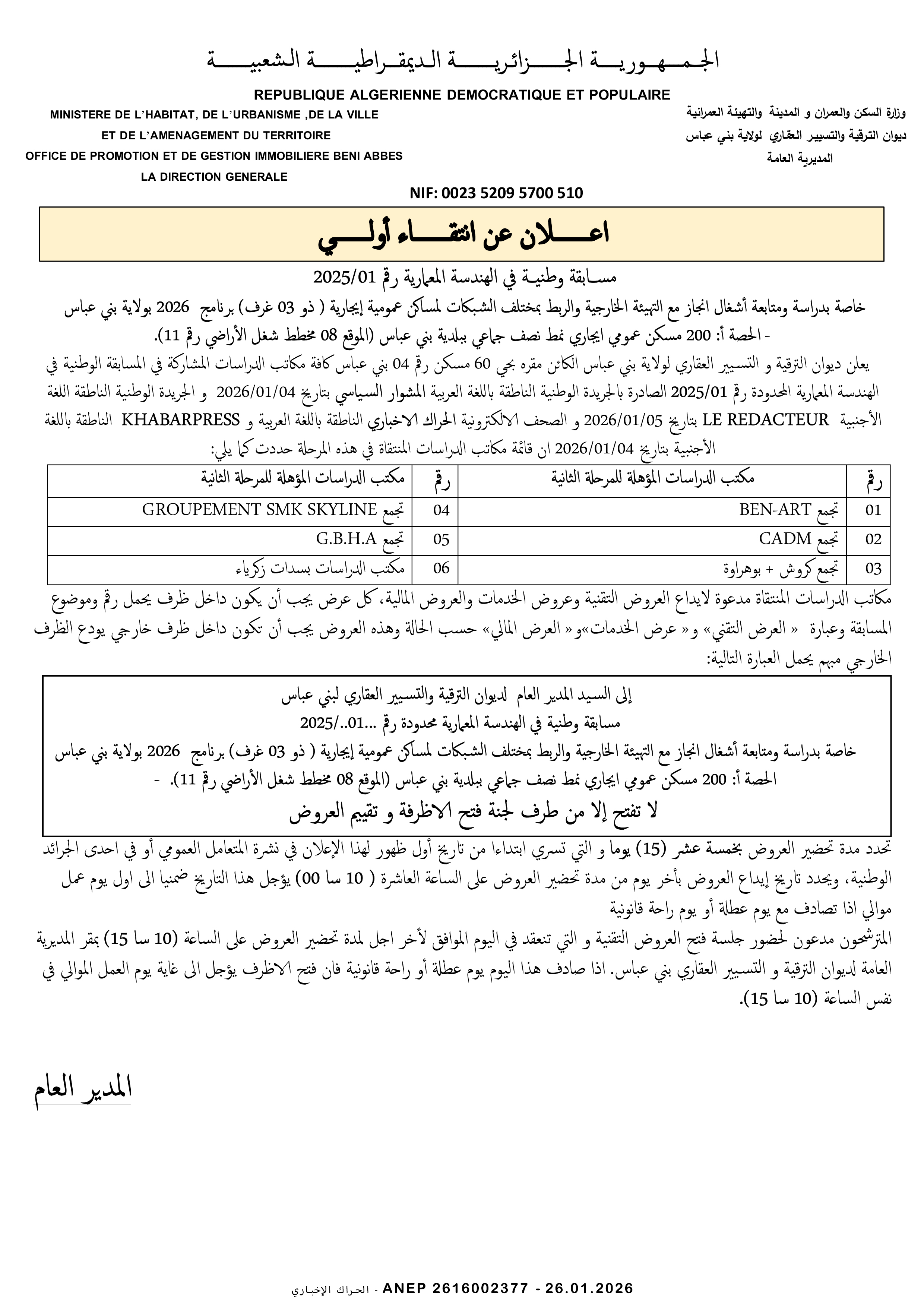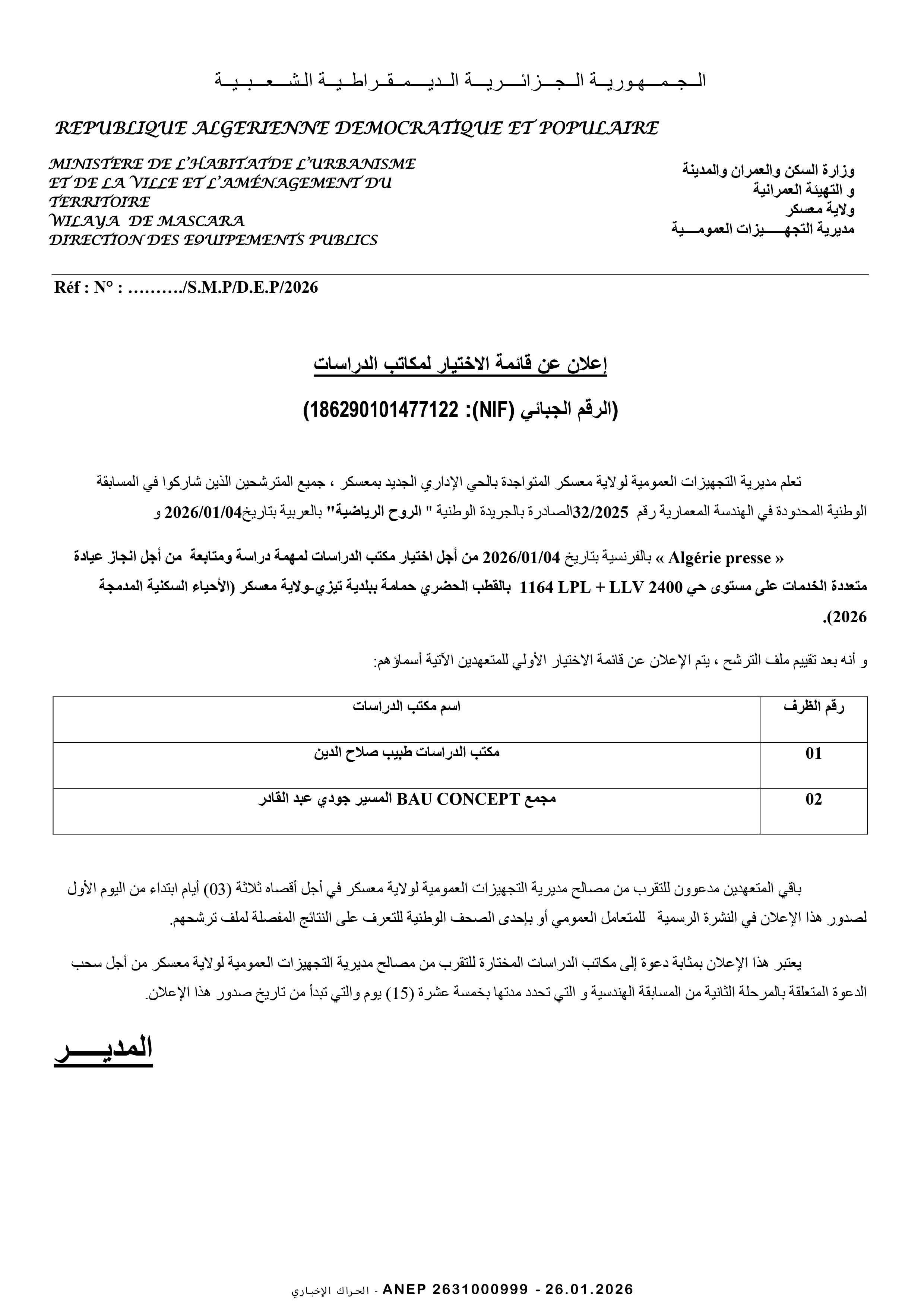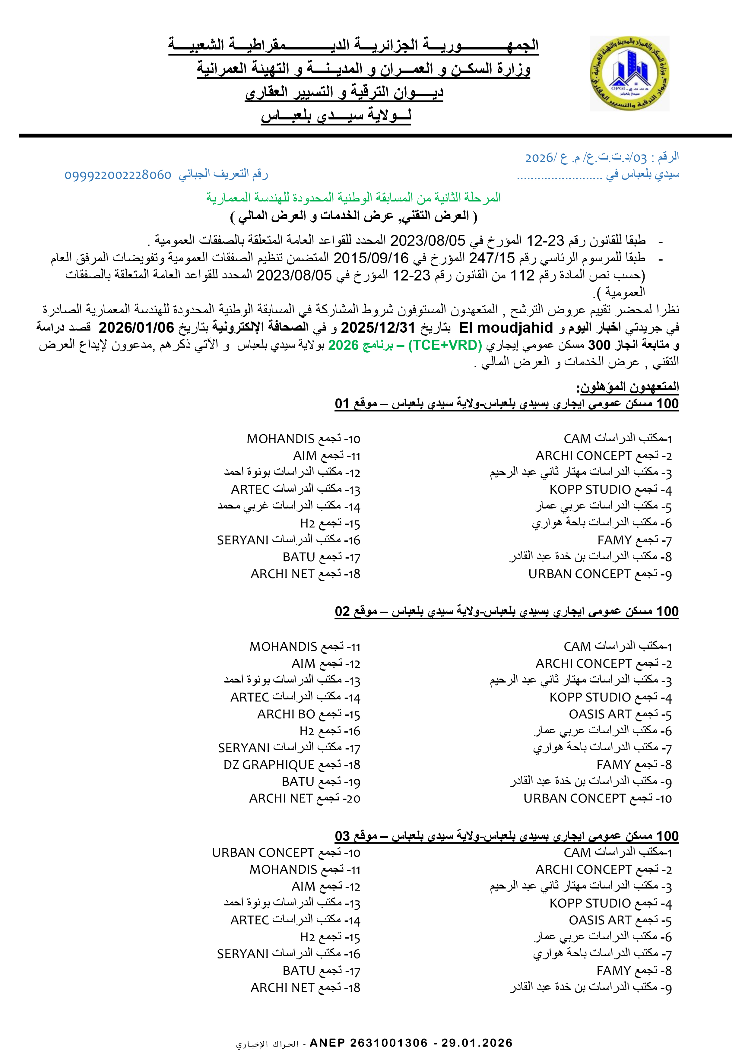 دراسة و متابعة لانجاز 300 مسكن عمومي ايجاري ولاية سيدي بلعباس