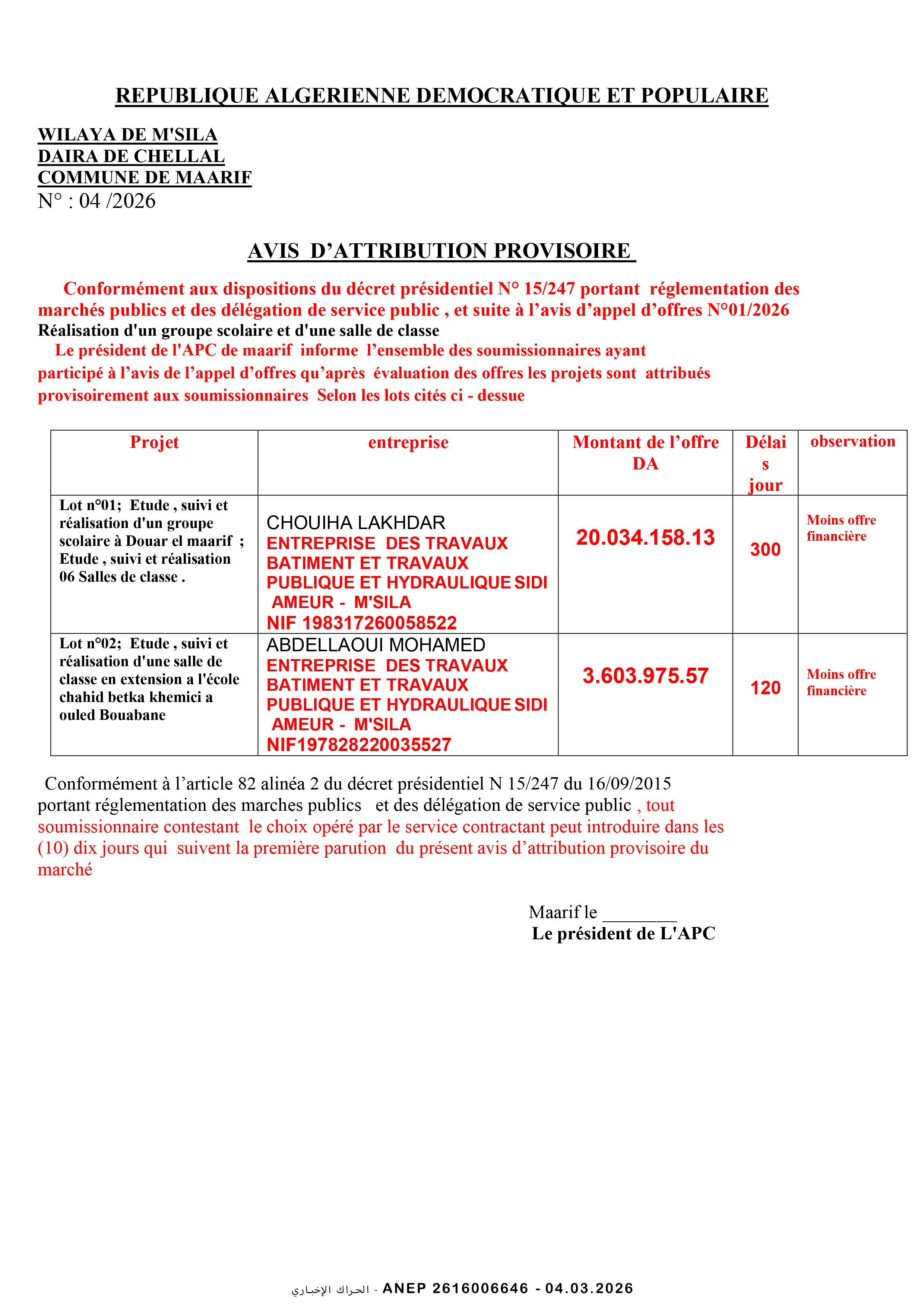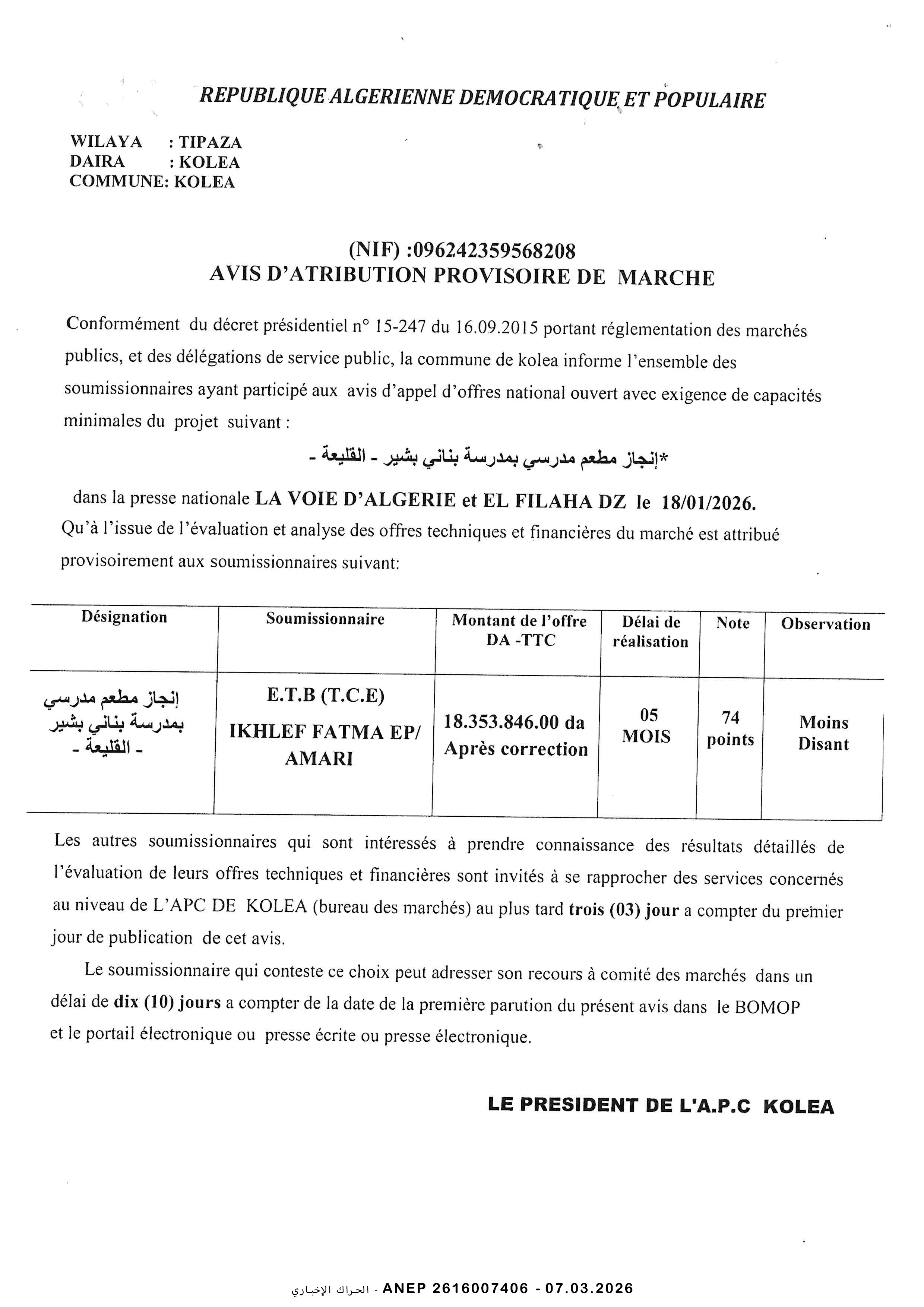 دراسة و متابعة لانجاز متوسطة نمط 06 بلدية العناصر ولاية برج بوعريريج