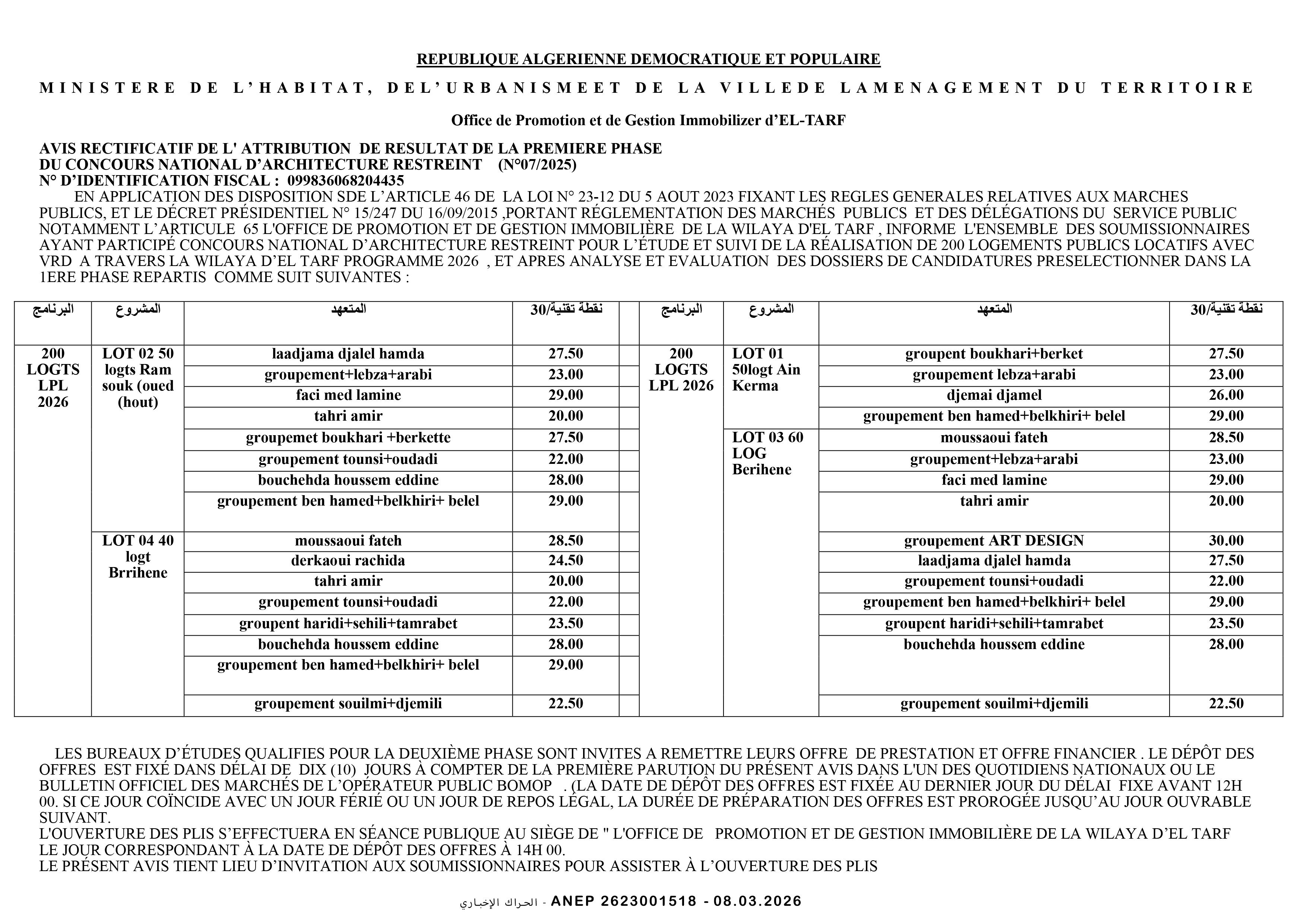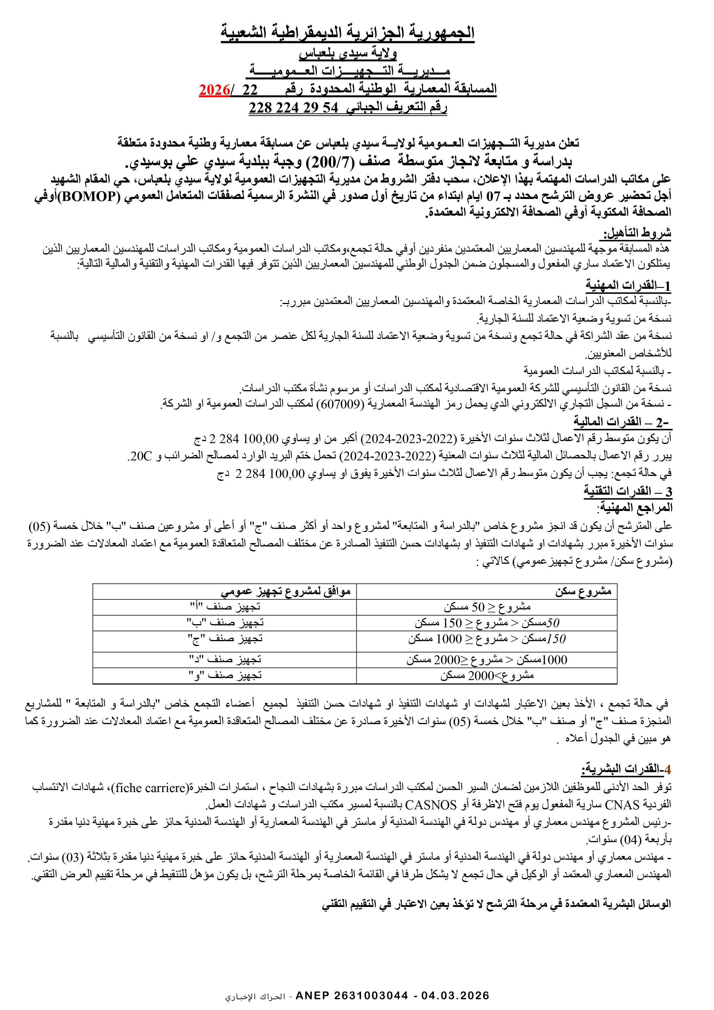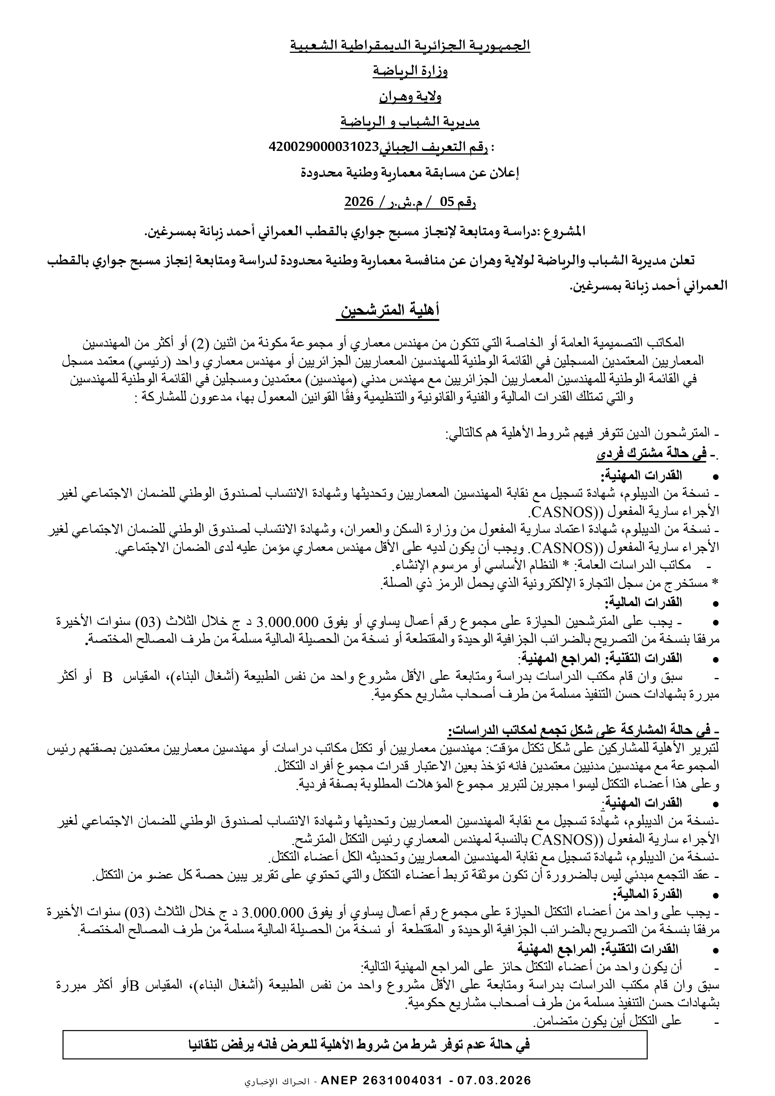 إعلان عن مسابقة وطنية محدودة