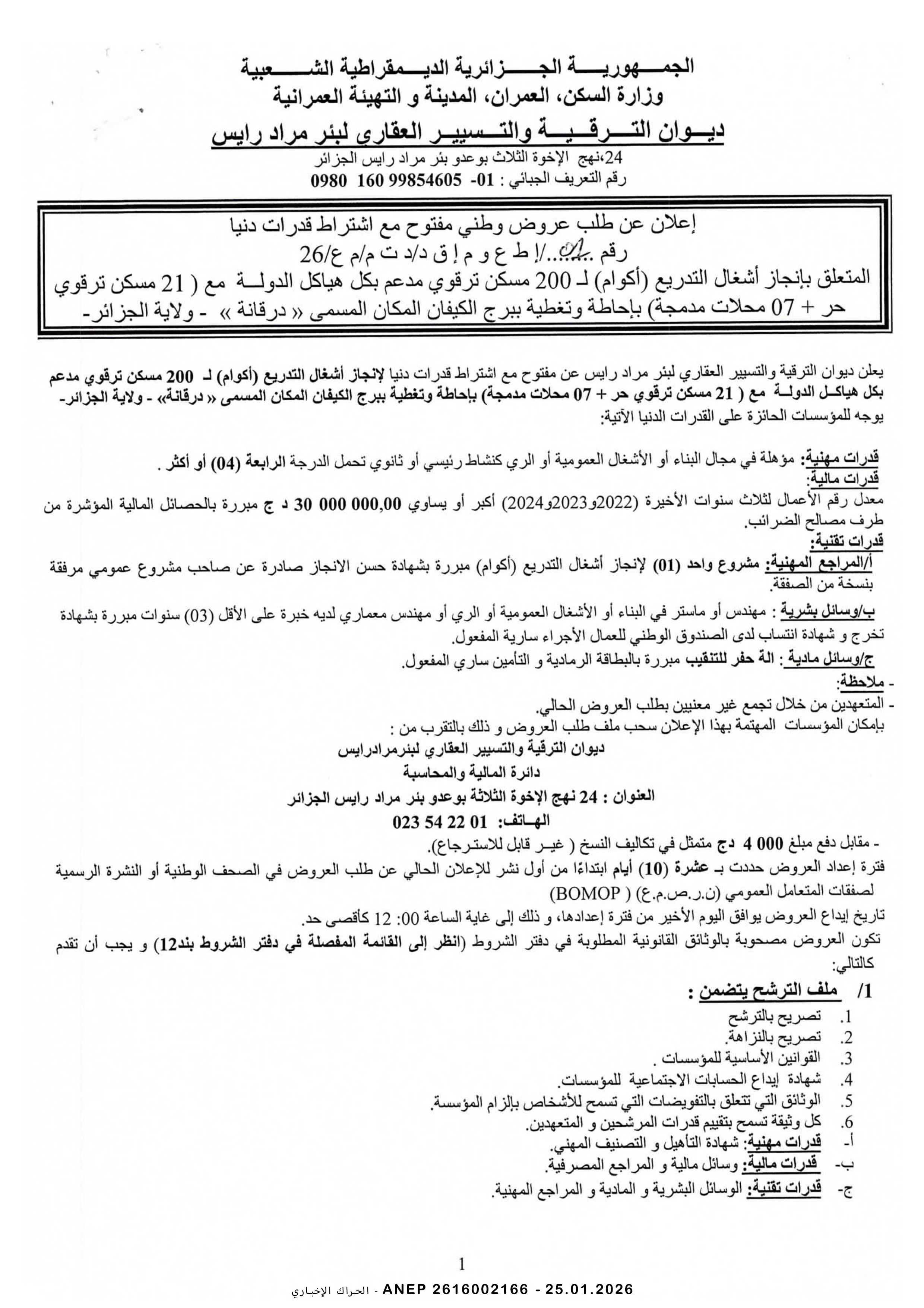 انجاز أشغال التدريع ل 200 مسكن ترقوي مدعم مع 21 مسكن ترقوى حر برج الكيفان