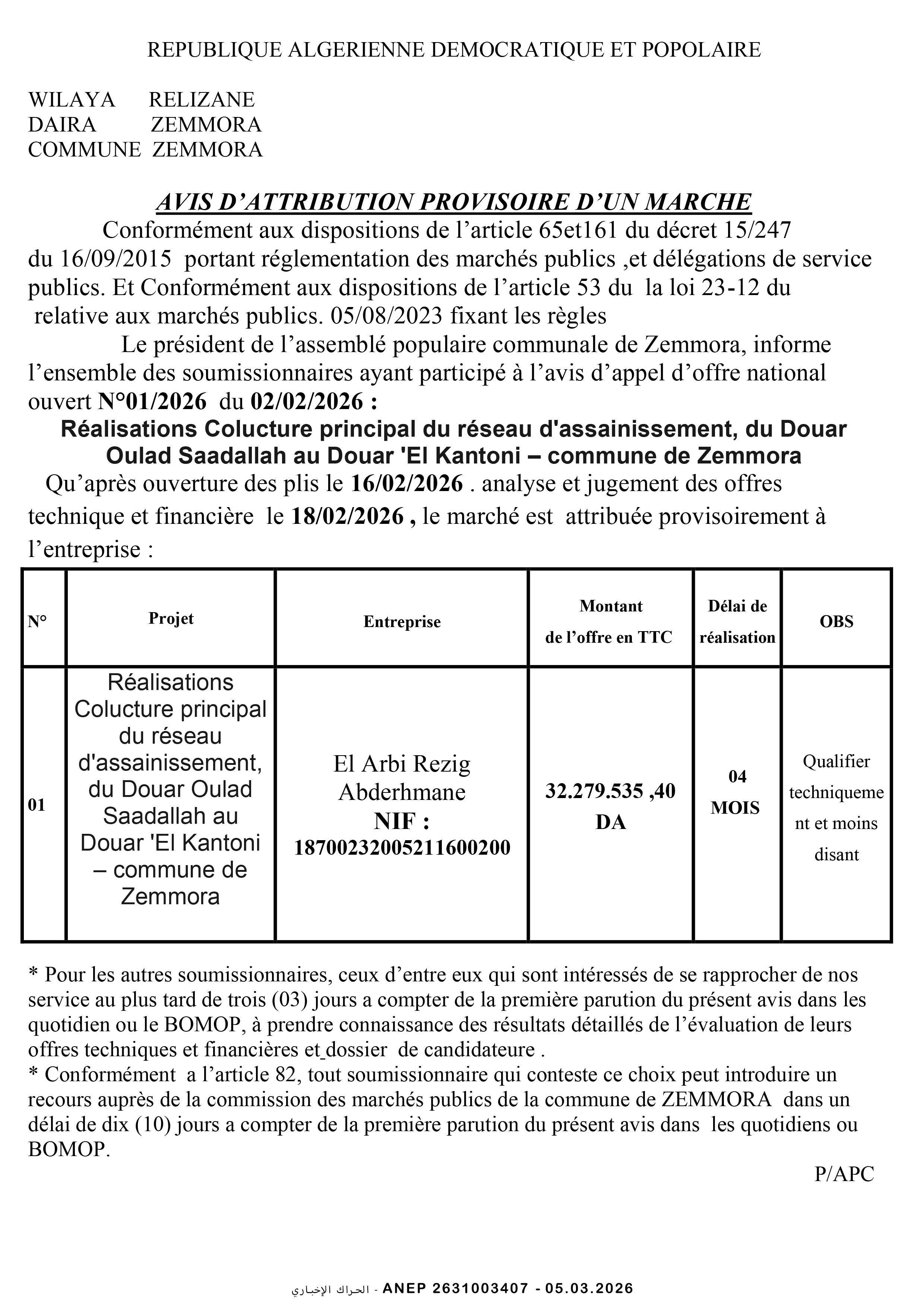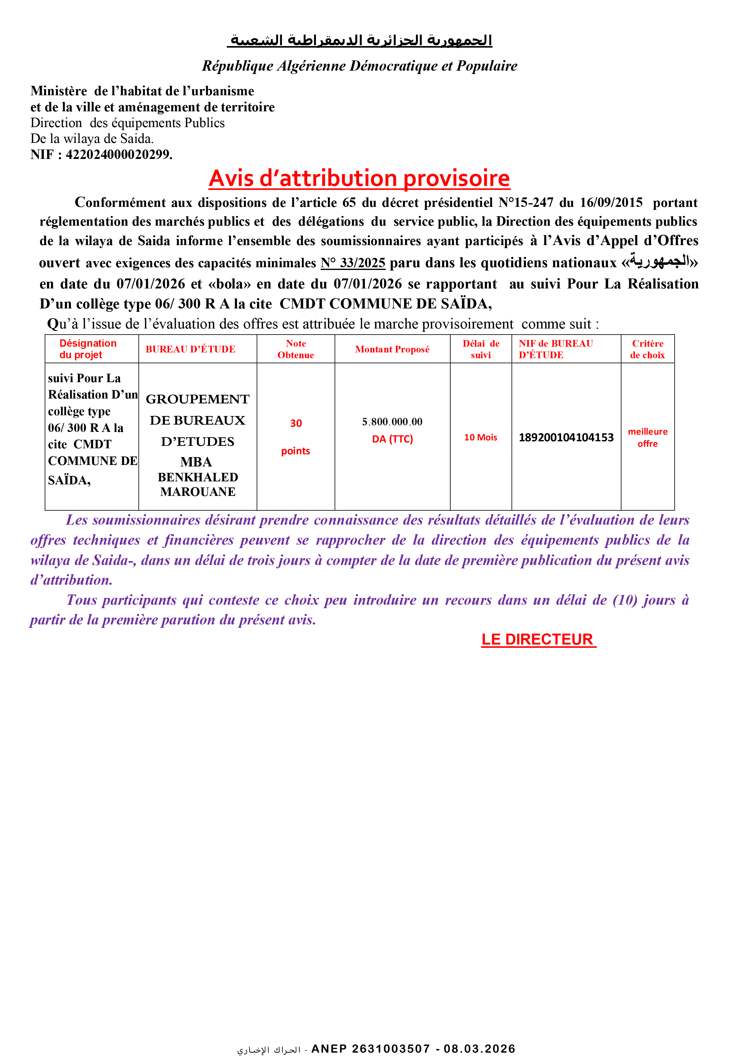 دراسة و متابعة لانجاز متوسطة صنف 200/7 وجبة بلدية سيدي علي بوسيدي