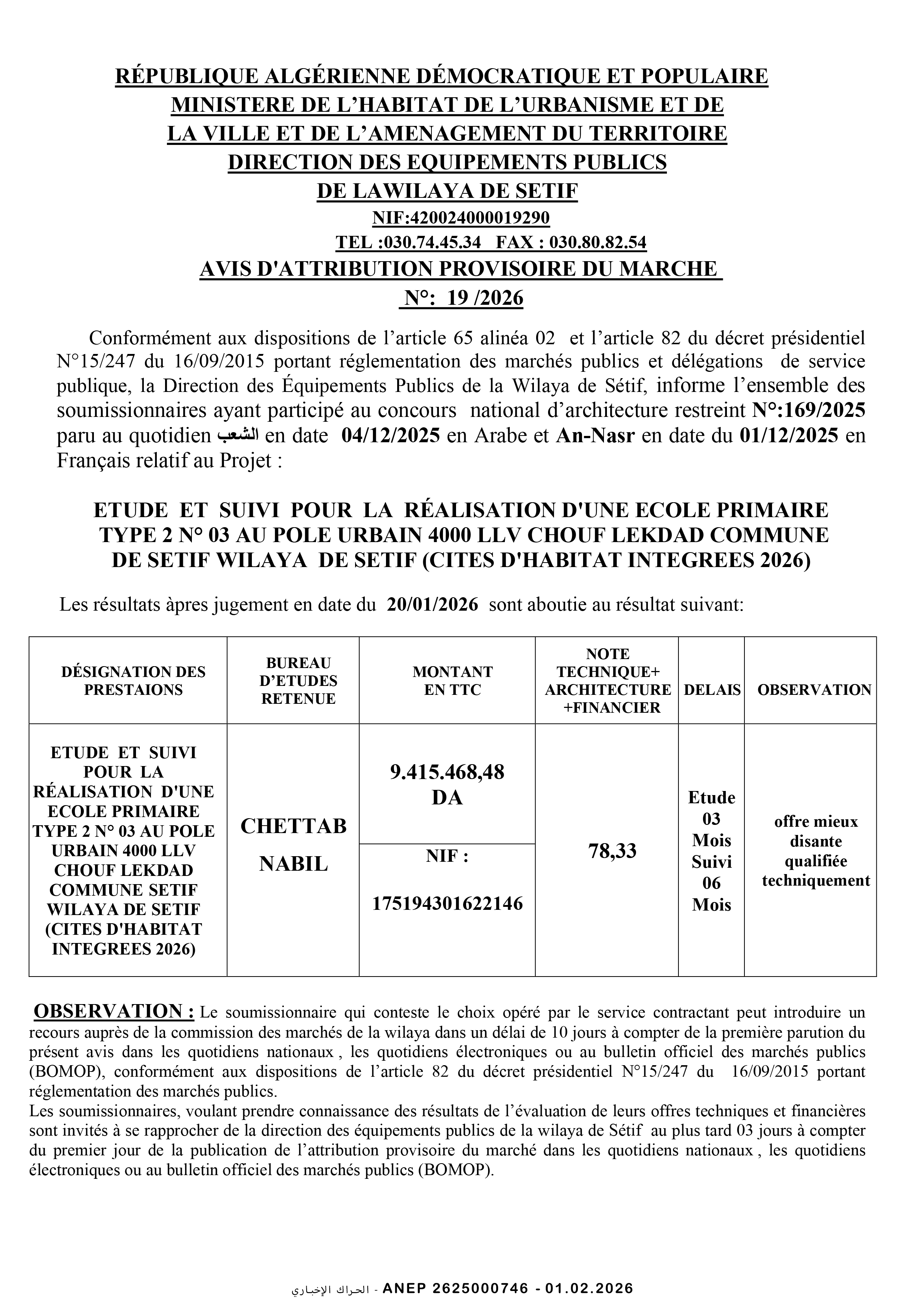 دراسة و متابعة لانجاز إبتدائية صنف 02 رقم 03 بلدية سطيف ولاية سطيف