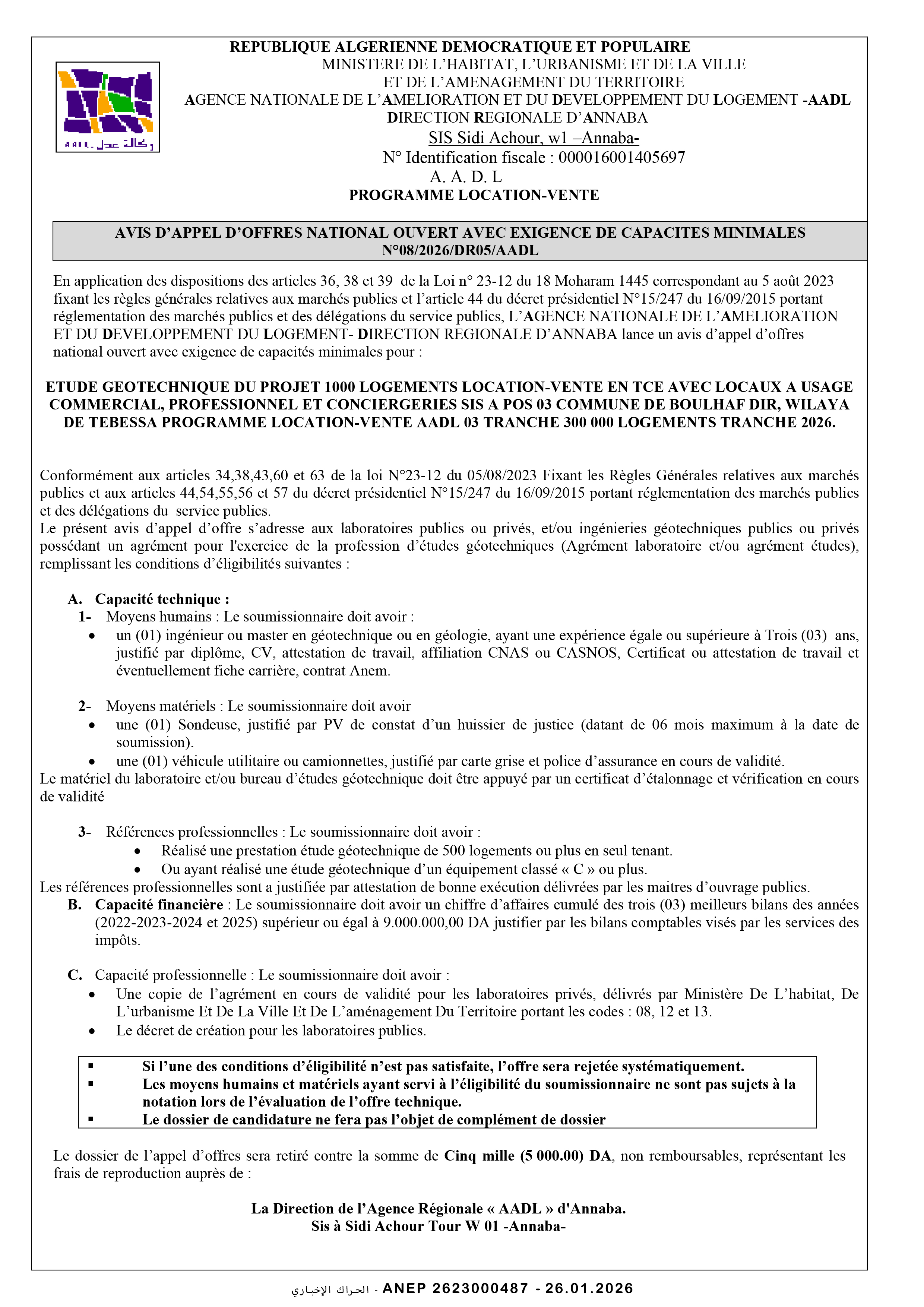 دراسة جيوتقنية ل 1000 مسكن بيع - إيجار مع محلات بلدية بولحاف الدير ولاية تبسة