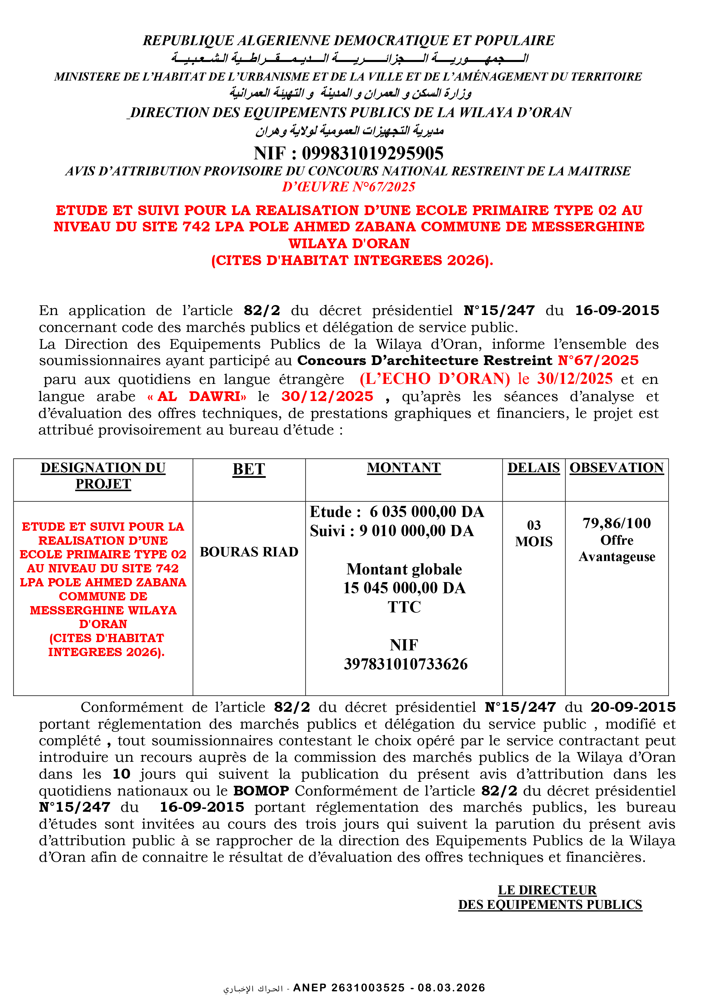 دراسة و متابعة لانجاز ابتدائية صنف 02 بلدية مسرغين - وهران
